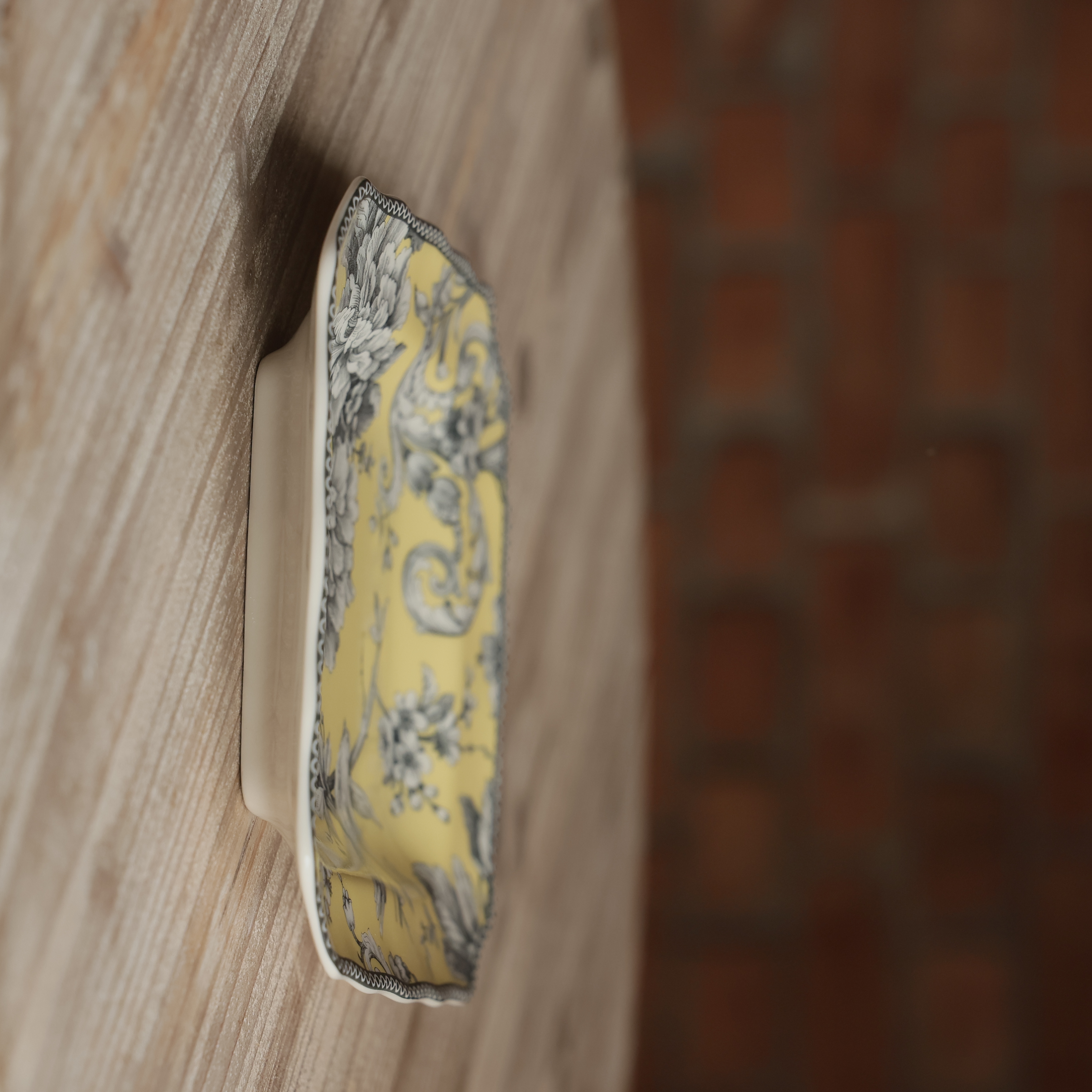 Elevate your home décor with this exquisite square ceramic plate, featuring a warm yellow background adorned with intricate black floral and bird motifs. The detailed craftsmanship highlights delicate blossoms, leaves, and a perched bird, framed by an elegant patterned border.