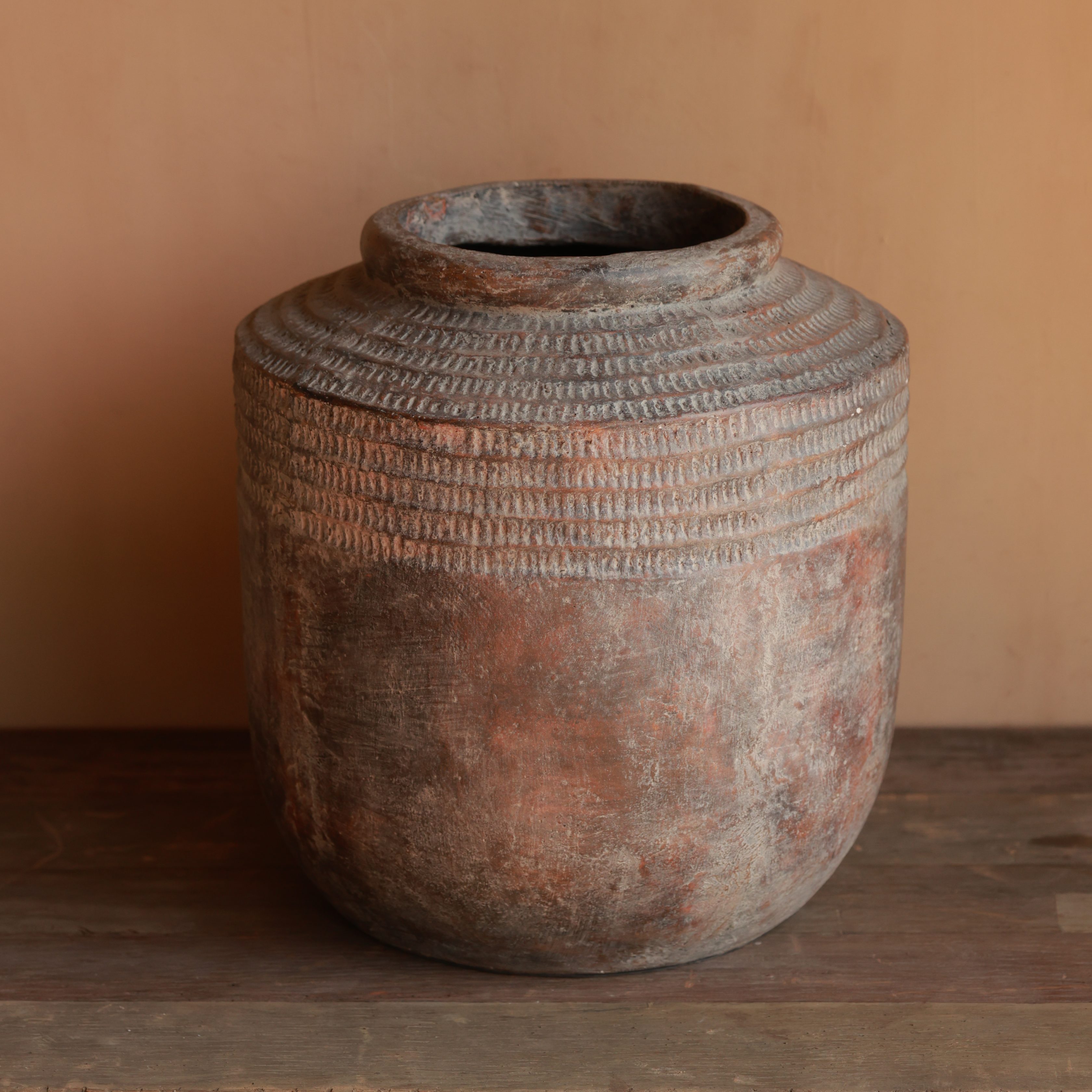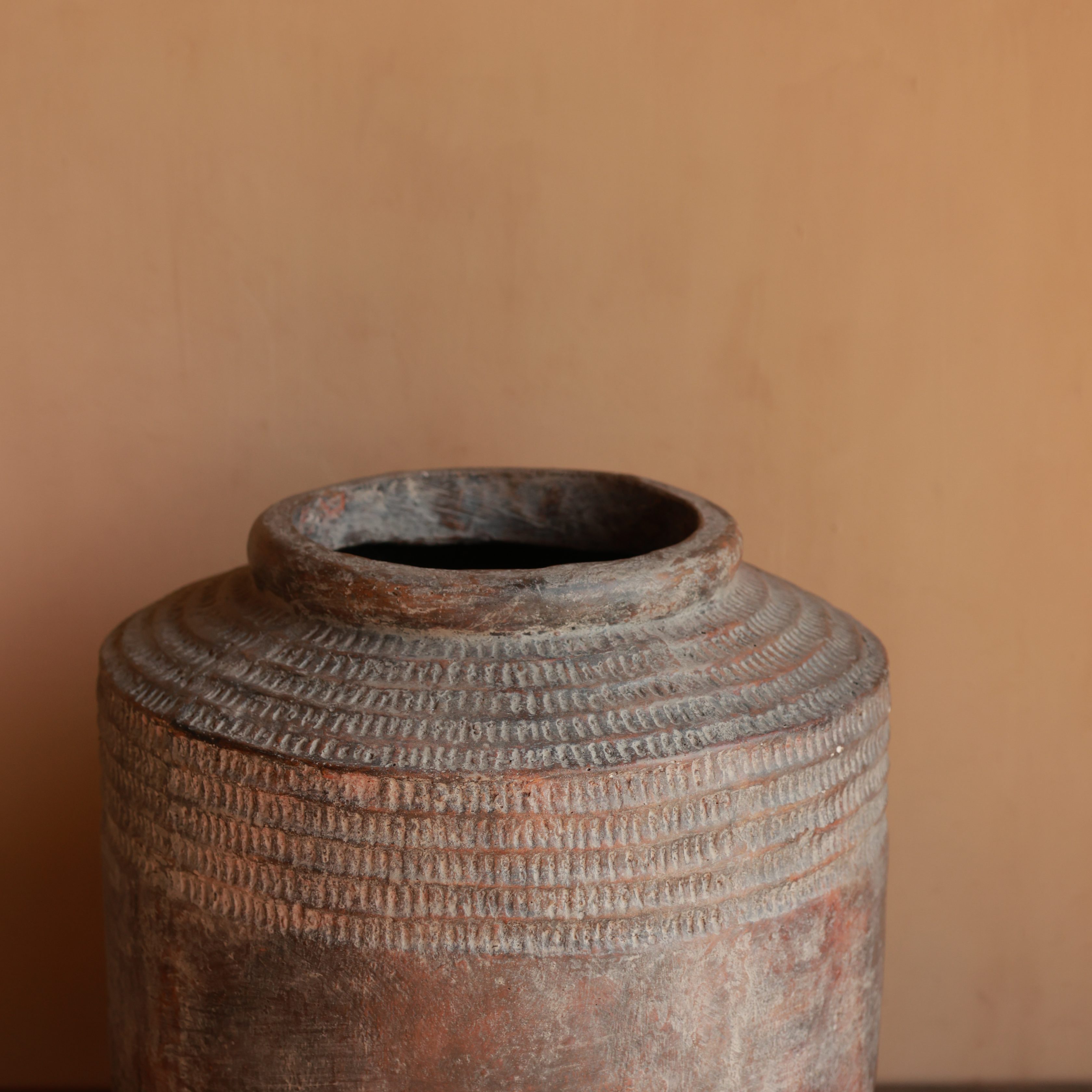 This handcrafted clay pot features intricate etched detailing on the upper half, contrasted by a raw, weathered finish. Its earthy tones and sturdy form make it a perfect statement piece for rustic or vintage-inspired spaces. Ideal for displaying dried botanicals or as a standalone accent.