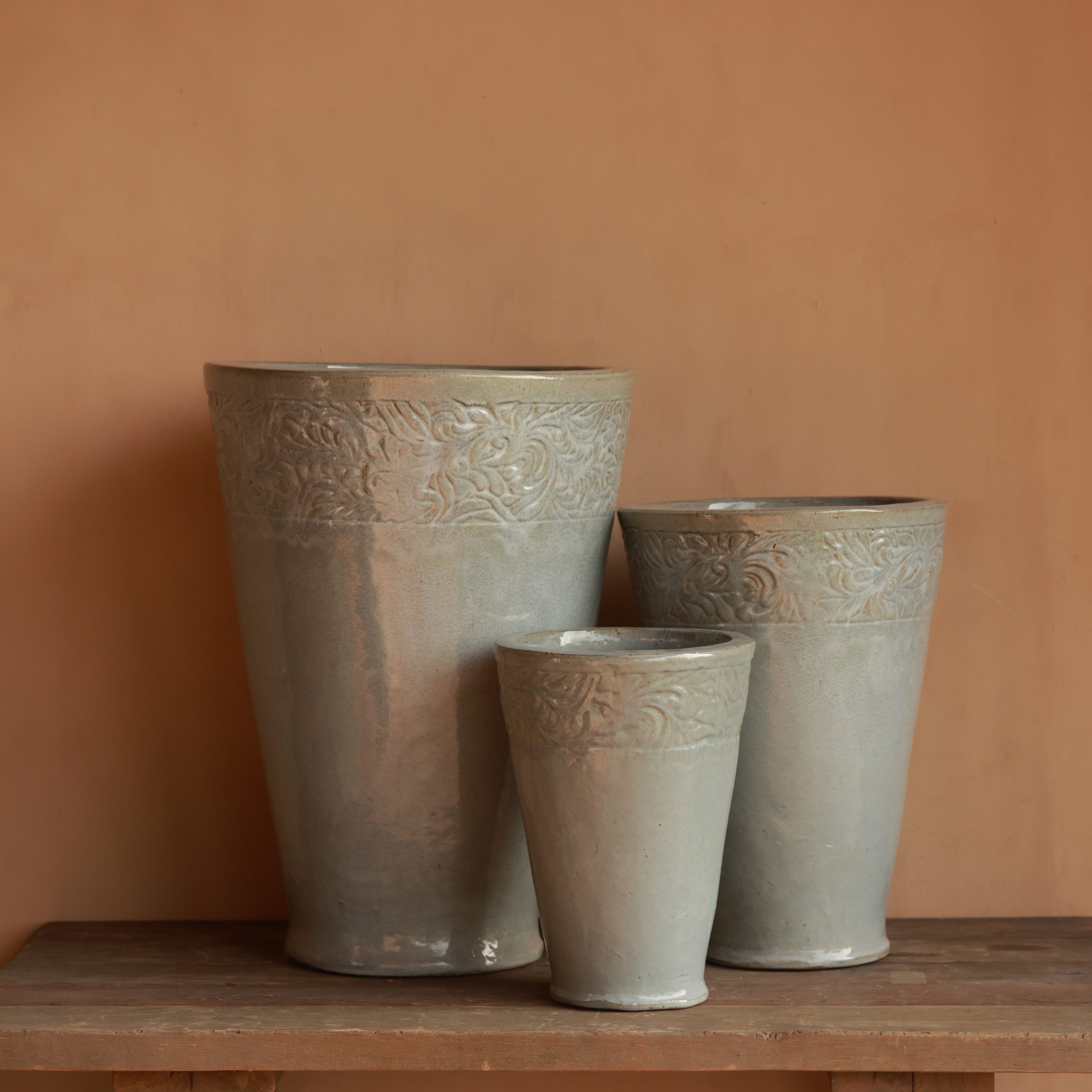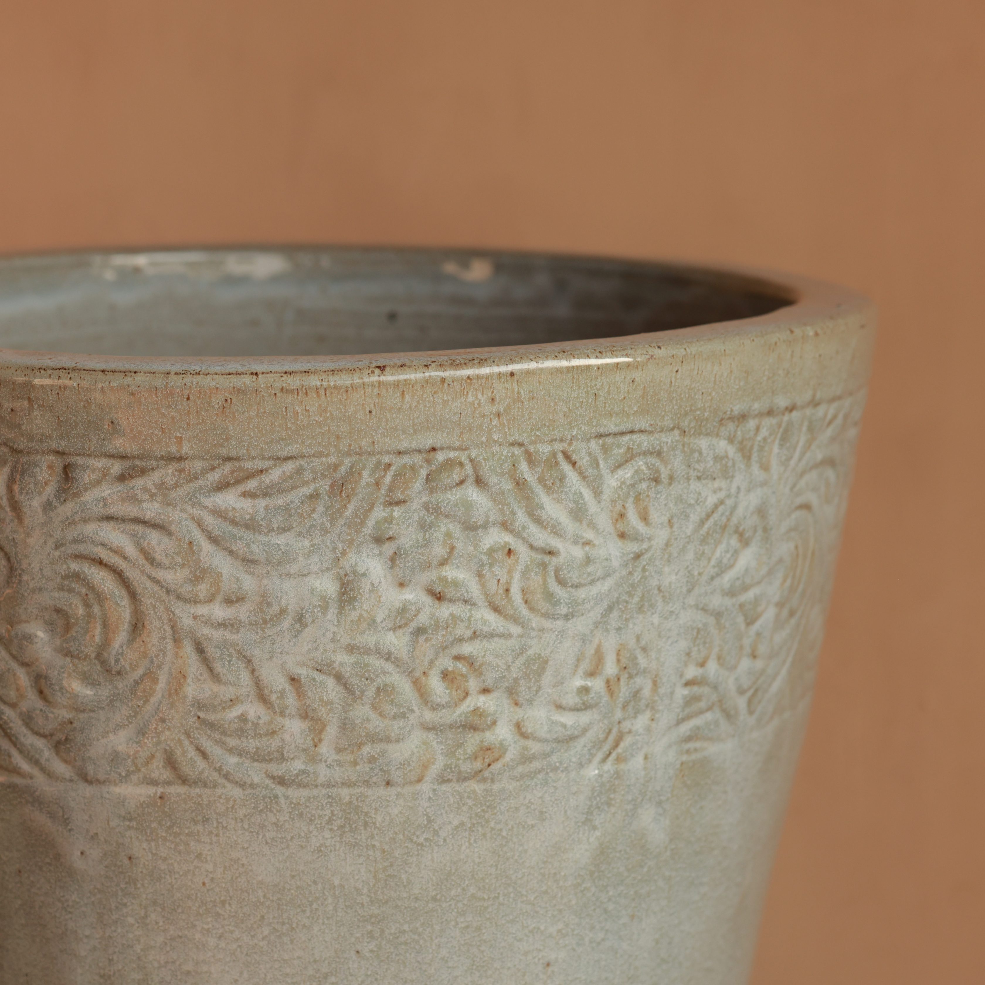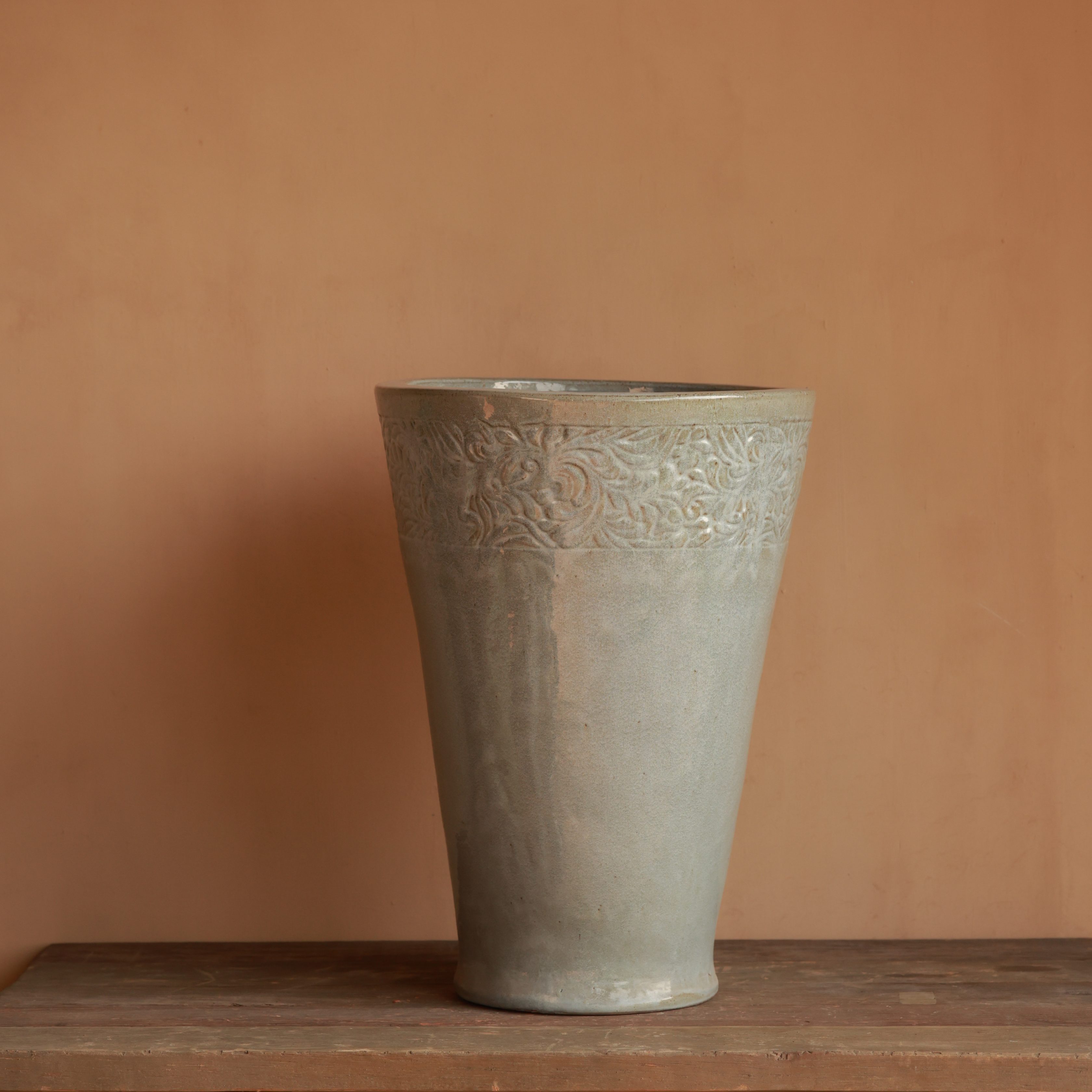 A gracefully tapered form is elevated by intricate floral relief along the rim. The neutral glaze enhances its refined yet rustic charm. Ideal for statement greenery or elegant floral arrangements.