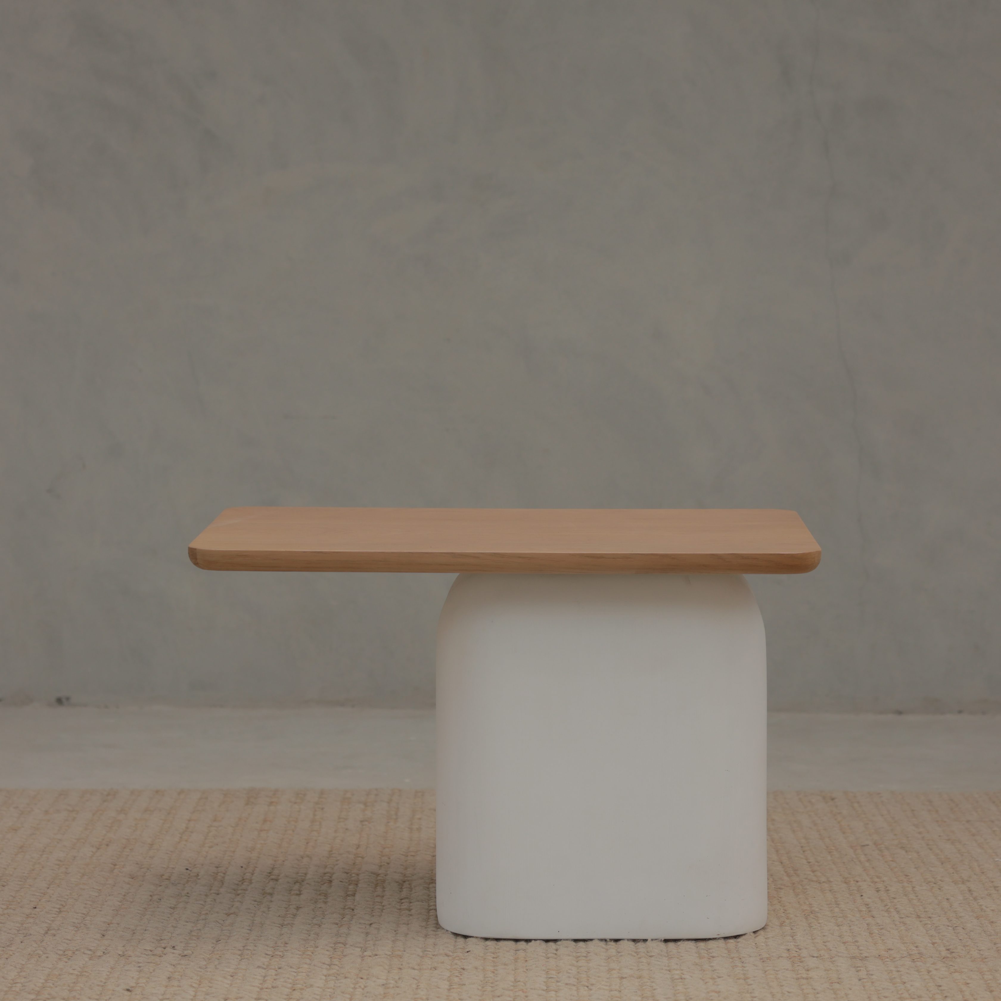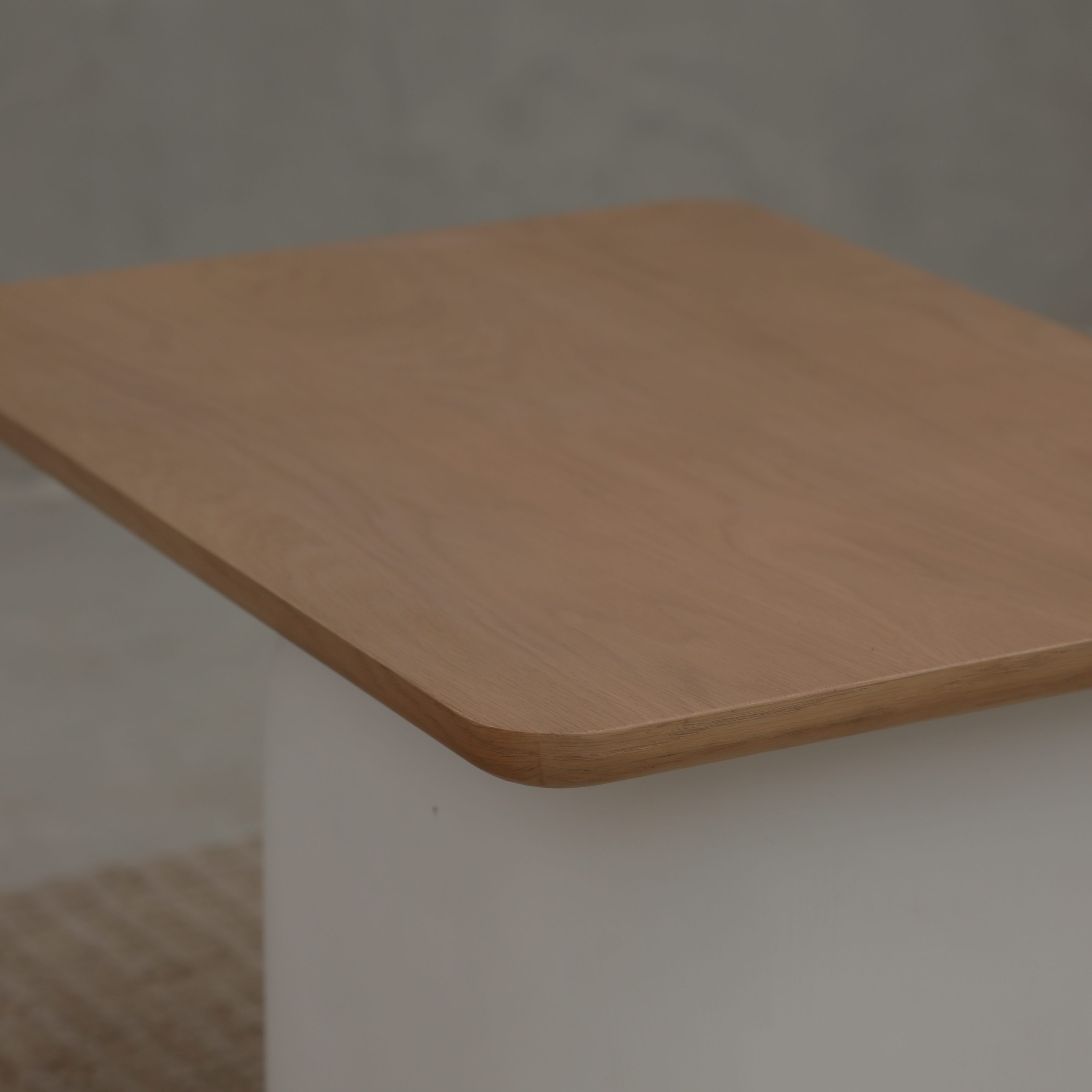 This contemporary coffee table is a statement of elegance and simplicity. Featuring a smooth, rectangular wooden tabletop with softly rounded edges, it rests on a sculptural off-white base, creating a harmonious balance between natural warmth and modern design. The sturdy yet refined structure makes it a perfect centerpiece for any living space, blending seamlessly with minimalist, Scandinavian, and modern interiors.