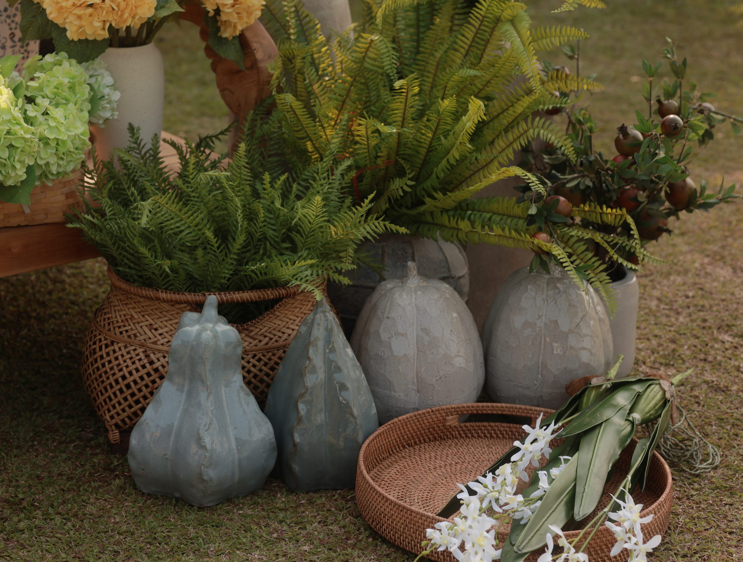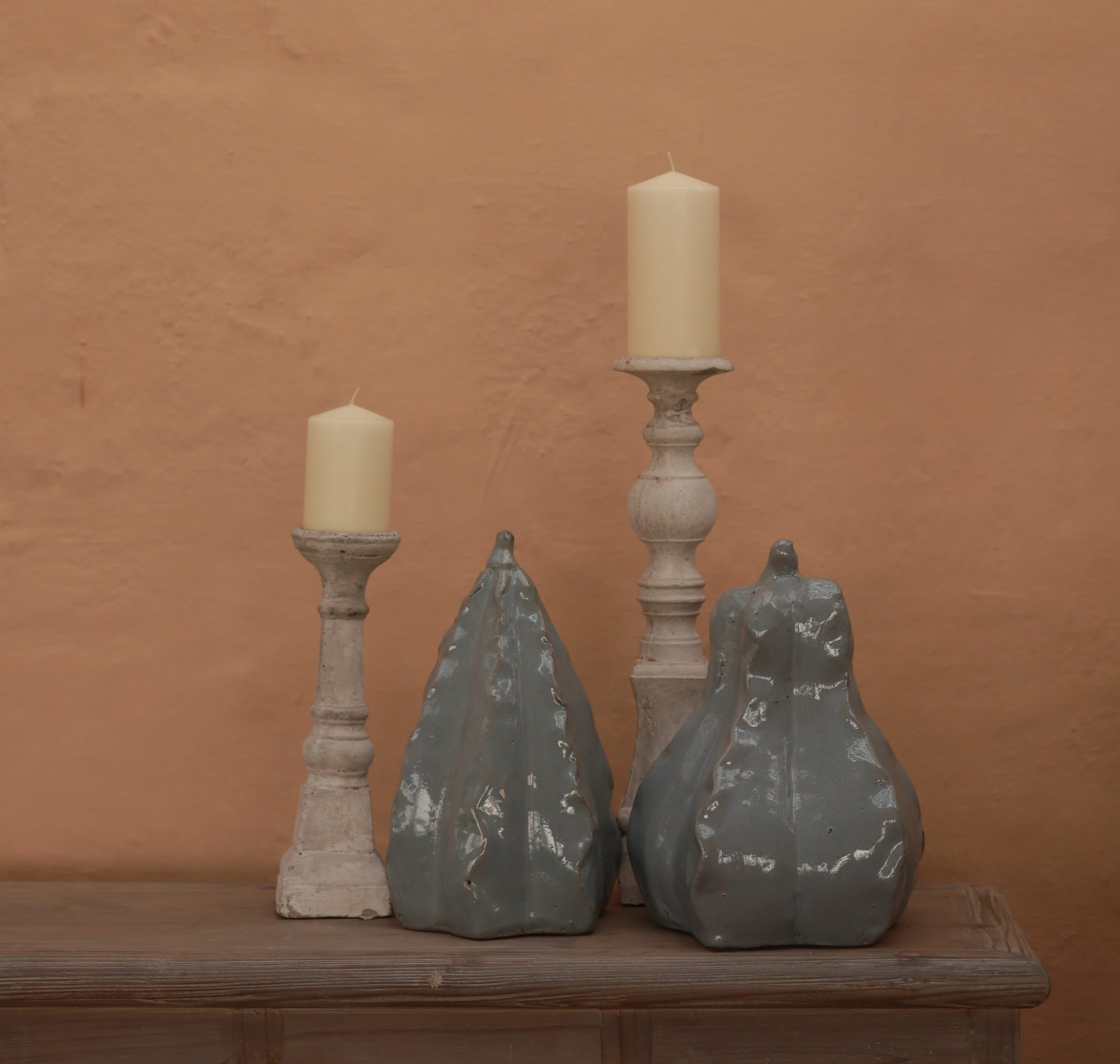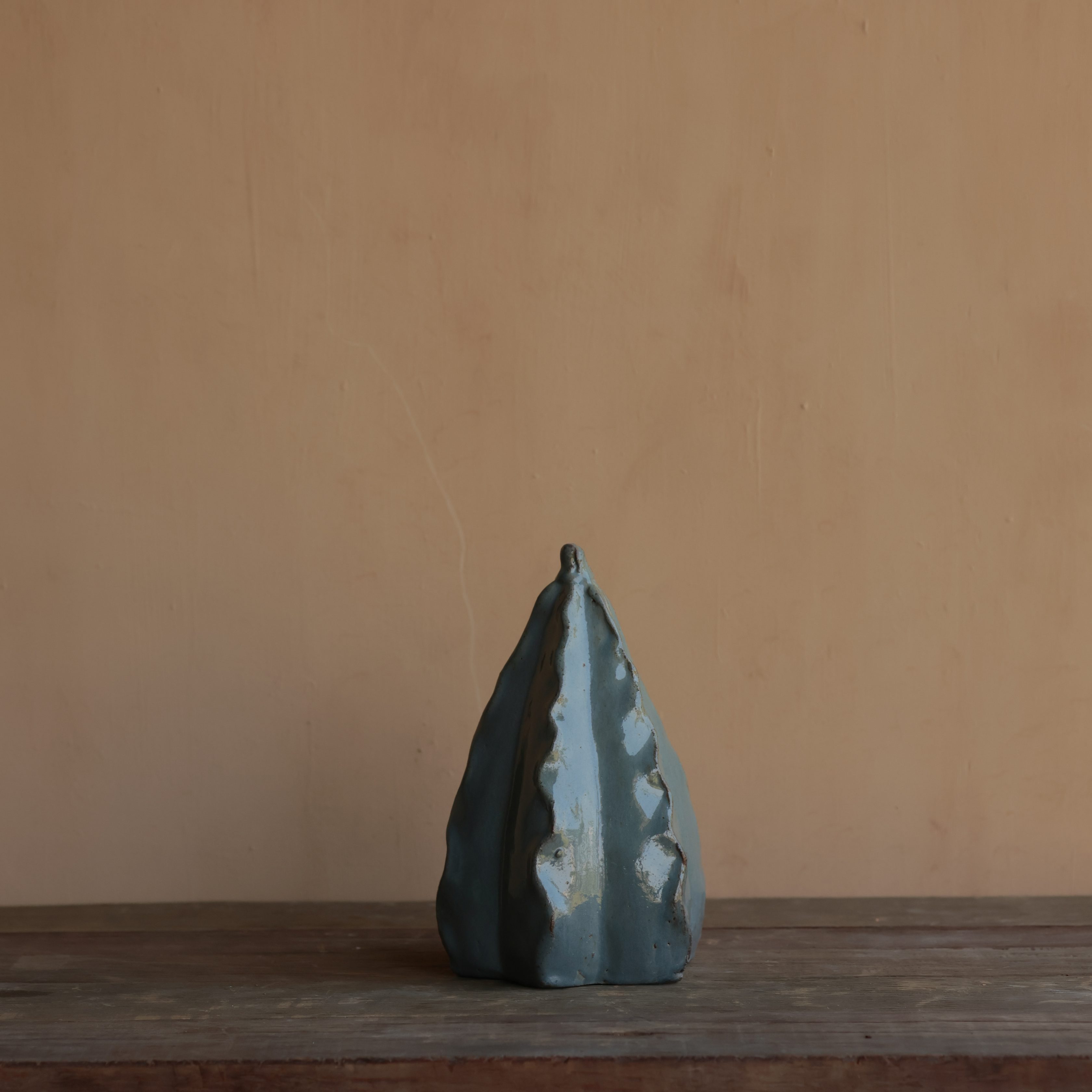 A handcrafted ceramic gourd sculpture featuring an angular form and a rustic blue glaze. The textured surface and organic shape highlight its artisanal craftsmanship, giving it a unique, earthy appeal. Subtle variations in color and finish add to its character, making it an ideal decorative piece for shelves, tables, or curated vignettes. Perfect for those who appreciate handcrafted decor with a touch of natural elegance.