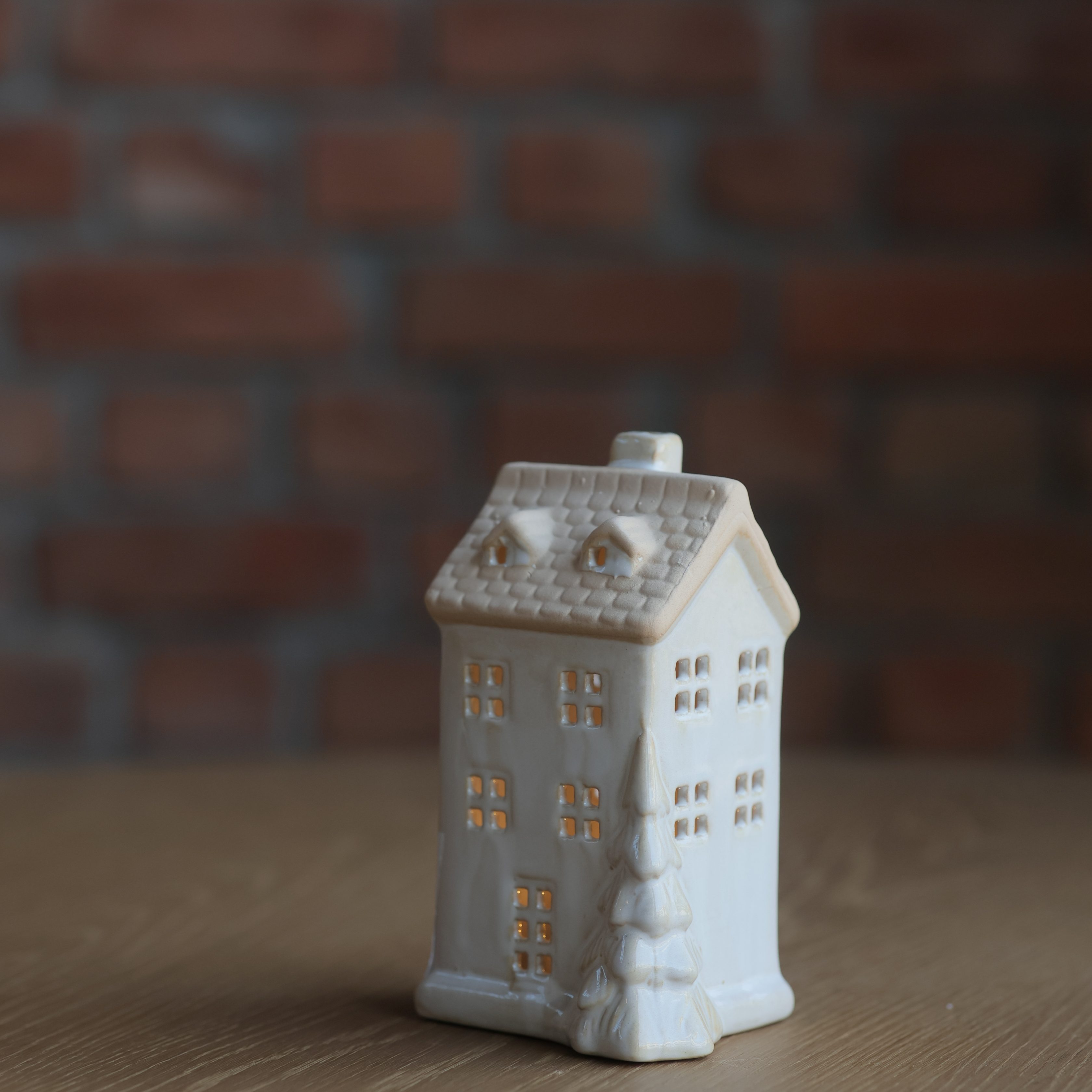 Illuminate your festive d?cor with the timeless charm of the Chapel House? a serene, snow-kissed ceramic piece that captures the spirit of a peaceful winter evening. Designed in the shape of a quaint chapel with delicate window cutouts and a frosted tree nestled at its side, this piece radiates warmth and tranquility when lit from within. The soft golden glow that shines through the windows evokes the comforting ambiance of candlelit gatherings and cozy holiday nights. Perfect for mantels, tabletops, or as part of a winter village display, the Chapel House adds a touch of ethereal beauty and calm to any corner of your home. Crafted in ivory-toned ceramic with a subtle glazed finish, its gentle sheen enhances its refined look while maintaining a rustic winter appeal. Whether displayed alone or paired with other illuminated pieces, it brings an inviting serenity to your seasonal setting.