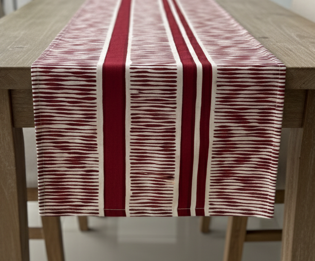 Infuse your dining space with vibrant sophistication through the Crimson Waves Runner, a stunning piece that captures the rhythm and warmth of festive elegance. With its flowing crimson red and ivory pattern, this runner evokes a sense of movement and balance, making it a captivating addition to both modern and traditional table settings. Crafted from quality fabric, the Crimson Waves Runner features a smooth, durable texture that drapes beautifully across the table. The symmetrical stripe design, reminiscent of gentle waves, adds depth and visual harmony, while the bold crimson hue radiates festive energy and refined charm. Whether styled for Christmas dinners, special celebrations, or everyday sophistication, this runner serves as a statement of artistry and style. Pair it with neutral dinnerware for an elegant contrast or complement it with deep reds, gold accents, or fresh greenery to create a perfectly coordinated seasonal look.
