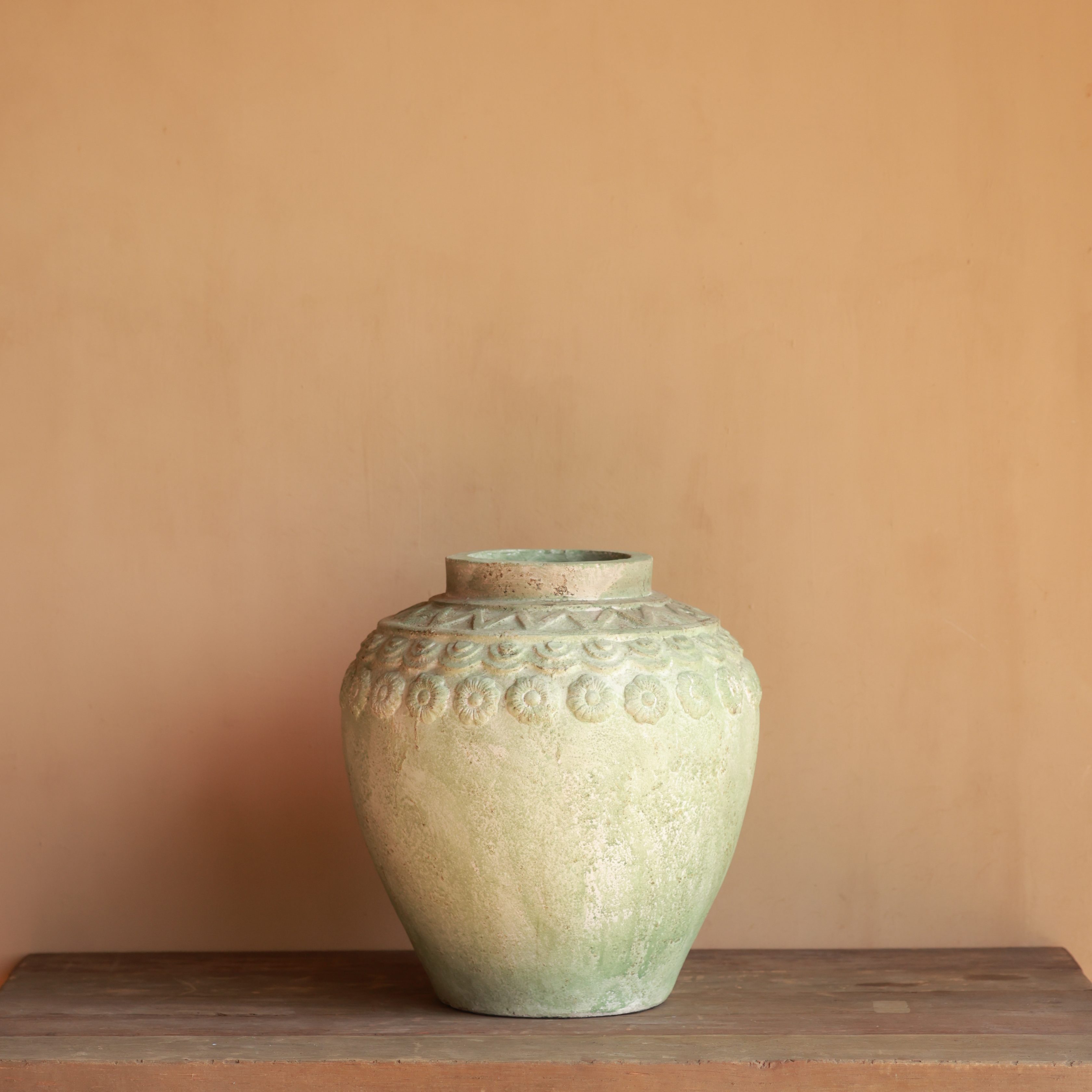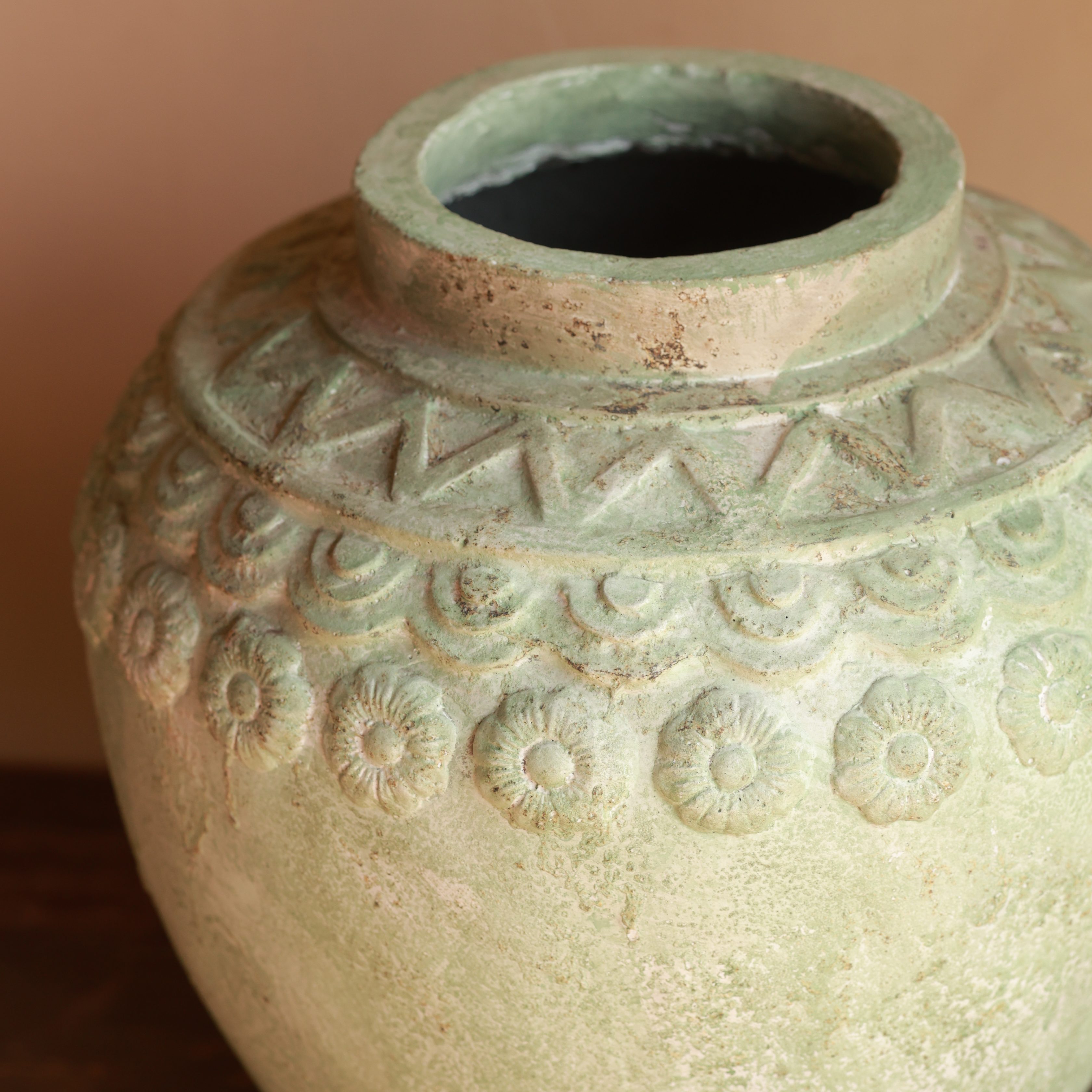 This exquisite clay pot showcases intricate floral embossing encircling its upper half, adding a delicate yet regal touch. Its soft, muted green patina gives it a weathered, antique feel, perfect for elevating any space with a vintage charm. The broad, rounded body and short neck make it a striking standalone décor piece or a beautiful vessel for dried arrangements. Ideal for interiors that embrace classic, Mediterranean, or rustic aesthetics