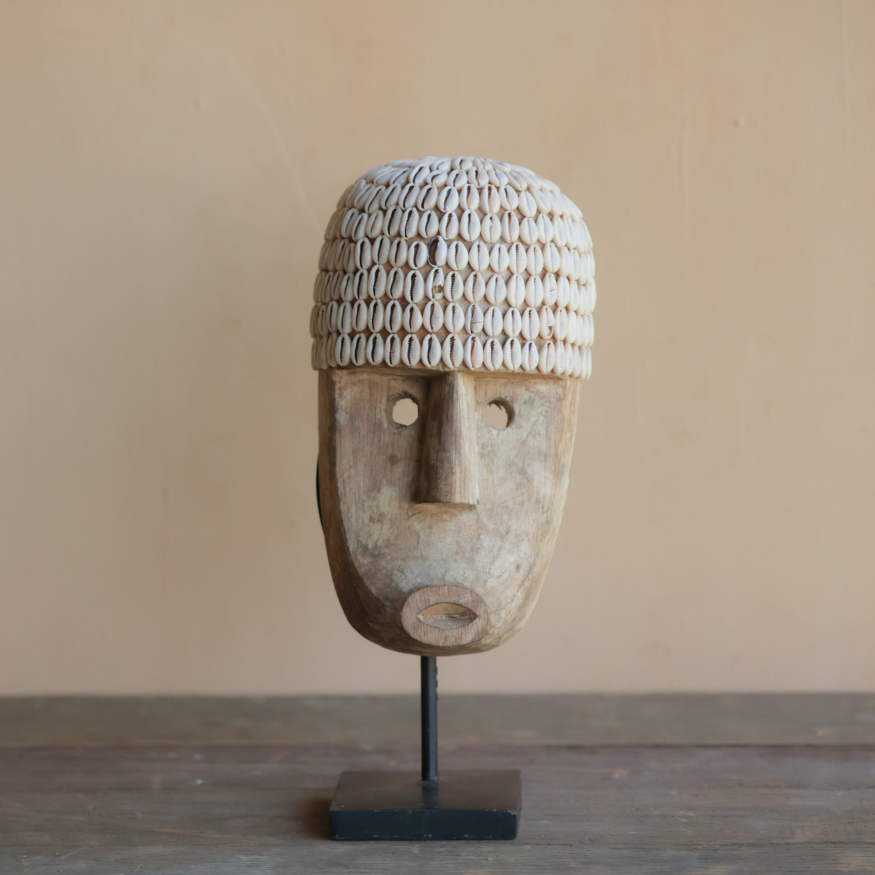 Enhance your space with this exquisite handcrafted wooden tribal mask, a stunning blend of traditional artistry and cultural heritage. Each mask is meticulously carved from high-quality wood, showcasing an elongated facial design with a weathered finish that adds a rustic charm. The standout feature is the intricate cowrie shell headpiece, carefully arranged to create a textured, elegant look that reflects indigenous craftsmanship.Mounted on a sturdy black metal stand, this mask serves as a striking decorative piece for homes, offices, galleries, or cultural collections. Perfect for lovers of tribal art, bohemian décor, or those seeking a unique statement piece with historical significance.