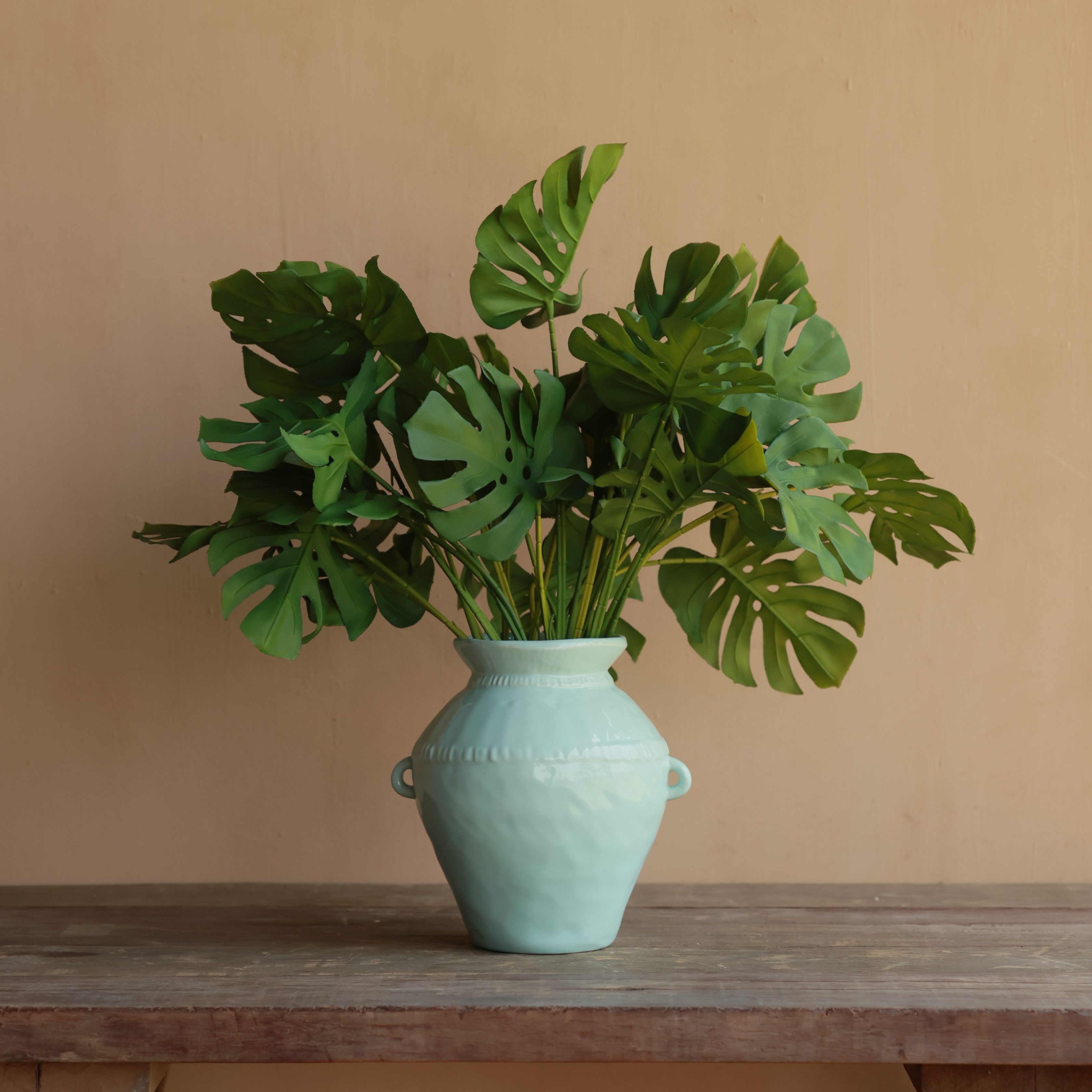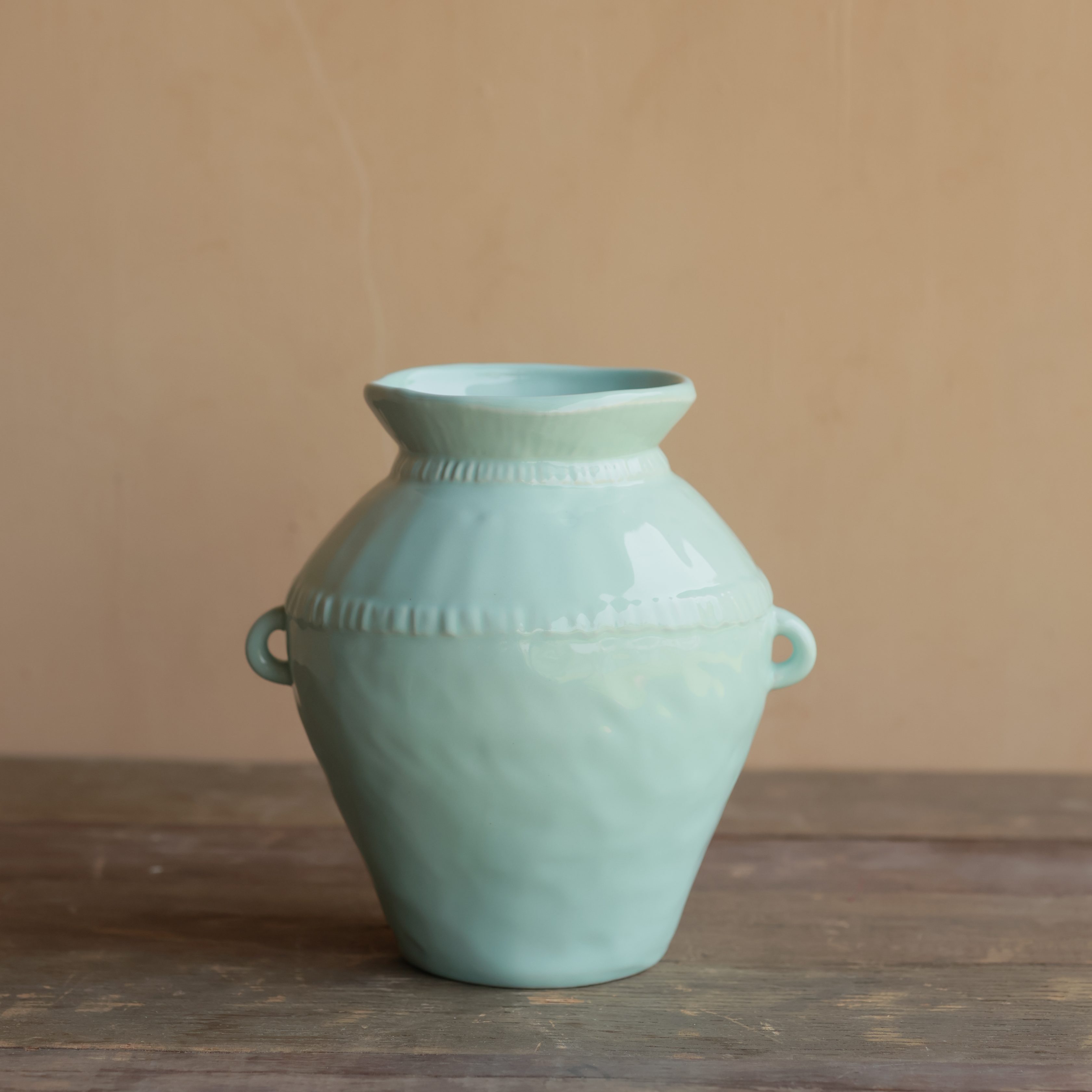 This exquisite ceramic vase boasts a soft, muted mint-green hue that exudes elegance and tranquility. Its gently textured surface and subtle decorative ridges add depth and character to its classic silhouette. Two delicate side handles provide a charming touch, enhancing its artisanal appeal.