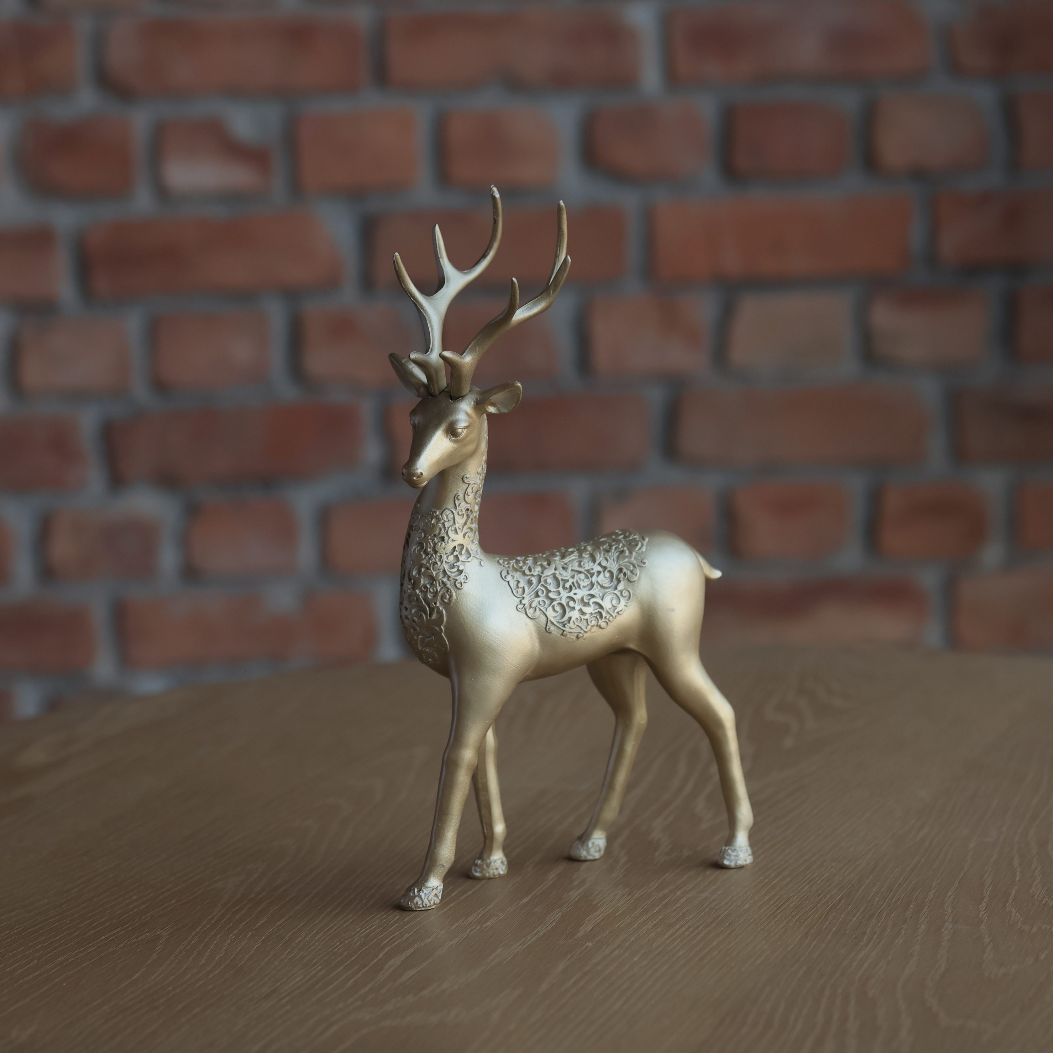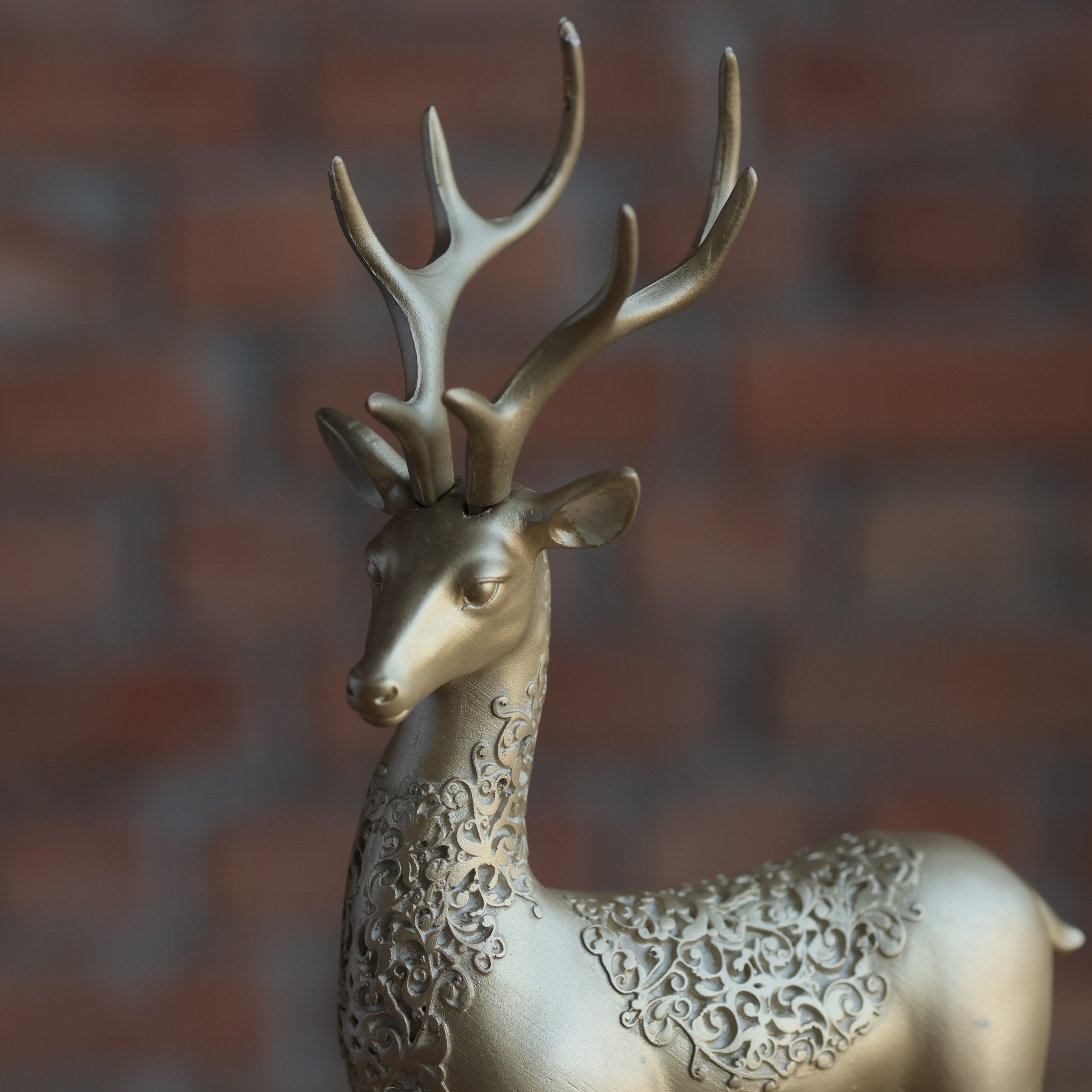 The Golden Reindeer Figurine Big stands as a true emblem of holiday splendour and sophistication. Designed with exquisite craftsmanship, this stately piece features a sleek golden finish accented with intricate detailing along the neck and back, creating a luxurious texture that catches the light beautifully. It adds a commanding yet refined touch to any festive display. Perfect for creating an elegant Christmas centerpiece or enhancing your mantel, console, or sideboard decor, this reindeer brings a regal sense of celebration to your home. Pair it with the smaller version of the Golden Reindeer for a harmonious duo display, or let it stand alone as a statement of festive poise and luxury. The timeless gold tone and graceful stance allow this figurine to blend seamlessly into both modern and classic holiday themes, making it an essential piece for anyone who values refined seasonal styling.