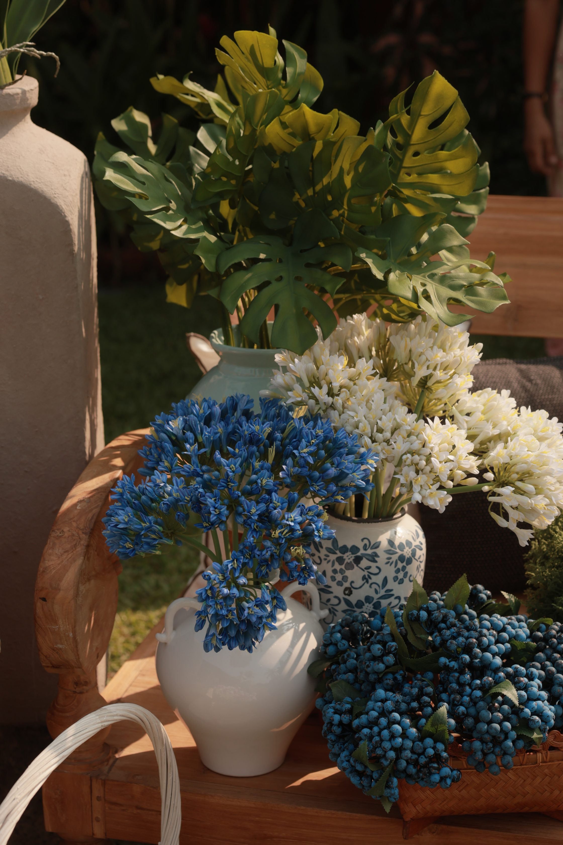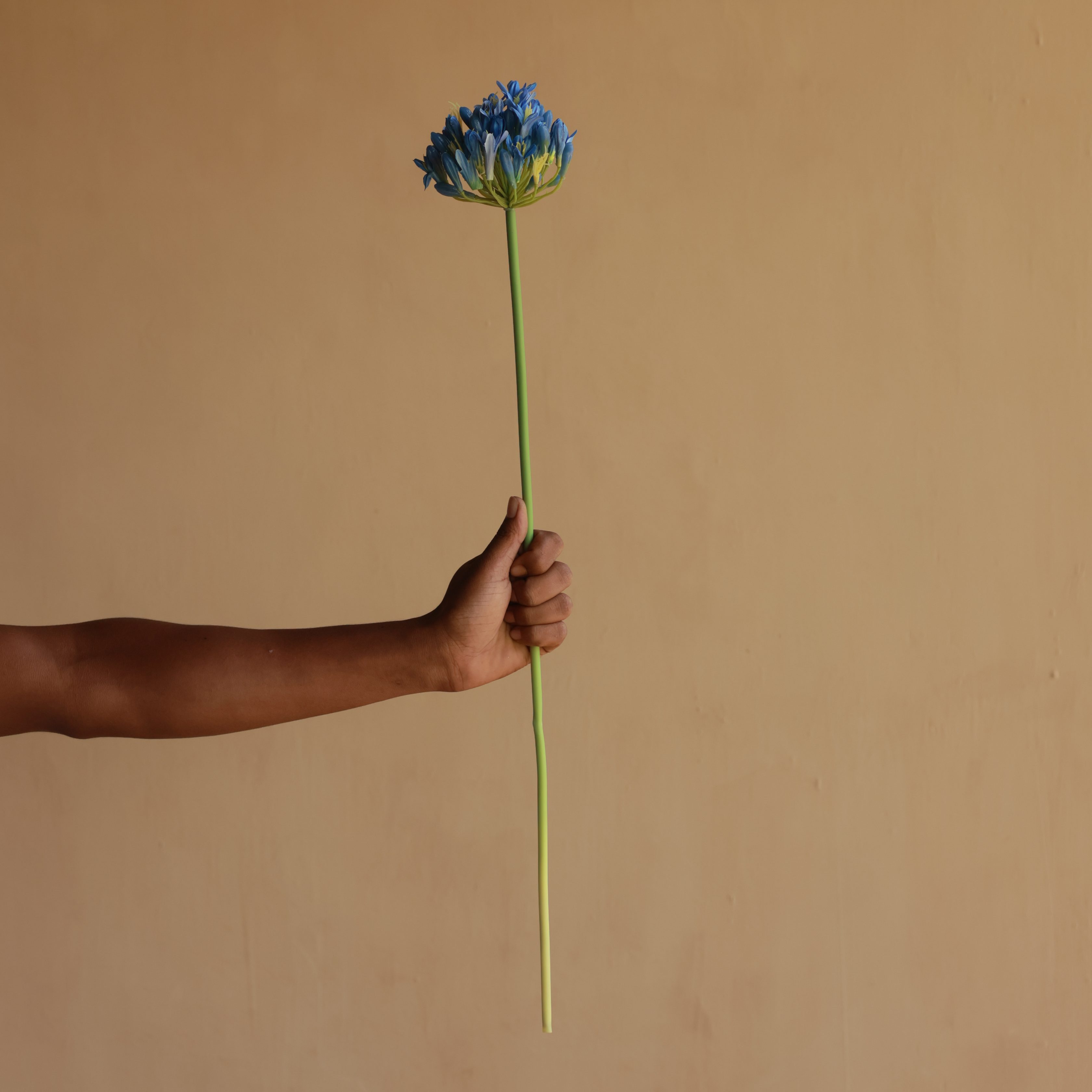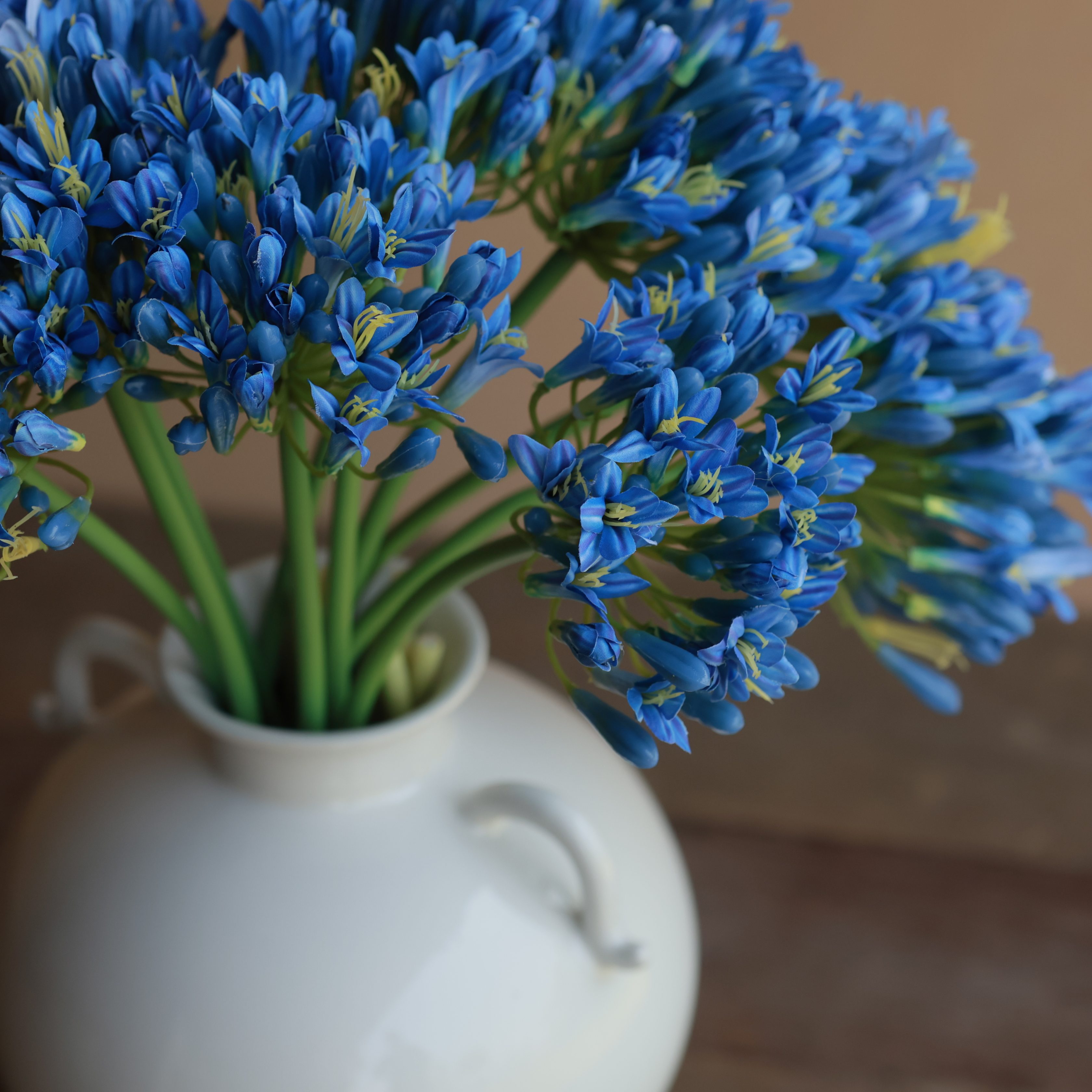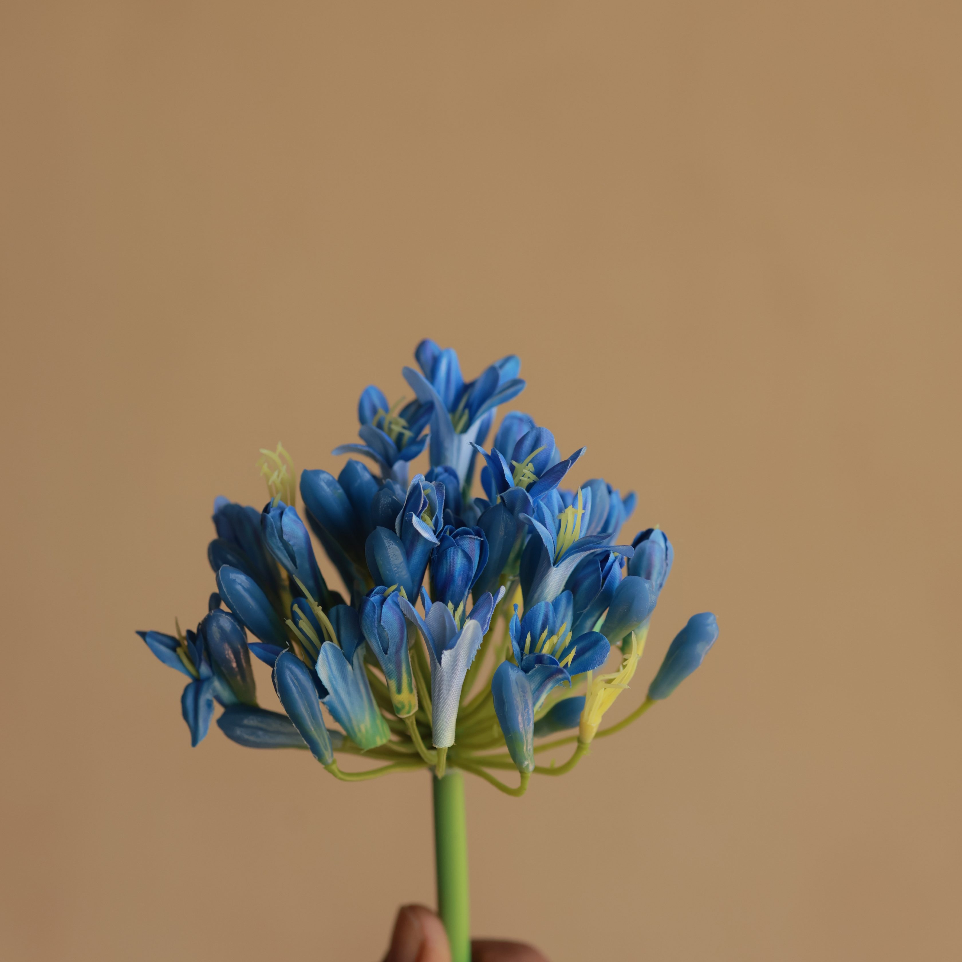 Elevate your home or event decor with this stunning artificial blue Agapanthus stem. Featuring a lush cluster of delicate blue petals atop a tall, lifelike green stem, this flower adds a touch of grace and sophistication to any setting.