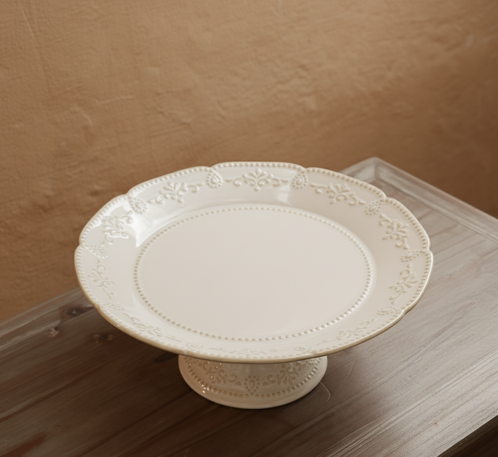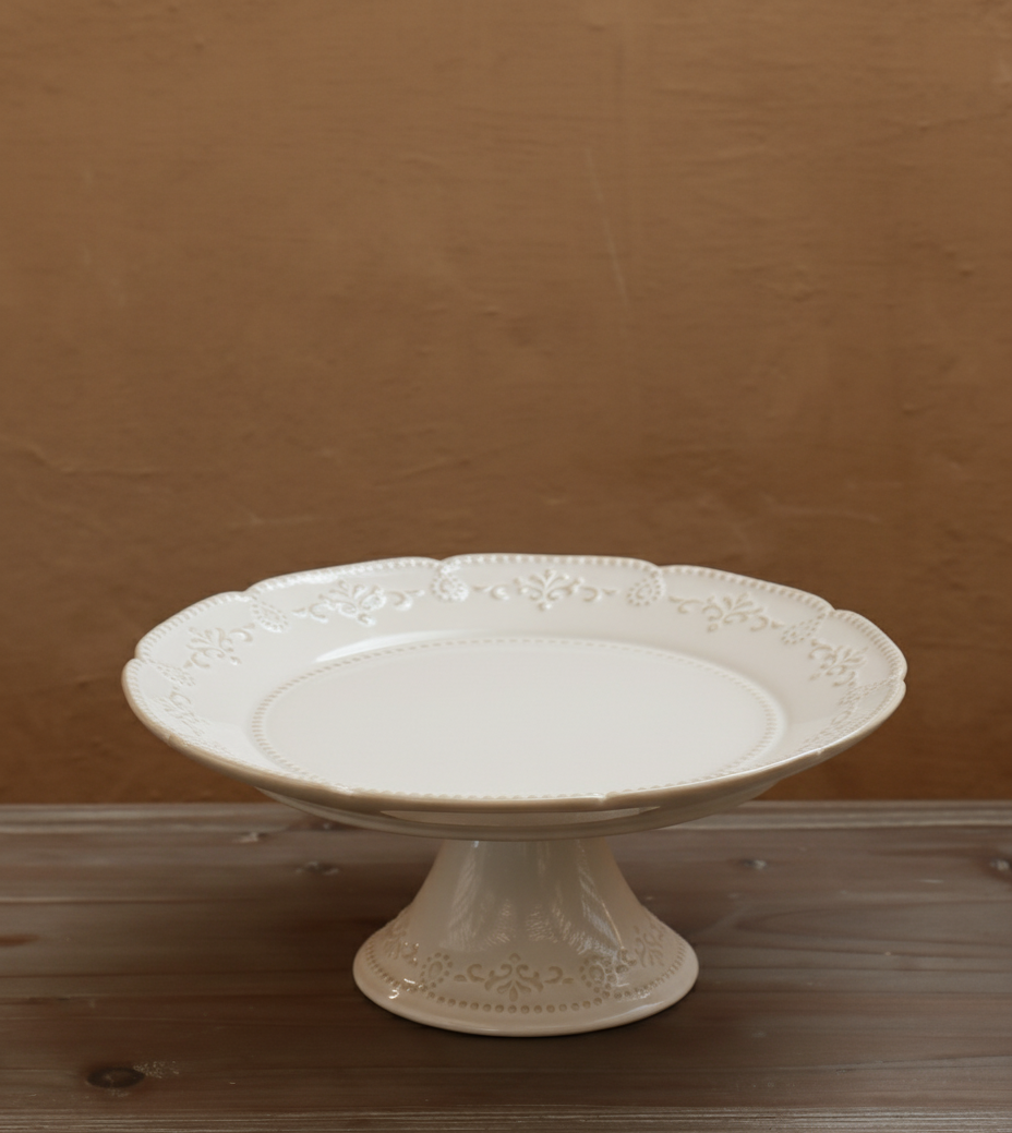 Grace your gatherings with the romantic charm of the Heirloom Lace Cake Stand, a beautifully crafted piece that combines sophistication with nostalgic allure. Designed in a milky white ceramic finish, this stand features an intricately embossed lace border that gently frames its scalloped edges reminiscent of vintage heirloom serveware passed down through generations. Its sturdy pedestal base provides both balance and height, creating a striking display for cakes, pastries, or seasonal arrangements. The smooth glazed surface ensures easy cleaning while highlighting the subtle texture and craftsmanship of the piece. Perfect for weddings, tea parties, or elegant home decor displays, the Heirloom Lace Cake Stand adds a sense of occasion to every moment. Whether used as a serving piece or a statement decor element on a console or dining table, it exudes grace and refinement making it a must-have for those who appreciate timeless beauty.
