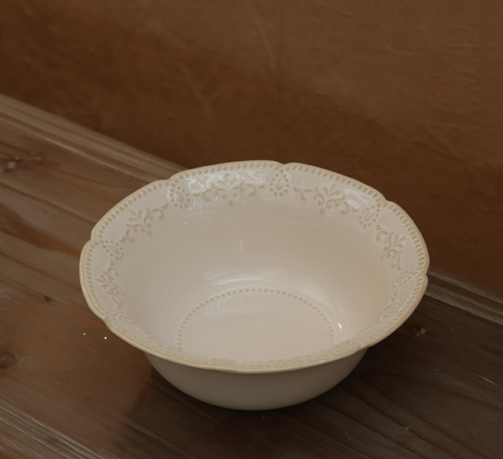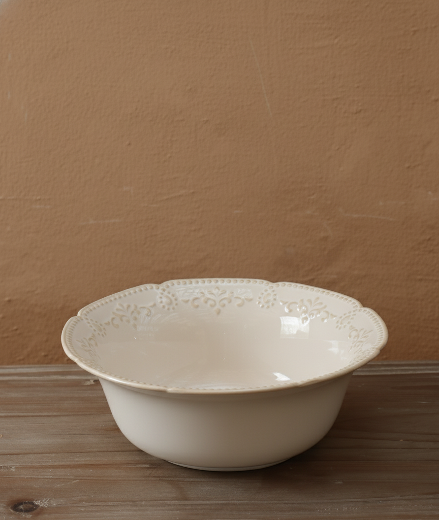 Elevate your dining presentation with the Heirloom Lace Serving Bowl, a stunning blend of artistry and elegance inspired by classic European tableware. Crafted from glazed ceramic, this bowl features a delicate lace-embossed rim with gentle scalloped edges, creating a soft and romantic aesthetic that instantly enhances any tablescape. The milky white finish and smooth interior lend an air of purity and grace, making it the perfect vessel for both everyday meals and celebratory feasts. Generously sized to serve salads, pastas, fruits, or side dishes, it combines beauty with functionality, offering versatility that suits both traditional and contemporary d?cor styles. Whether displayed as part of a coordinated set from the Heirloom Lace Collection or used as a standalone accent piece, this serving bowl adds an heirloom-quality touch to every occasion, making it as timeless as it is elegant.