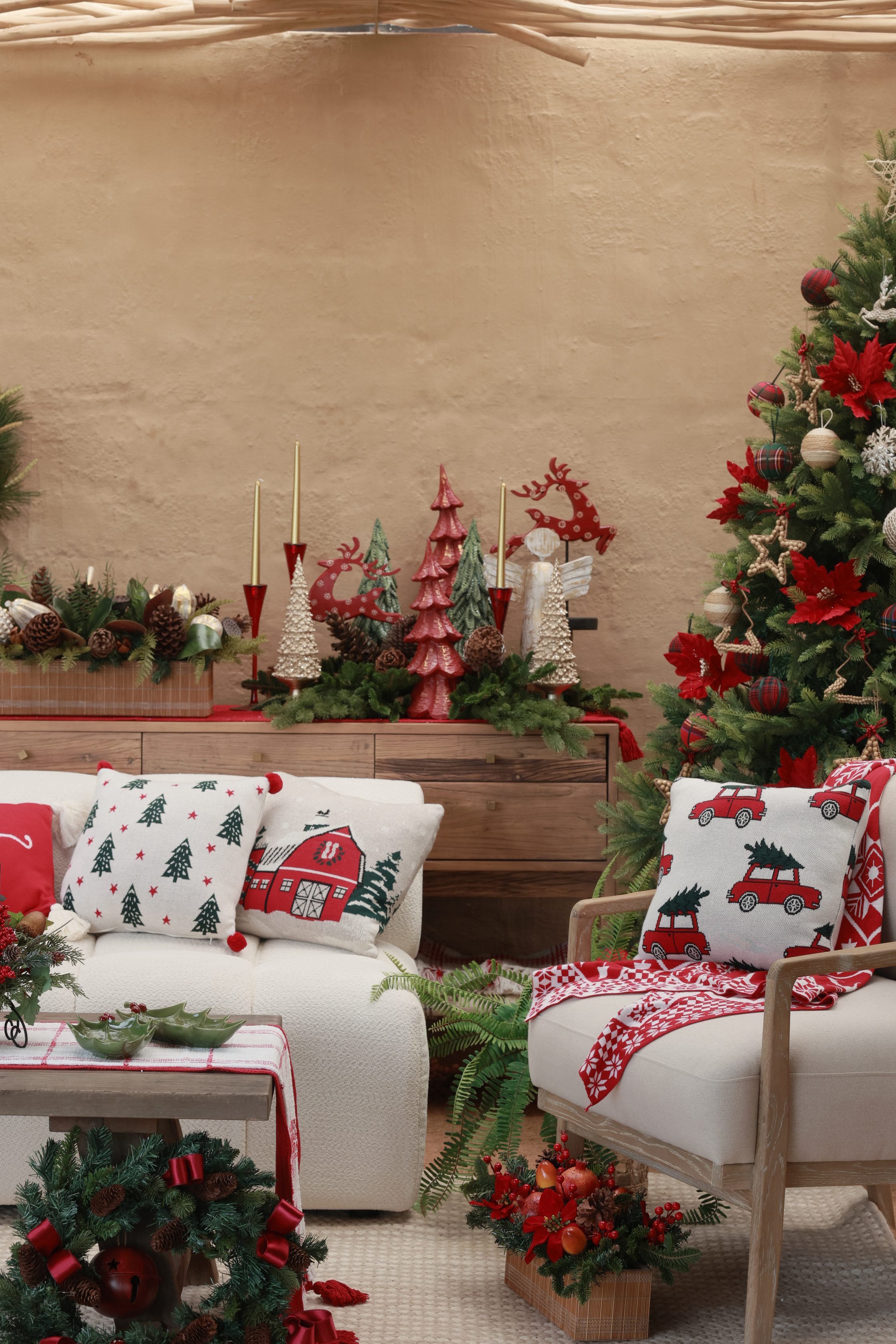 Celebrate the cheerful spirit of the season with the Holiday Car Trail cushion cover, a festive piece that captures the warmth and nostalgia of Christmas. Adorned with charming red trucks carrying freshly cut Christmas trees, this cushion evokes the joy of holiday traditions and family gatherings. The playful yet classic design adds a cozy, whimsical touch to your décor. Crafted from durable woven fabric, it combines both style and practicality. The neutral beige base beautifully balances the vibrant red and green hues, making it versatile enough to complement both rustic and modern festive settings.