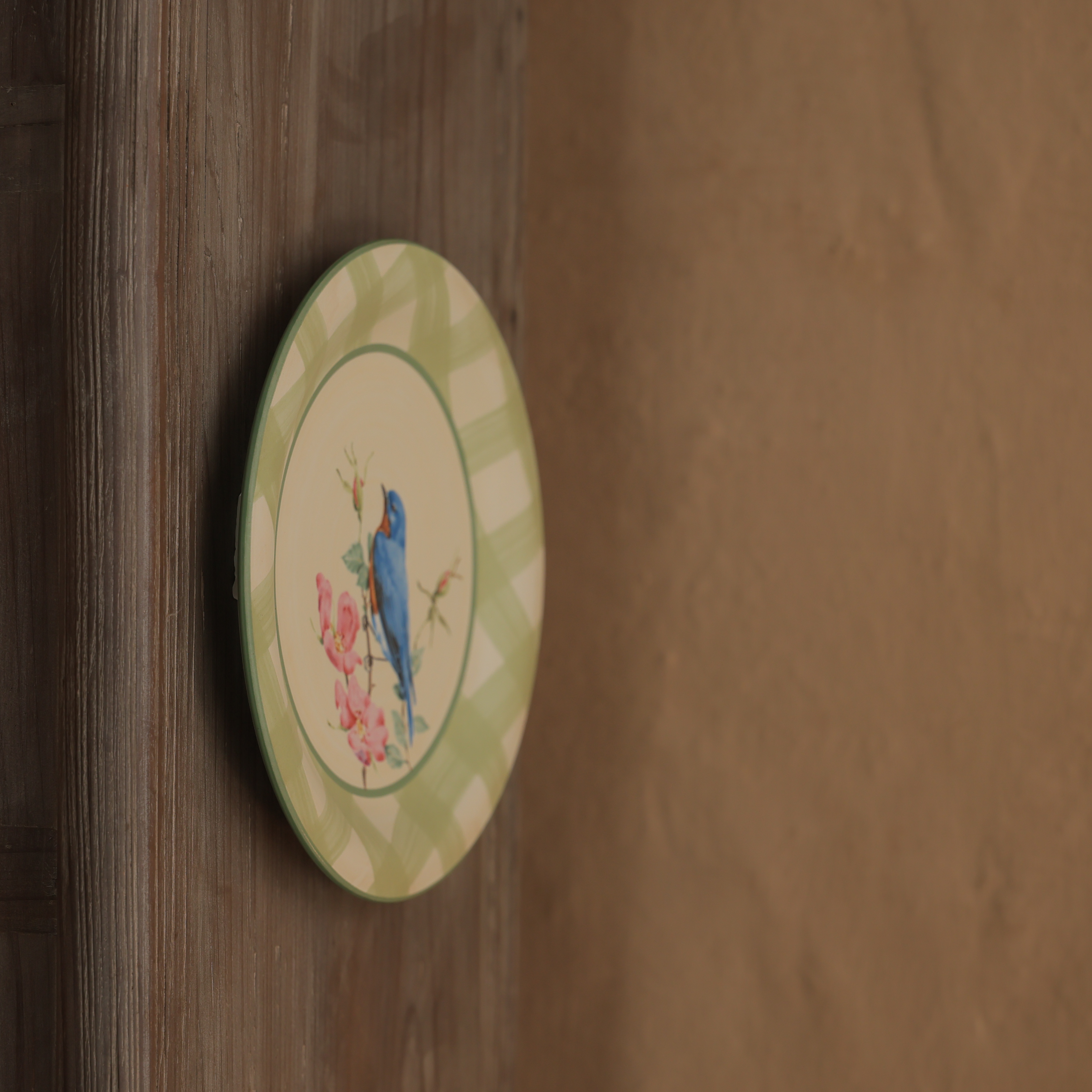 A decorative ceramic plate featuring a hand-painted blue humming bird perched on a delicate floral branch at its center. The soft green plaid rim frames the artwork, adding a fresh, vintage charm. Its smooth glazed finish and gentle color palette create a warm, artisanal feel, perfect as a display or accent piece.