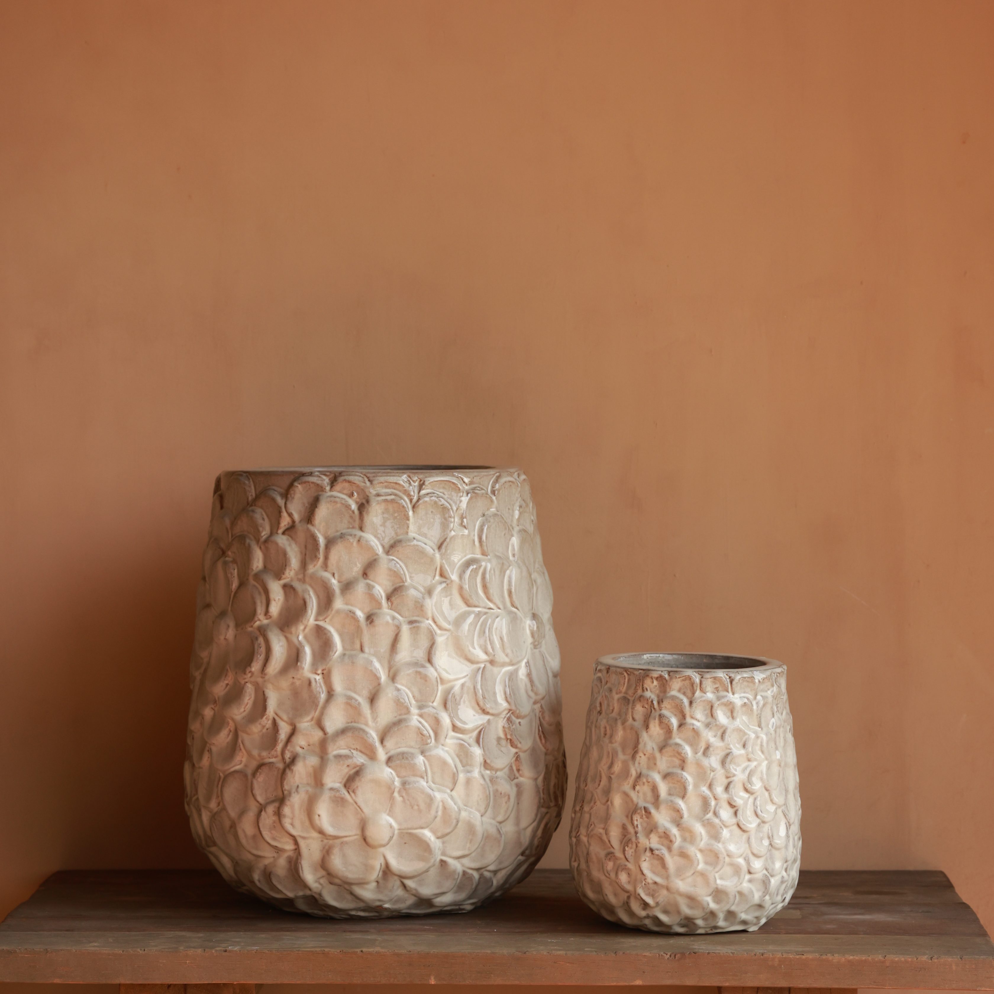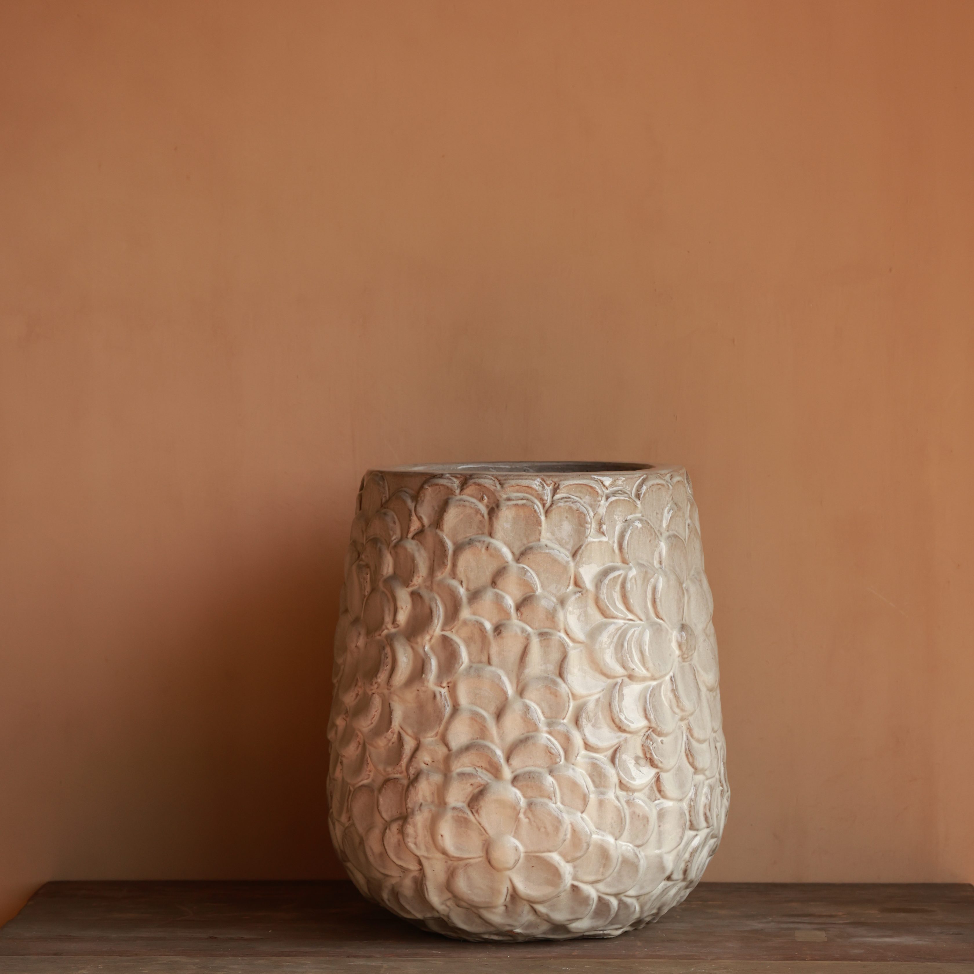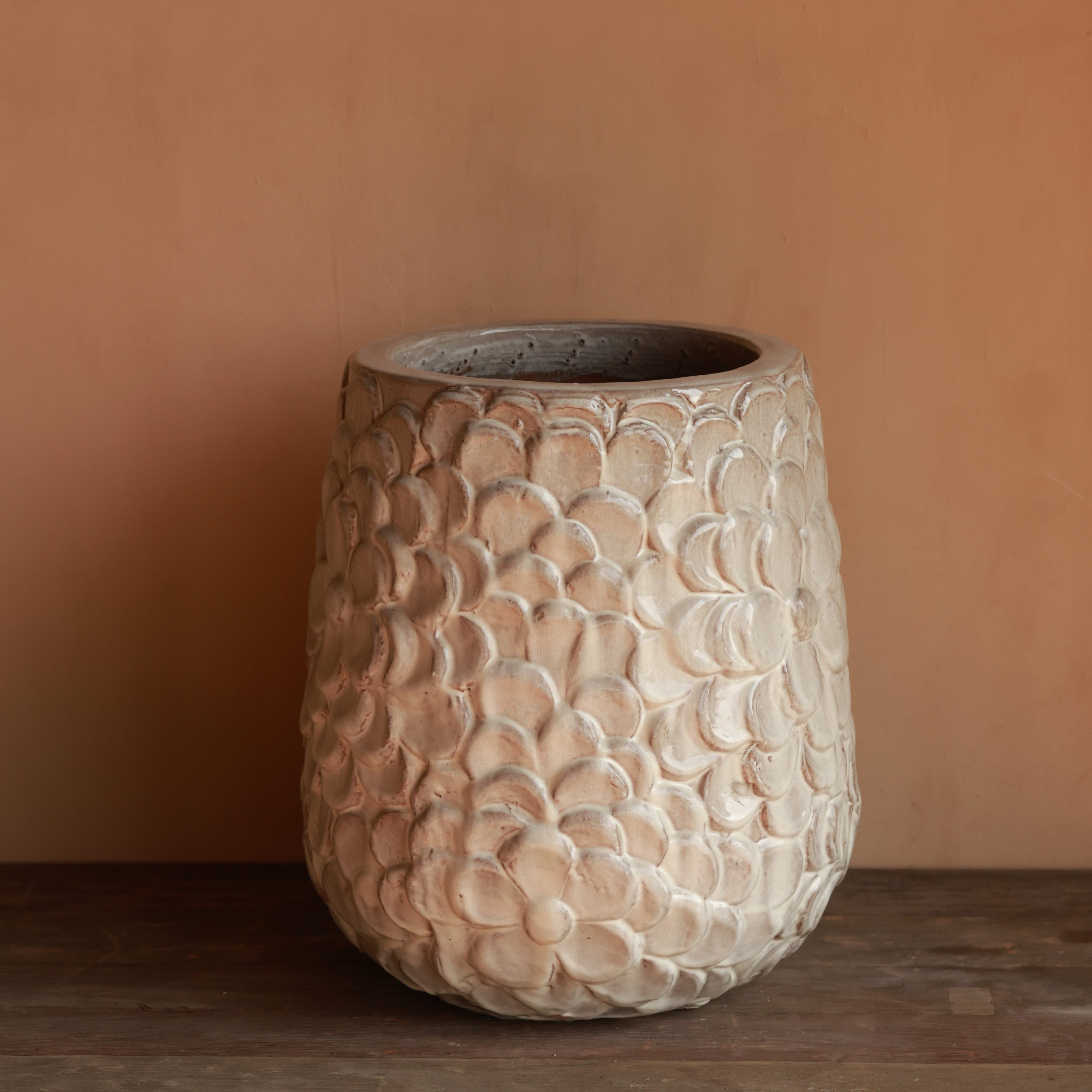 This stunning clay pot features an intricate hand-carved floral pattern, adding depth and texture. Its soft, neutral finish enhances its timeless elegance. A perfect statement piece for classic or bohemian interiors.