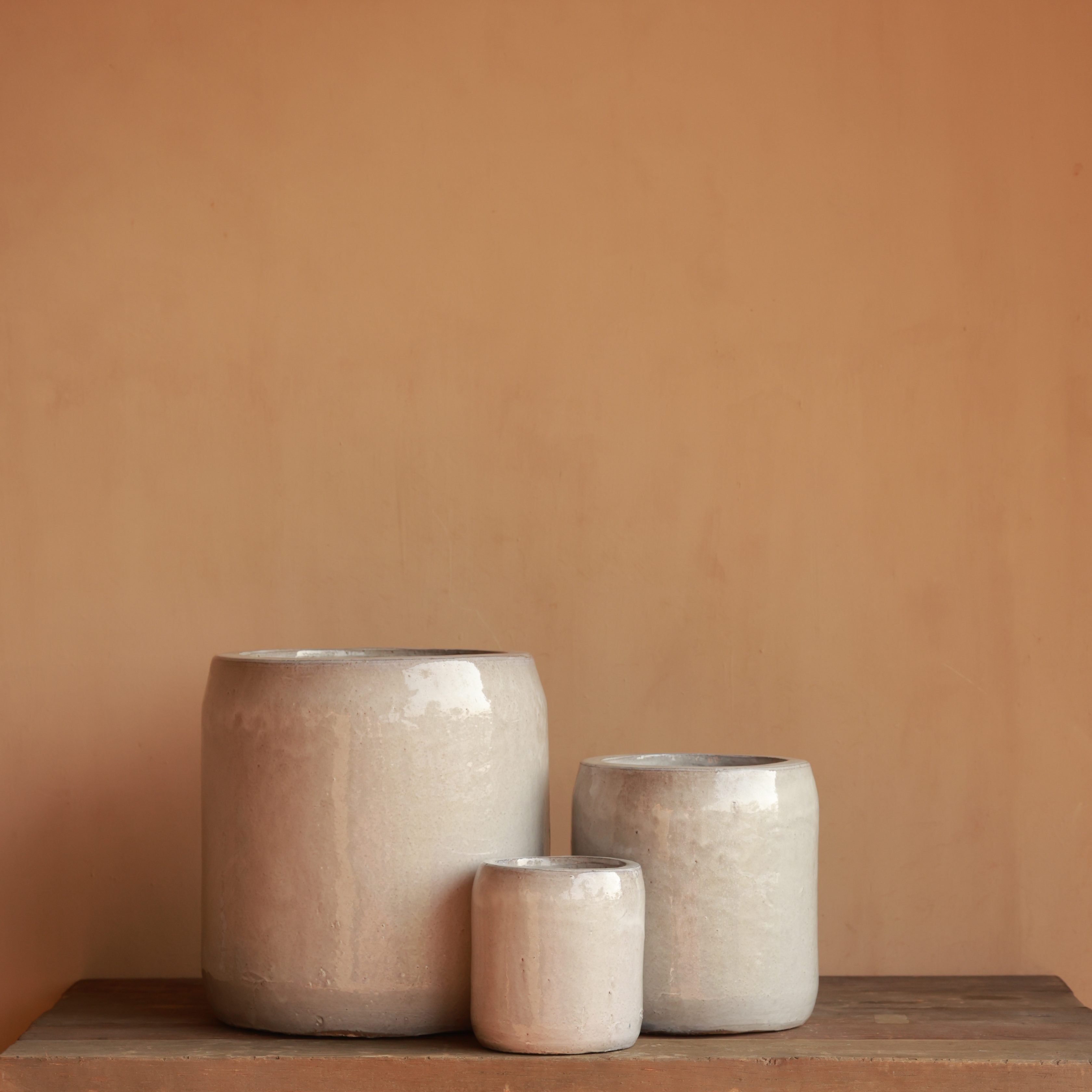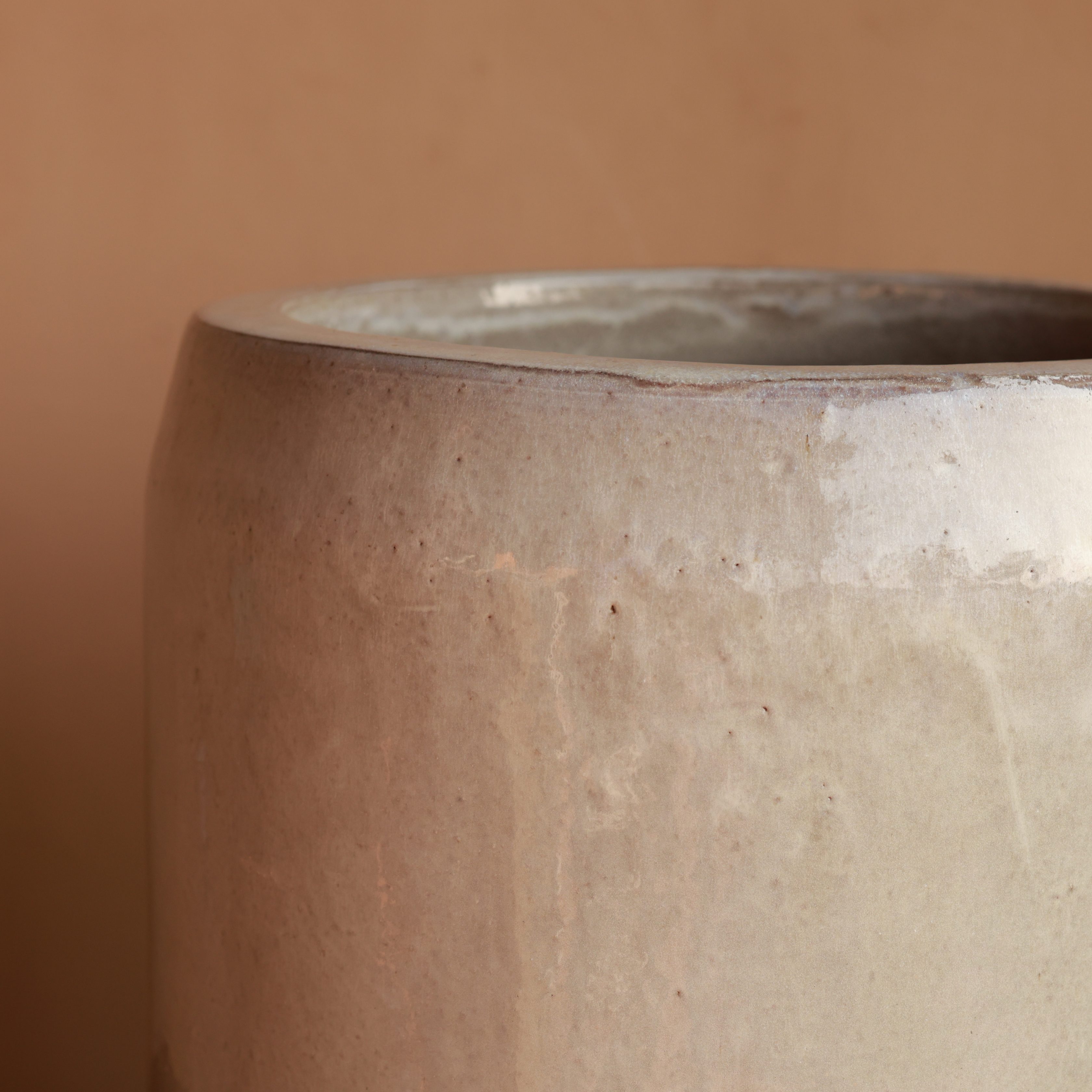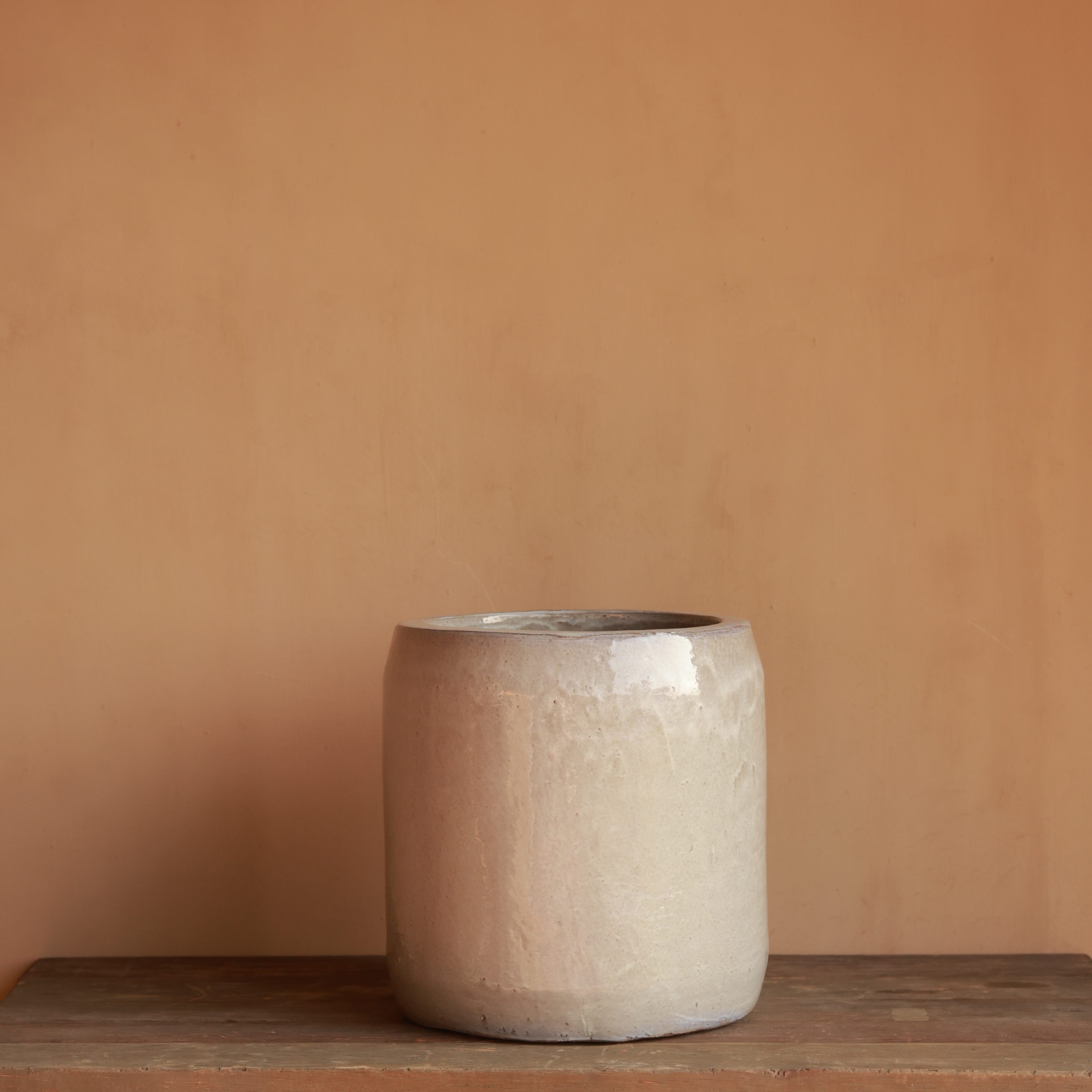 A smooth, neutral glaze and simple cylindrical form create a refined, modern look. Subtle texture adds depth while maintaining a clean aesthetic. Perfect for complementing contemporary or rustic spaces.