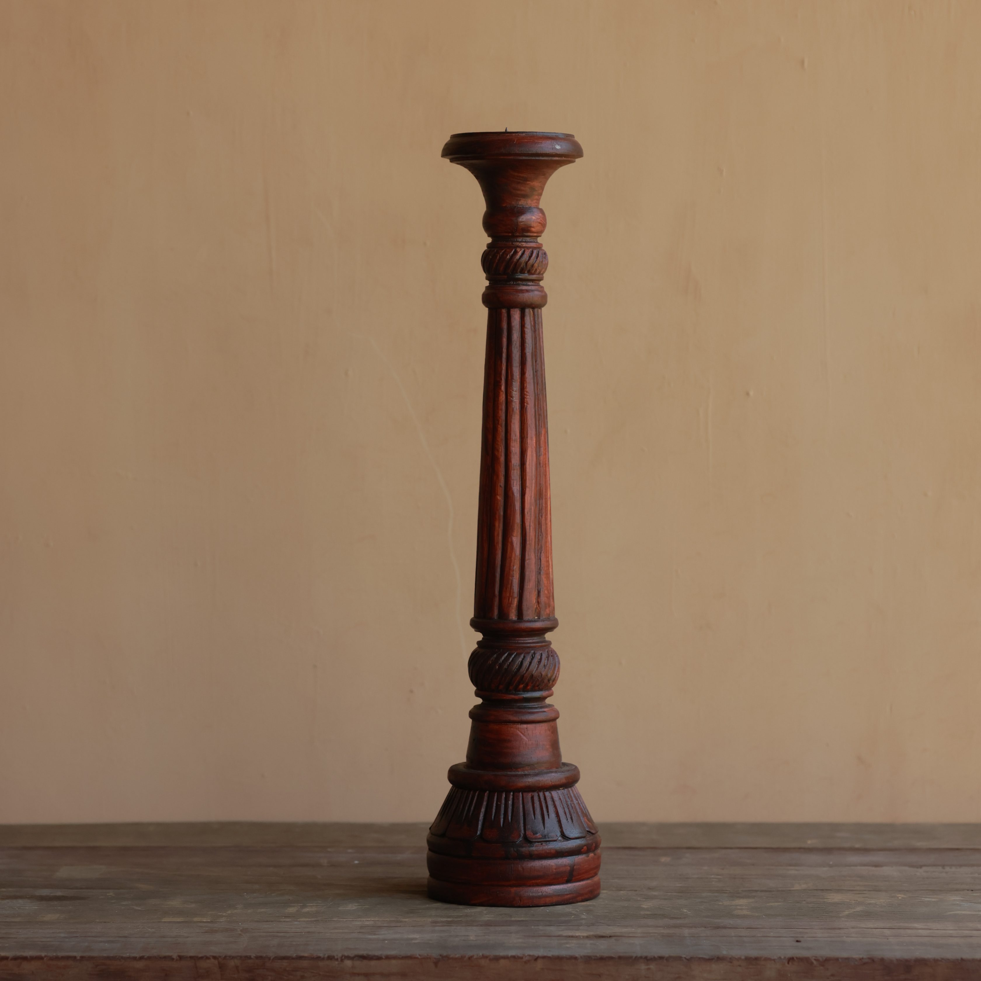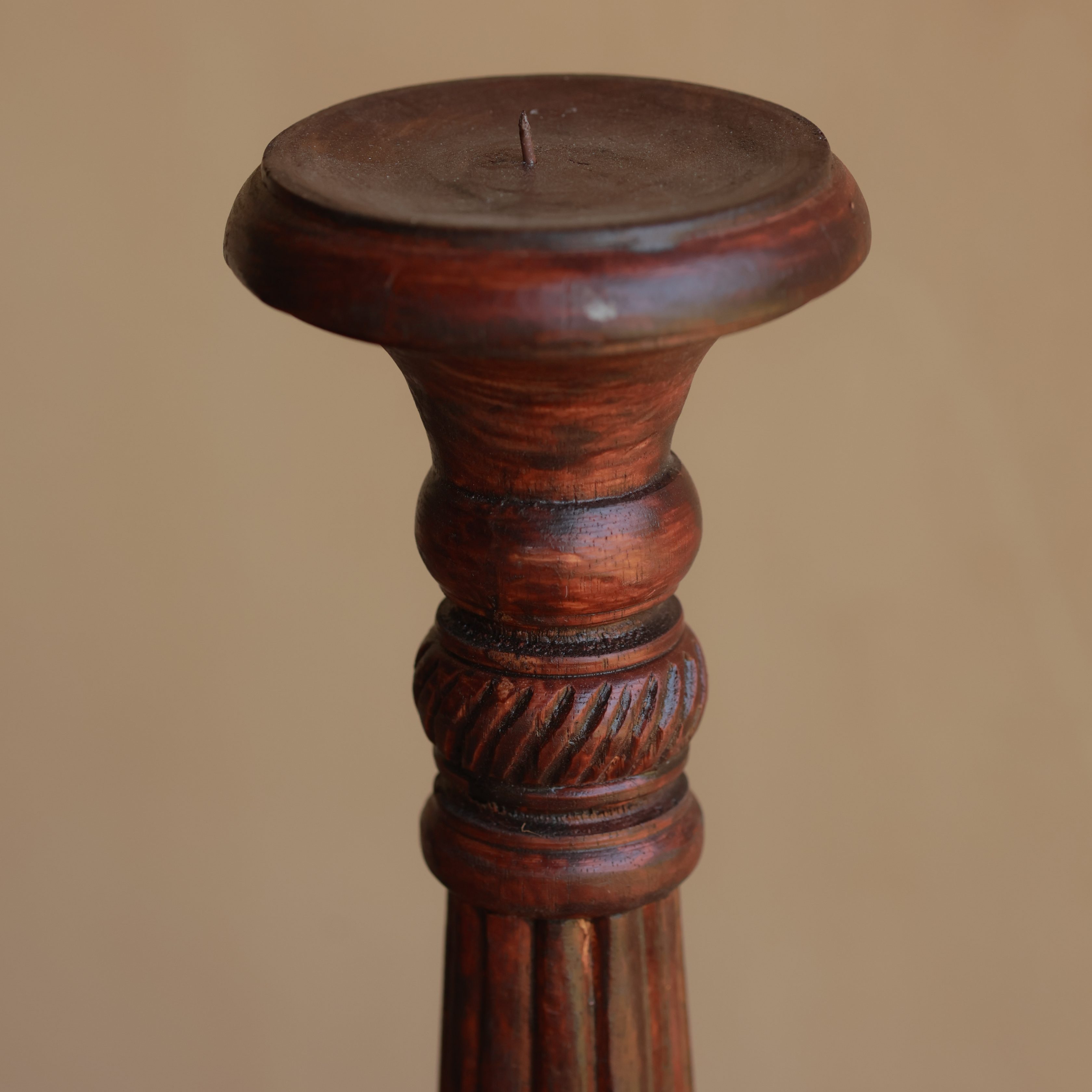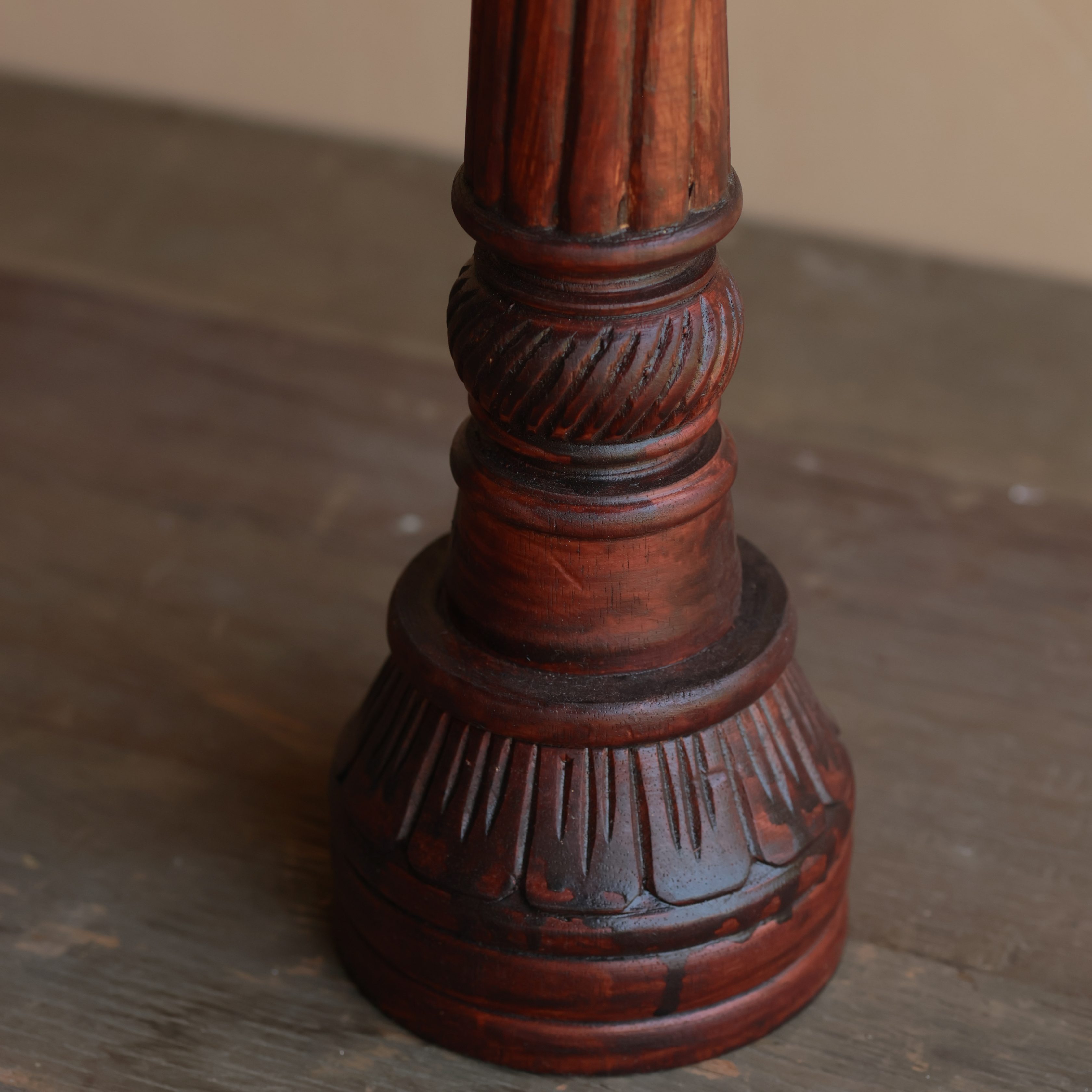 This beautifully crafted wooden candle holder showcases an intricate design with a fluted column and detailed carvings. The rich, warm tones of the wood enhance its rustic and vintage appeal, making it a perfect addition to traditional, bohemian, or antique-inspired interiors.