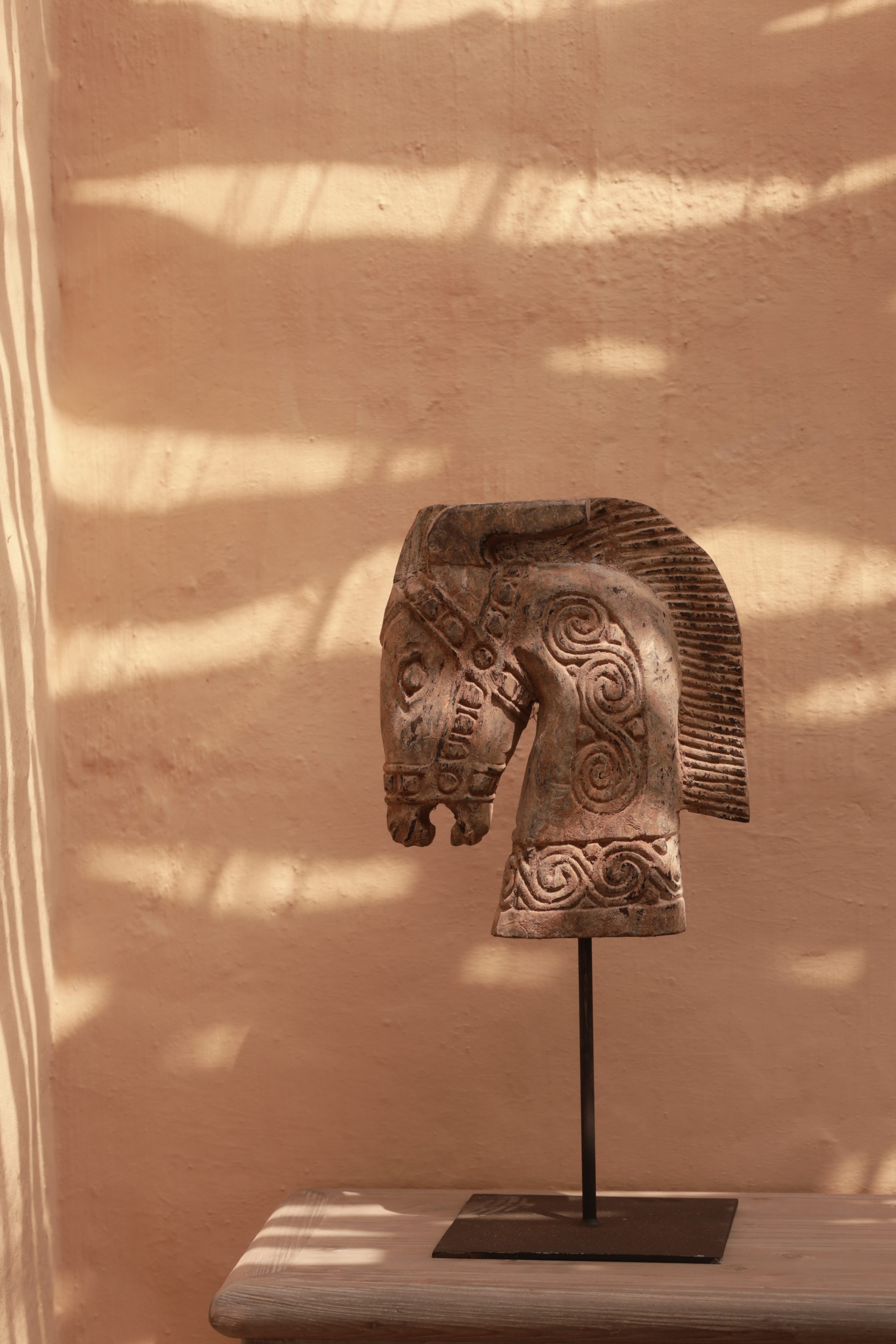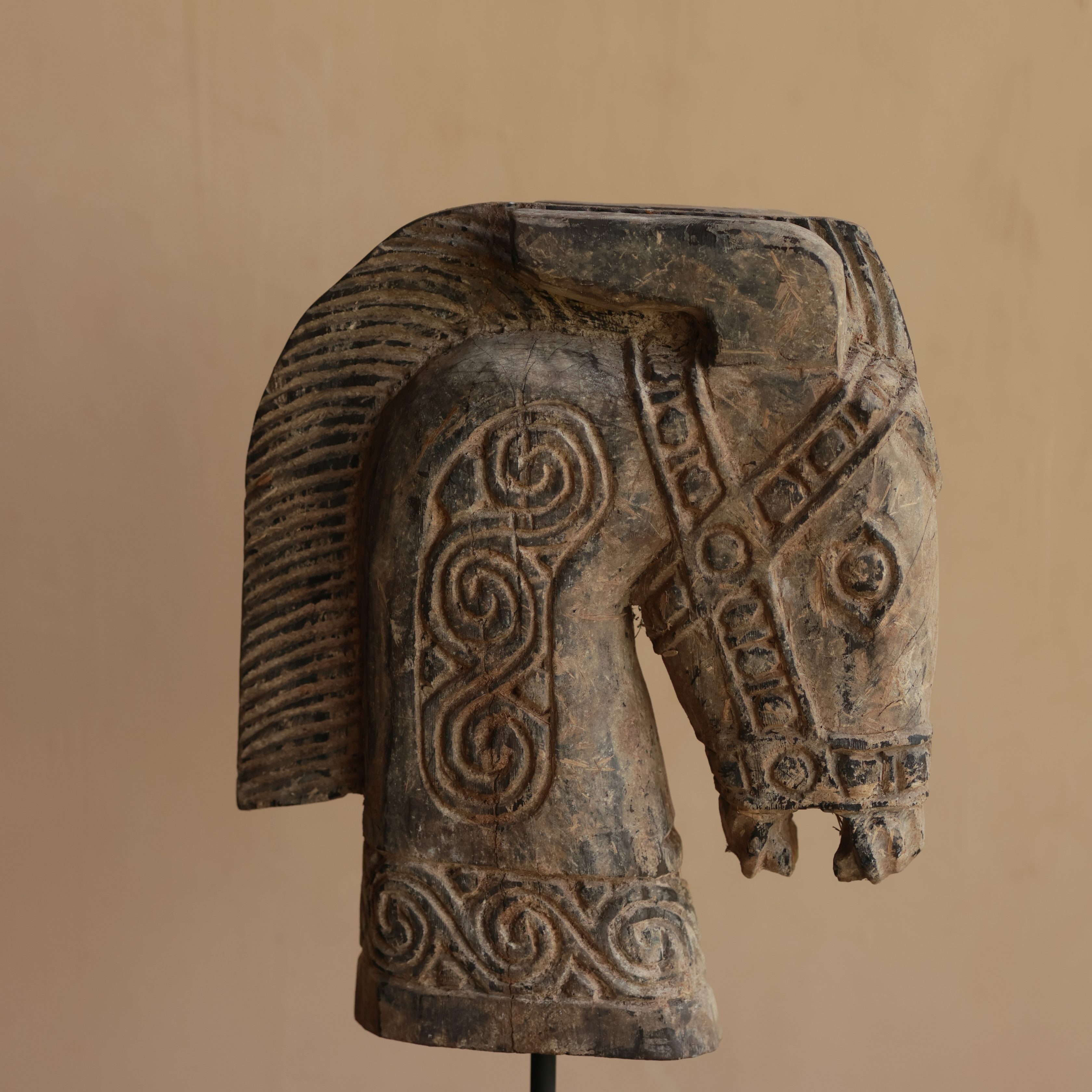 Add a touch of heritage and artistry to your space with this hand-carved wooden horse head. Crafted from solid wood, this exquisite piece showcases intricate tribal patterns and a rustic finish, making it a perfect blend of tradition and elegance. Each carving is unique, displaying masterful craftsmanship that adds character and charm to any setting.