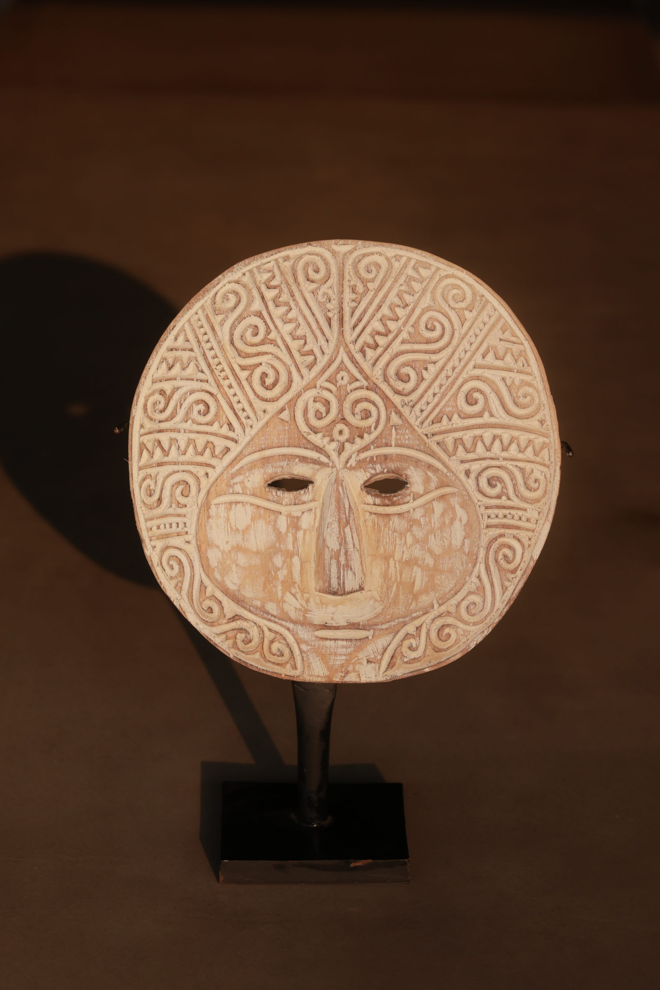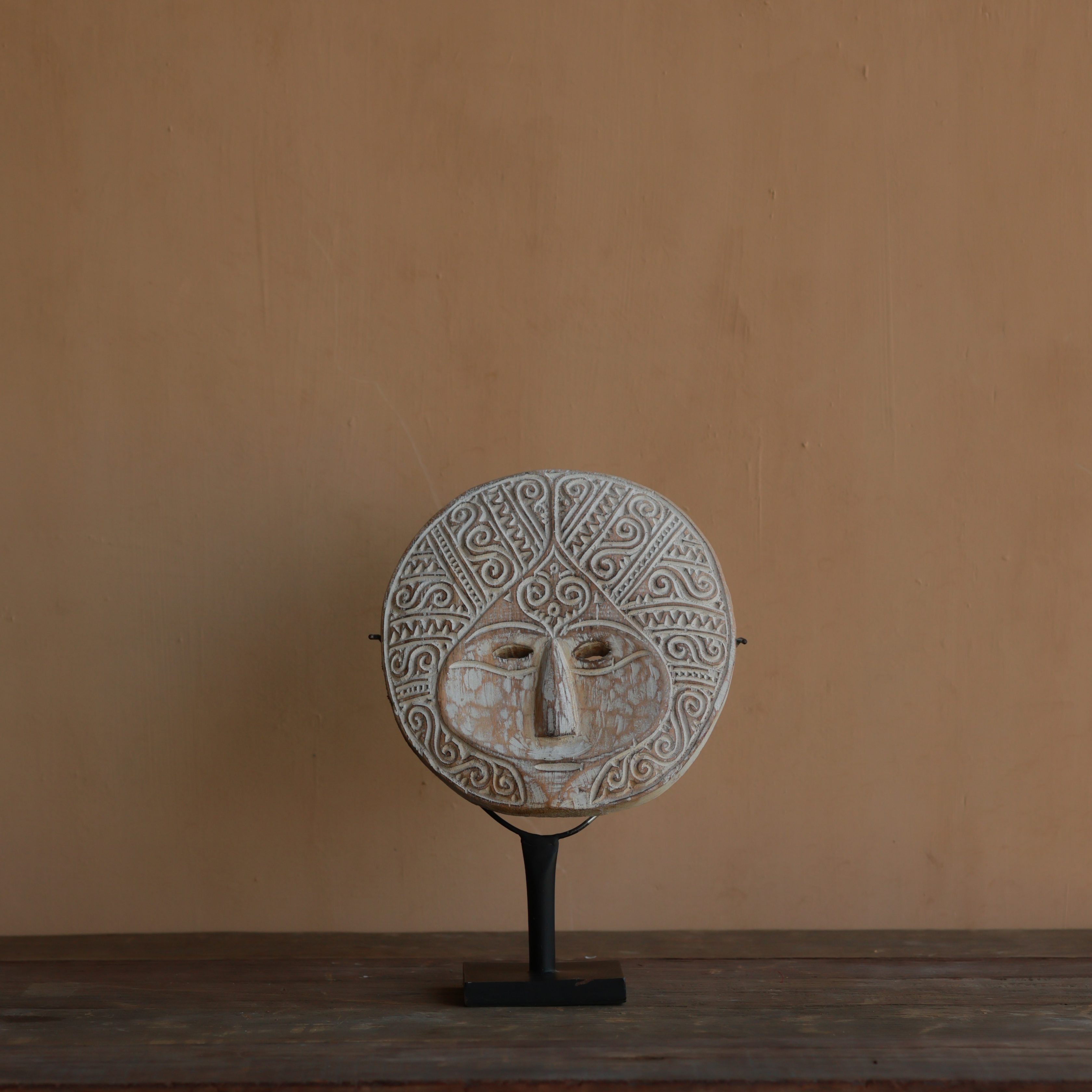 Enhance your space with this stunning handcrafted tribal wooden mask, elegantly displayed on a sturdy metal stand. Featuring intricate hand-carved details and a distressed whitewash finish, this unique decor piece is perfect for boho, ethnic, and rustic interiors. Whether placed on a console table, bookshelf, or mantel, it serves as an eye-catching cultural statement piece.