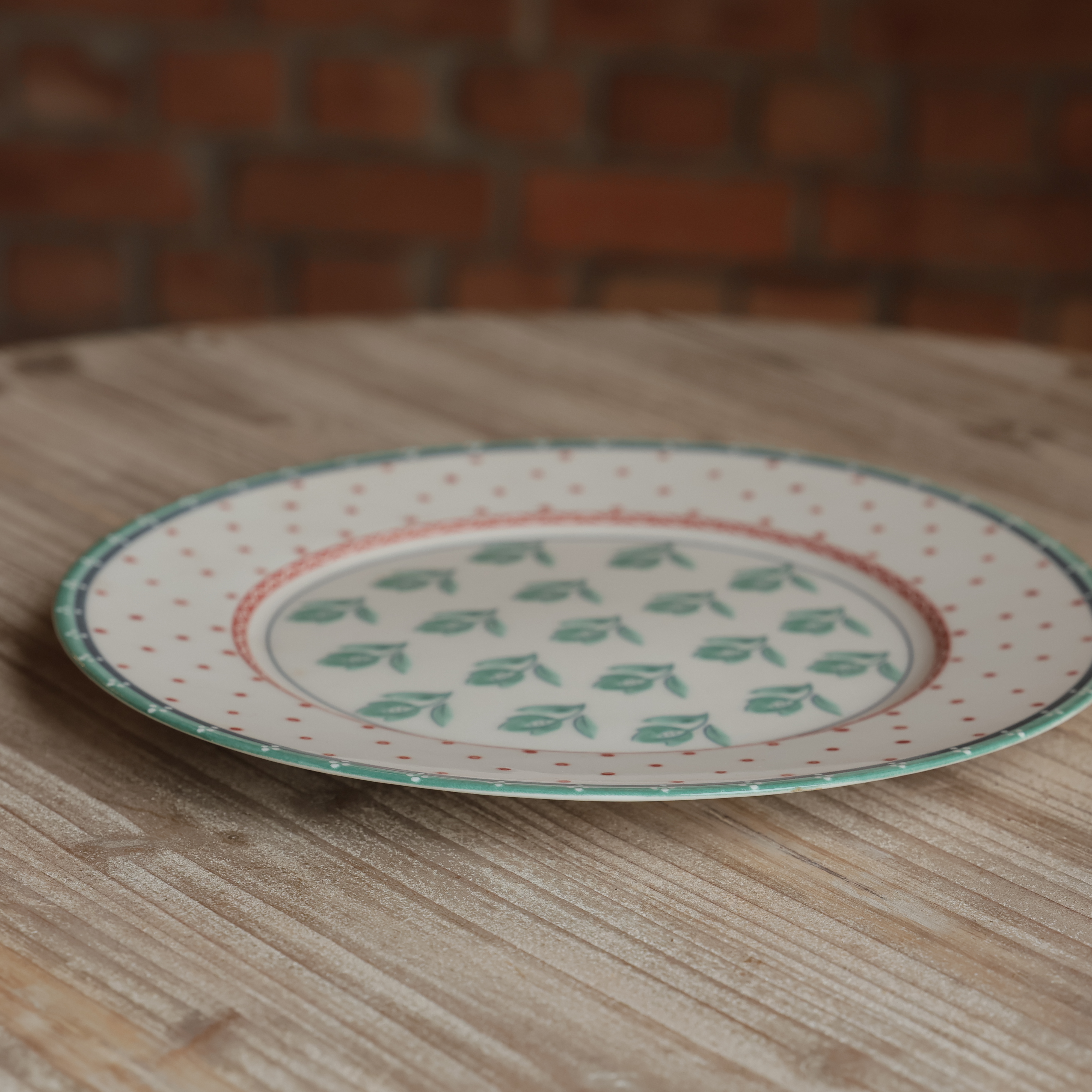 A charming ceramic plate featuring a delicate and refreshing design of small green leaf motifs arranged in a neat pattern. The soft white base is accented with a subtle border of fine red dots and a muted green rim, creating a balanced and elegant look. Perfect for everyday dining or as a decorative piece, it brings a light, rustic touch to any table setting.