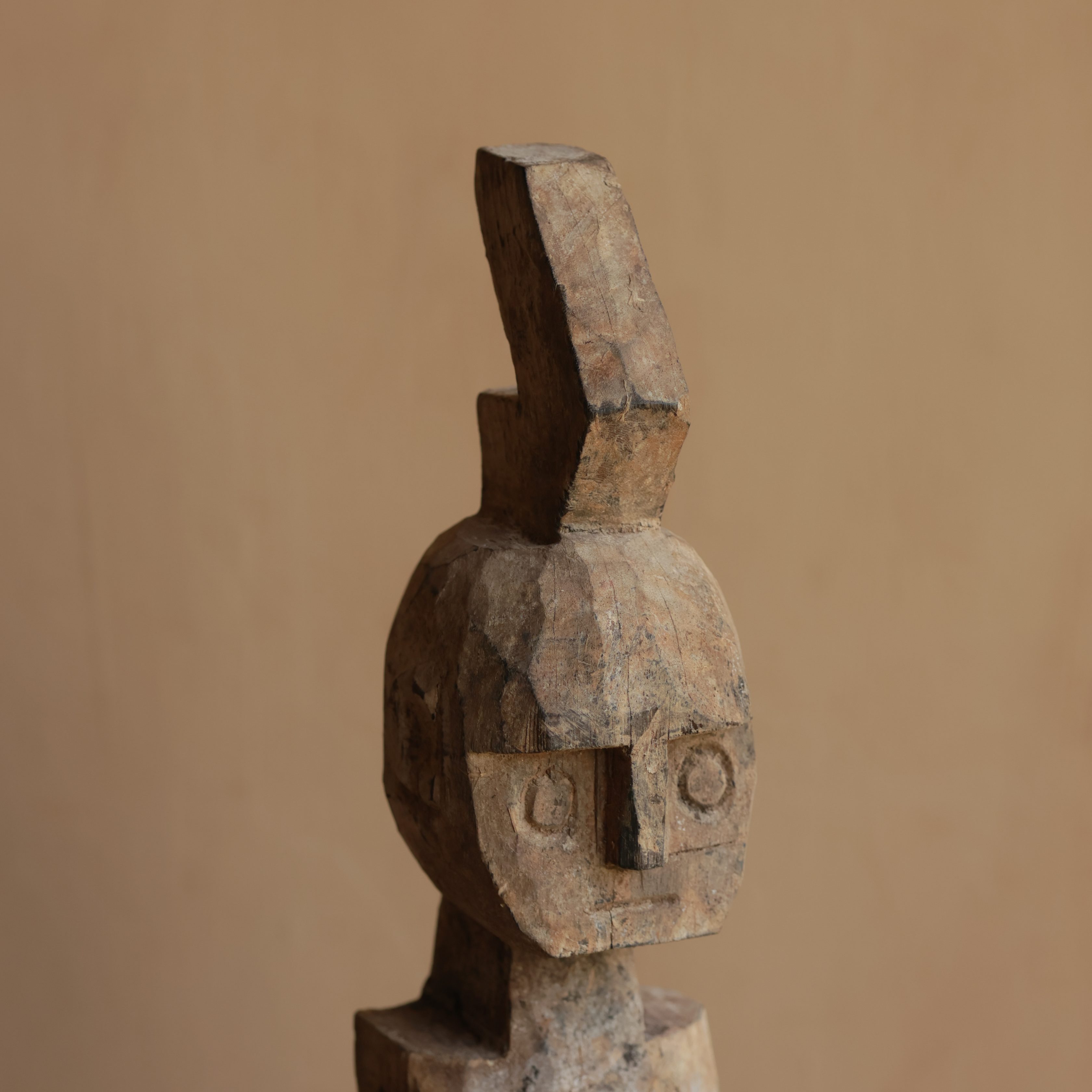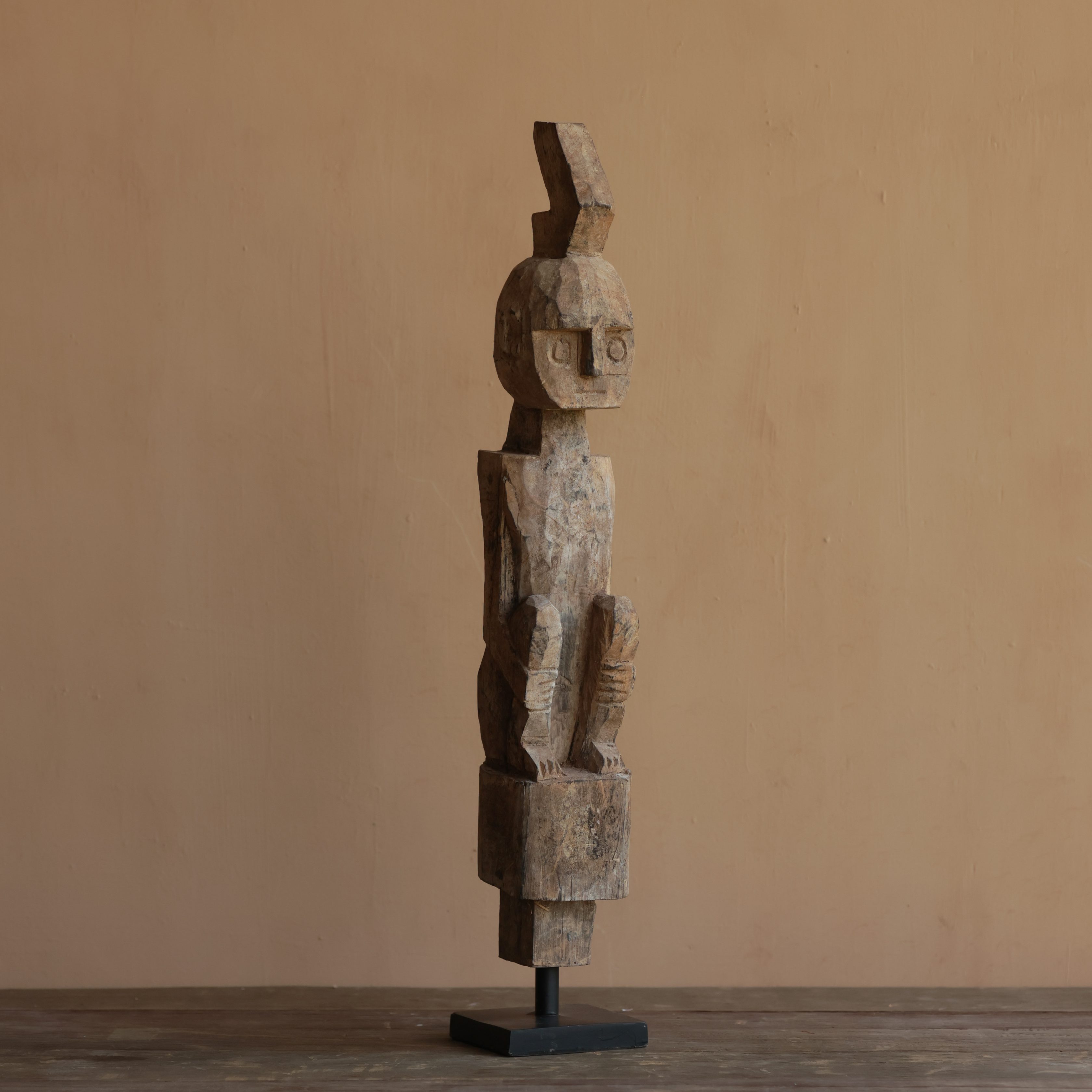 A hand-carved wooden figure stands tall on a black metal base, exuding a sense of tribal artistry and cultural significance. The geometric facial features, angular limbs, and pronounced headdress suggest traditional craftsmanship, possibly from an African or Southeast Asian origin. A weathered texture and natural wood grain add depth and authenticity, emphasizing its age and artisanal character.
