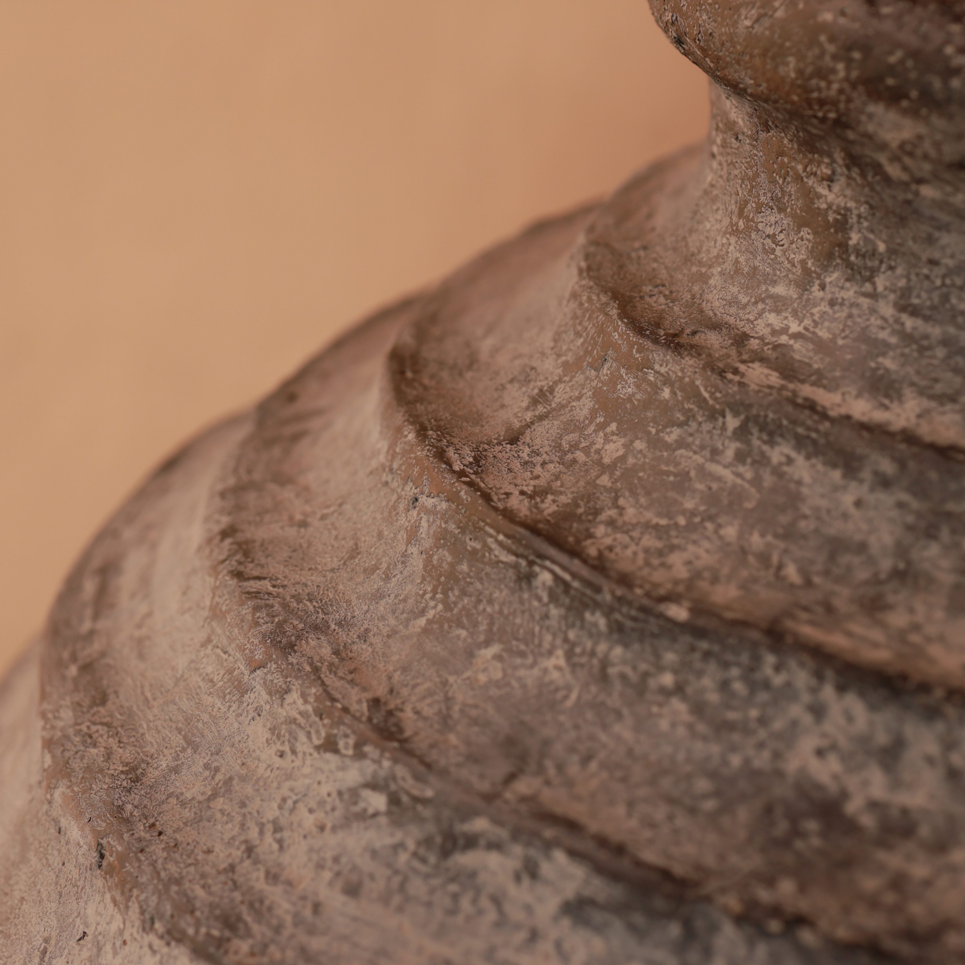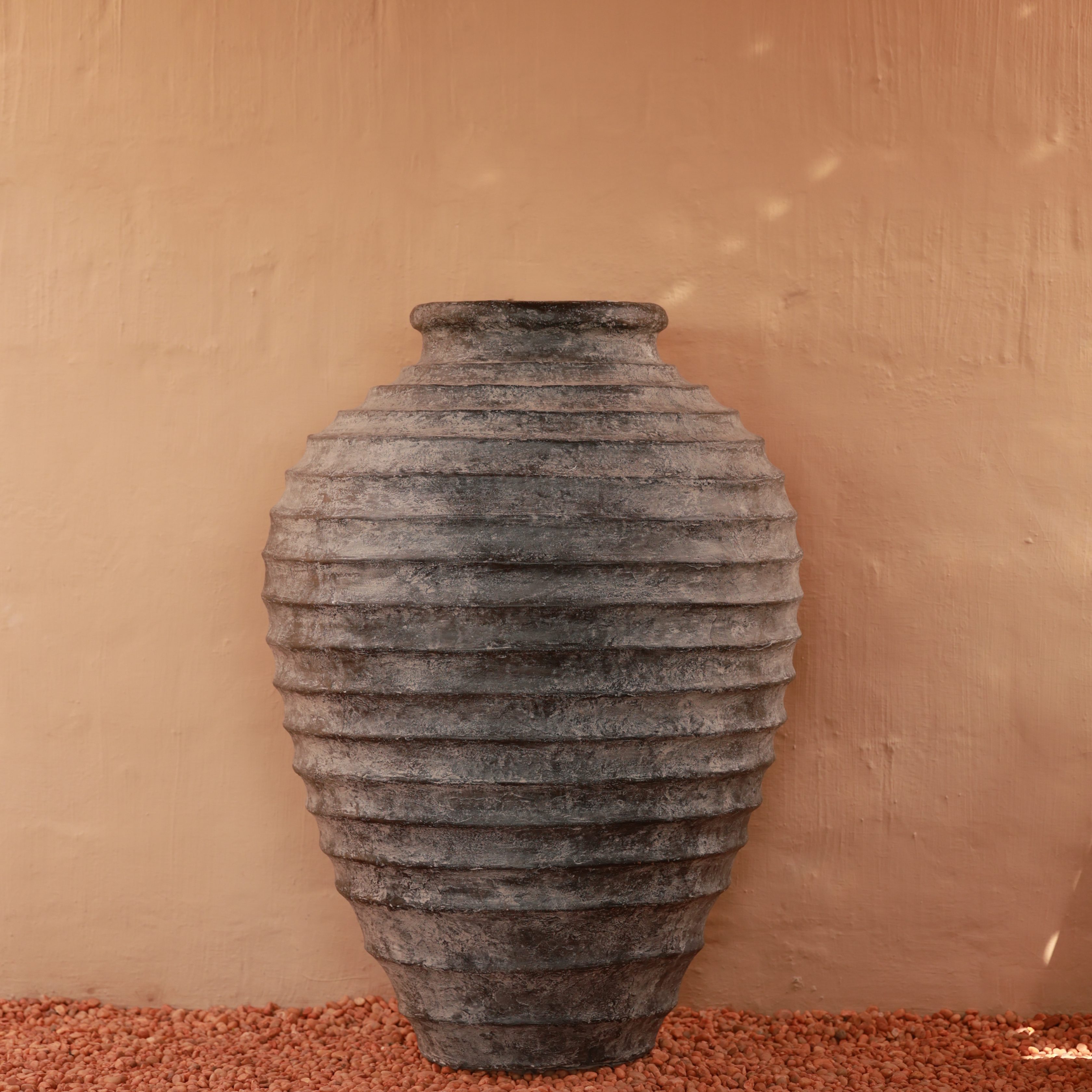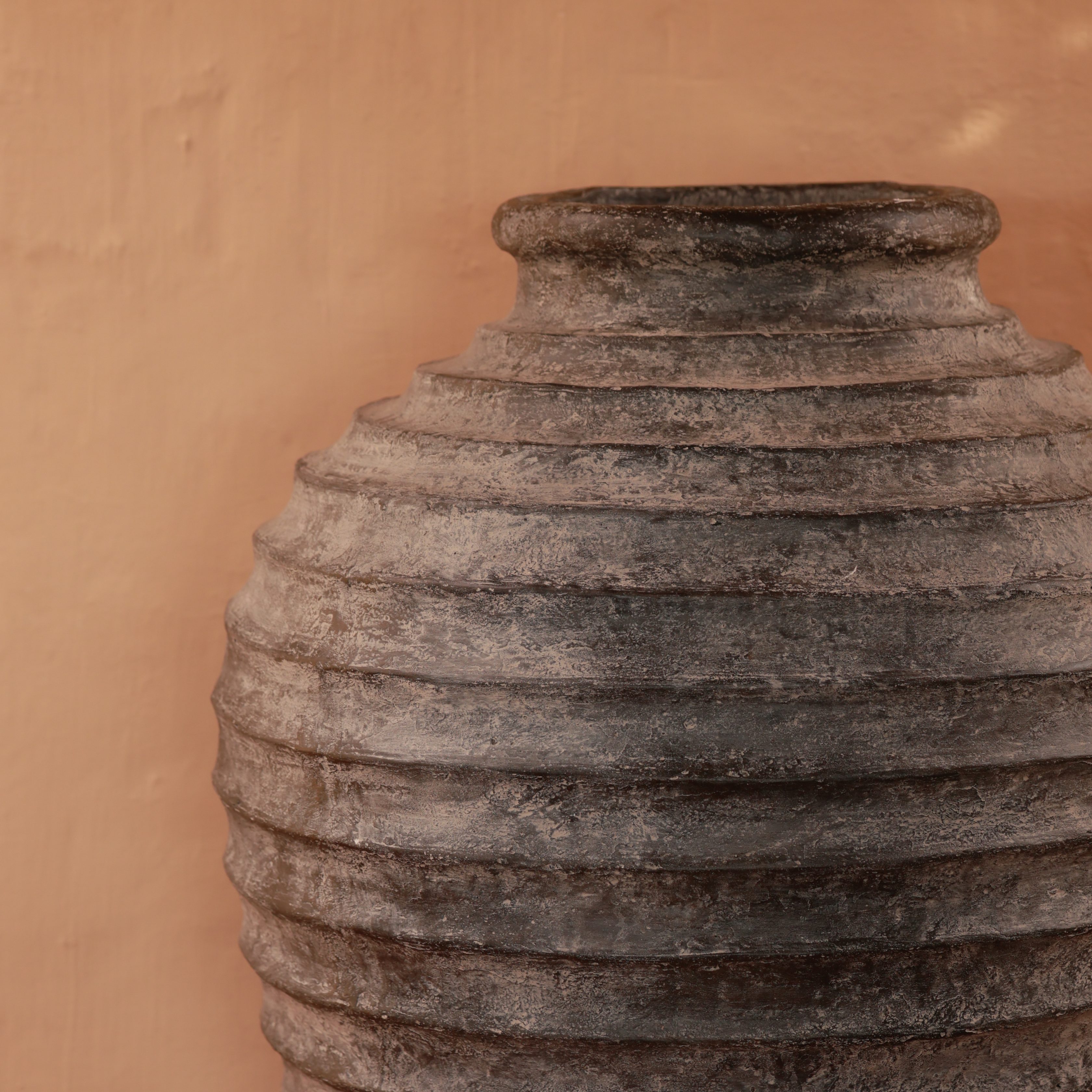 This grand, handcrafted clay pot features a striking ribbed design with a weathered finish, adding a touch of timeless elegance to any space. Its large size makes it perfect for indoor or outdoor décor, serving as a stunning planter or a statement piece on its own. Ideal for rustic, Mediterranean, or contemporary settings.