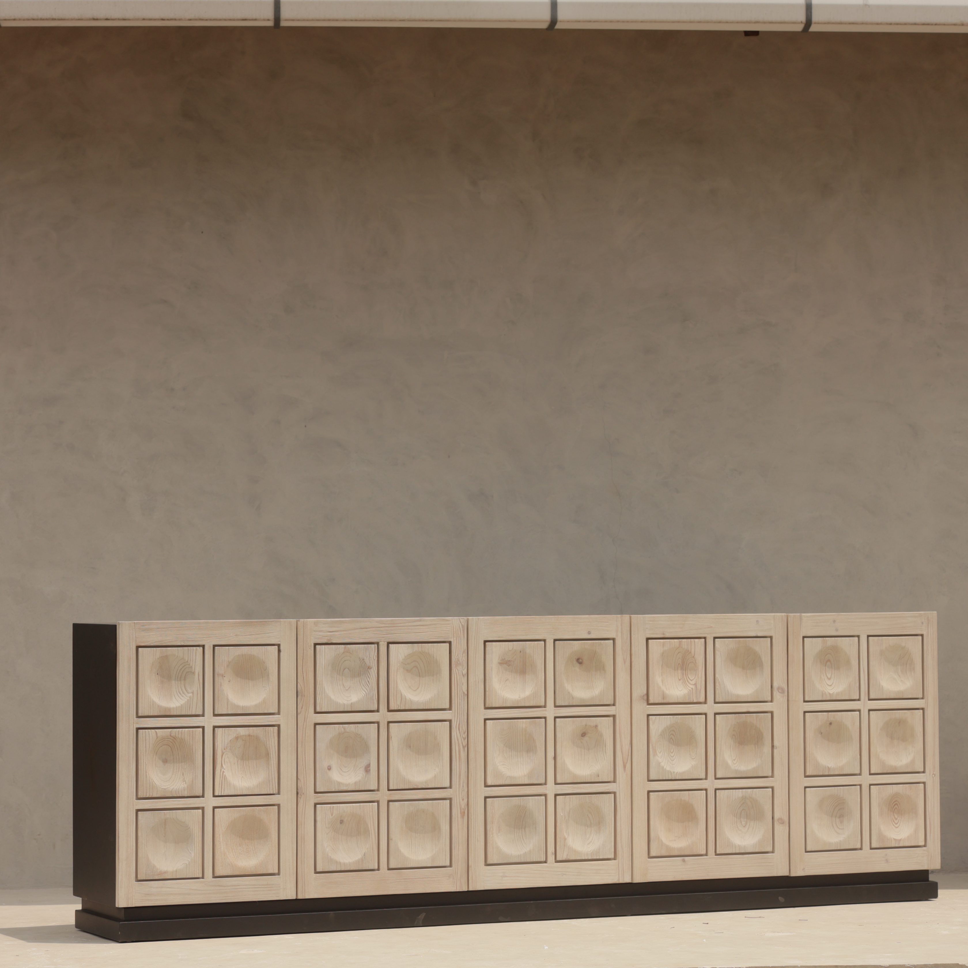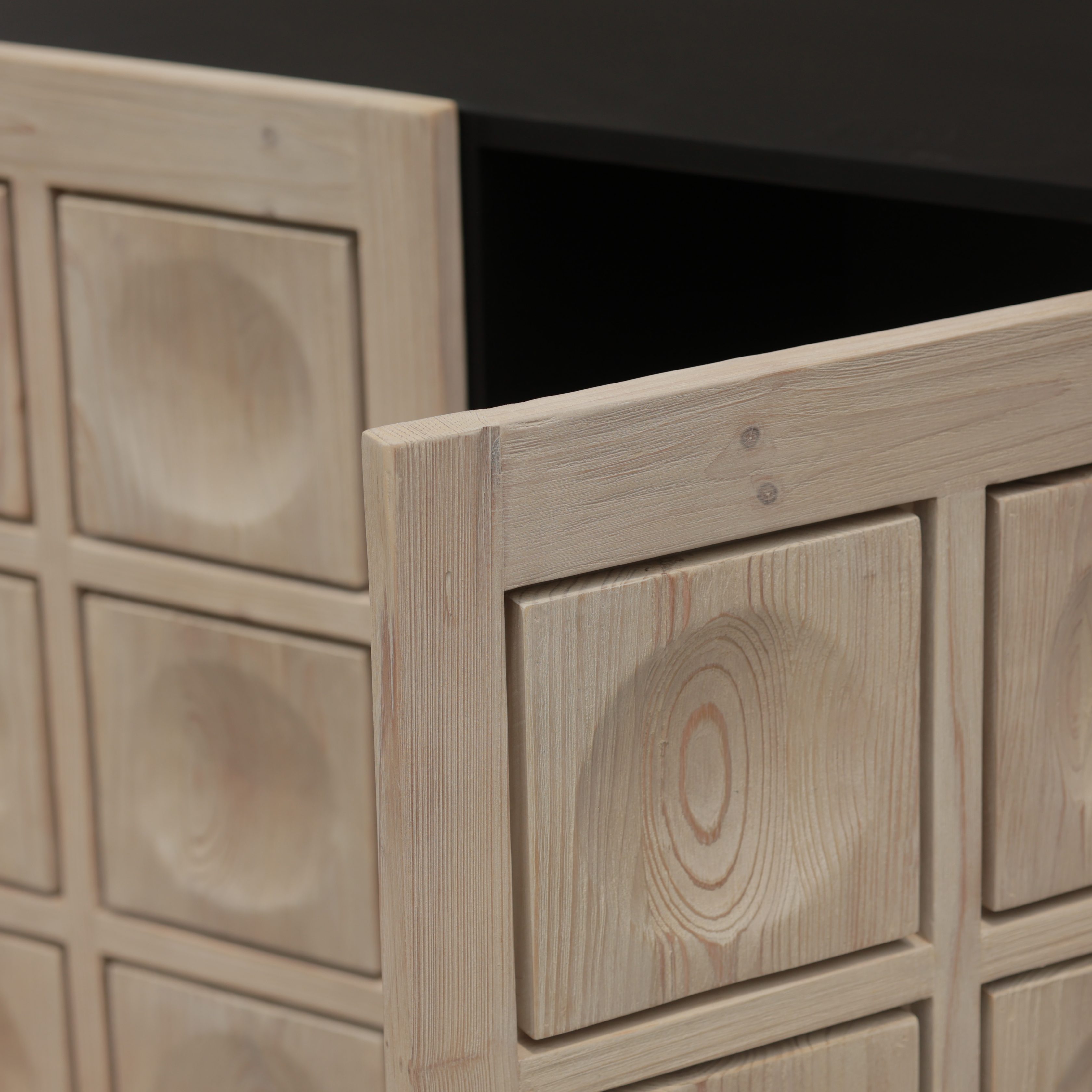 This striking sideboard blends bold black tones with natural wood accents, creating a sophisticated contrast. The carved wooden doors feature a square panel design, adding depth and texture to its minimalist frame. With spacious compartments inside, this piece offers ample storage for dining essentials, media accessories, or home organization. Perfect for contemporary, industrial, or rustic interiors.