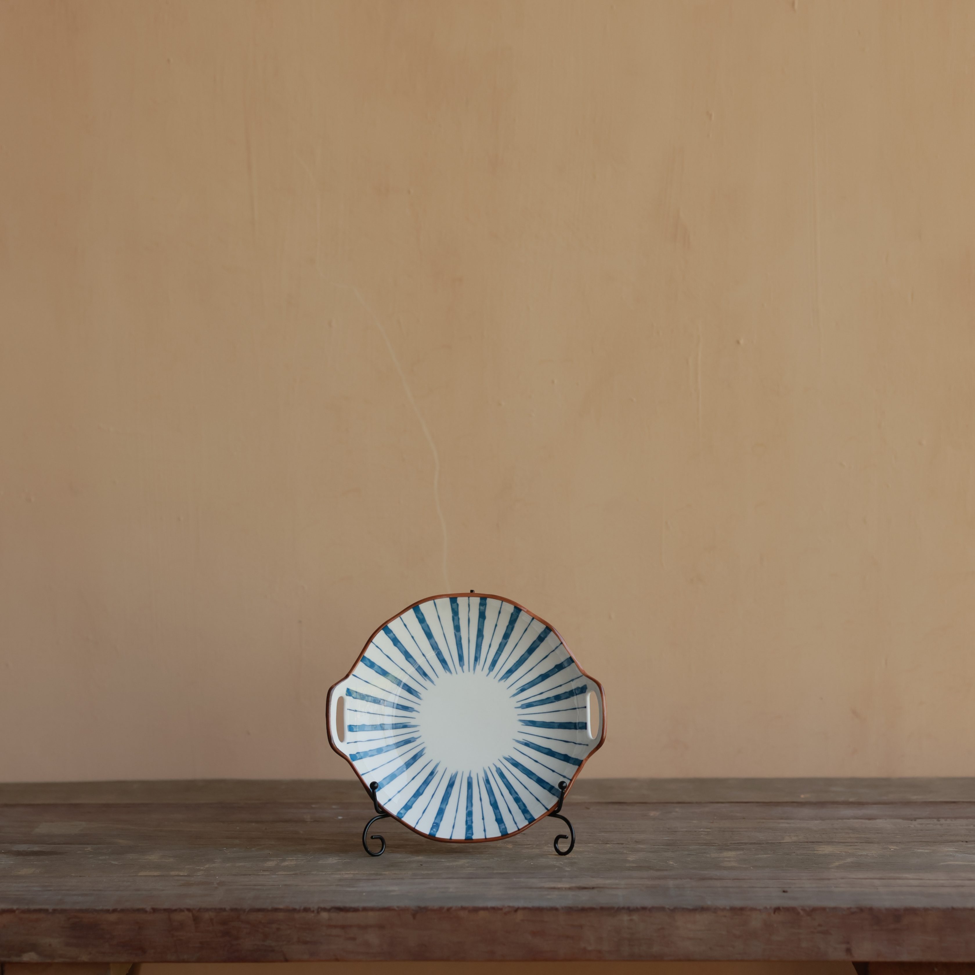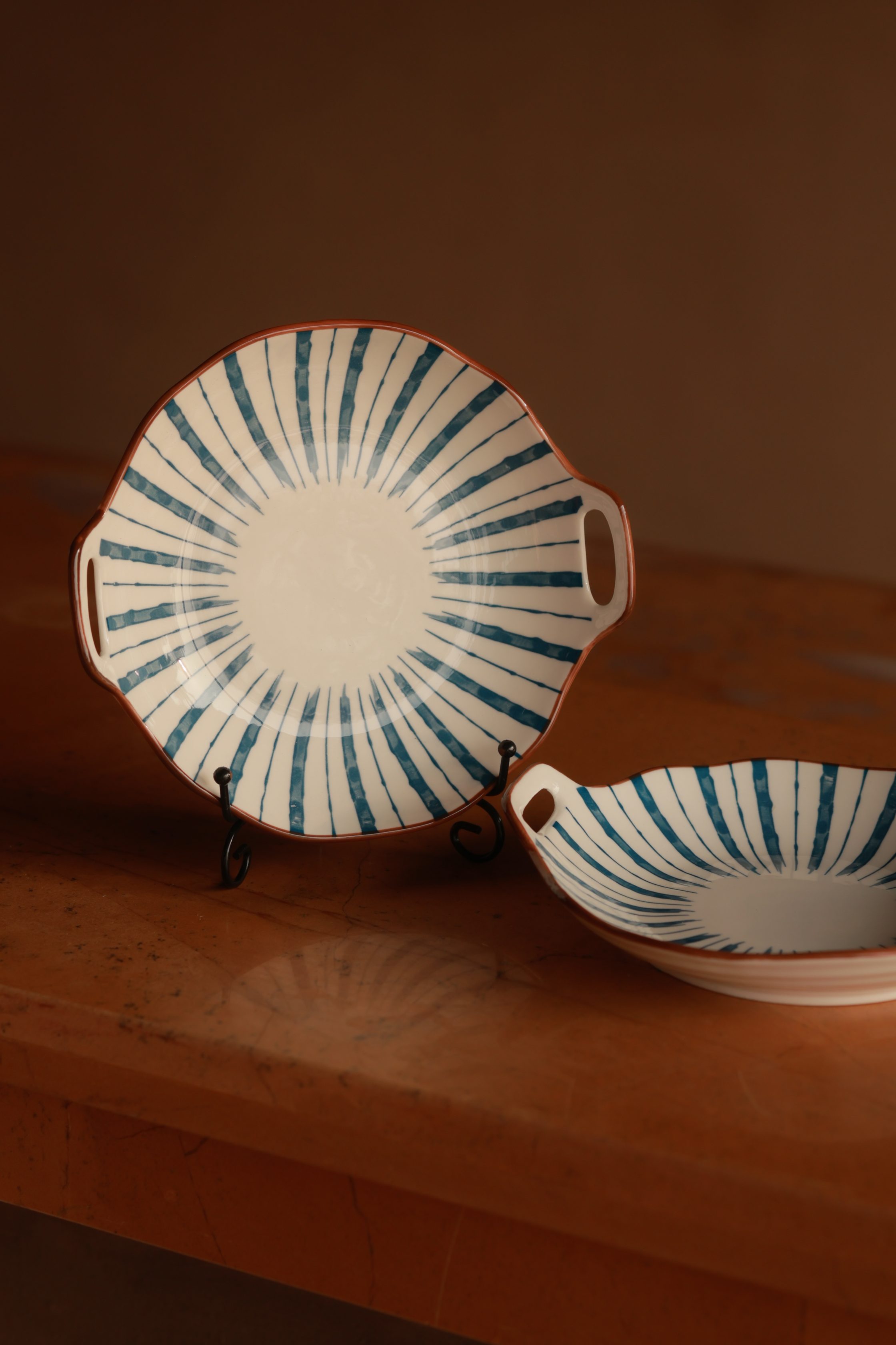Elevate your dining experience with this stunning hand-painted ceramic serving dish, featuring a classic blue and white striped pattern with a rustic brown rim. Designed with built-in handles for easy serving, this elegant dish is perfect for appetizers, snacks, desserts, or decorative use.