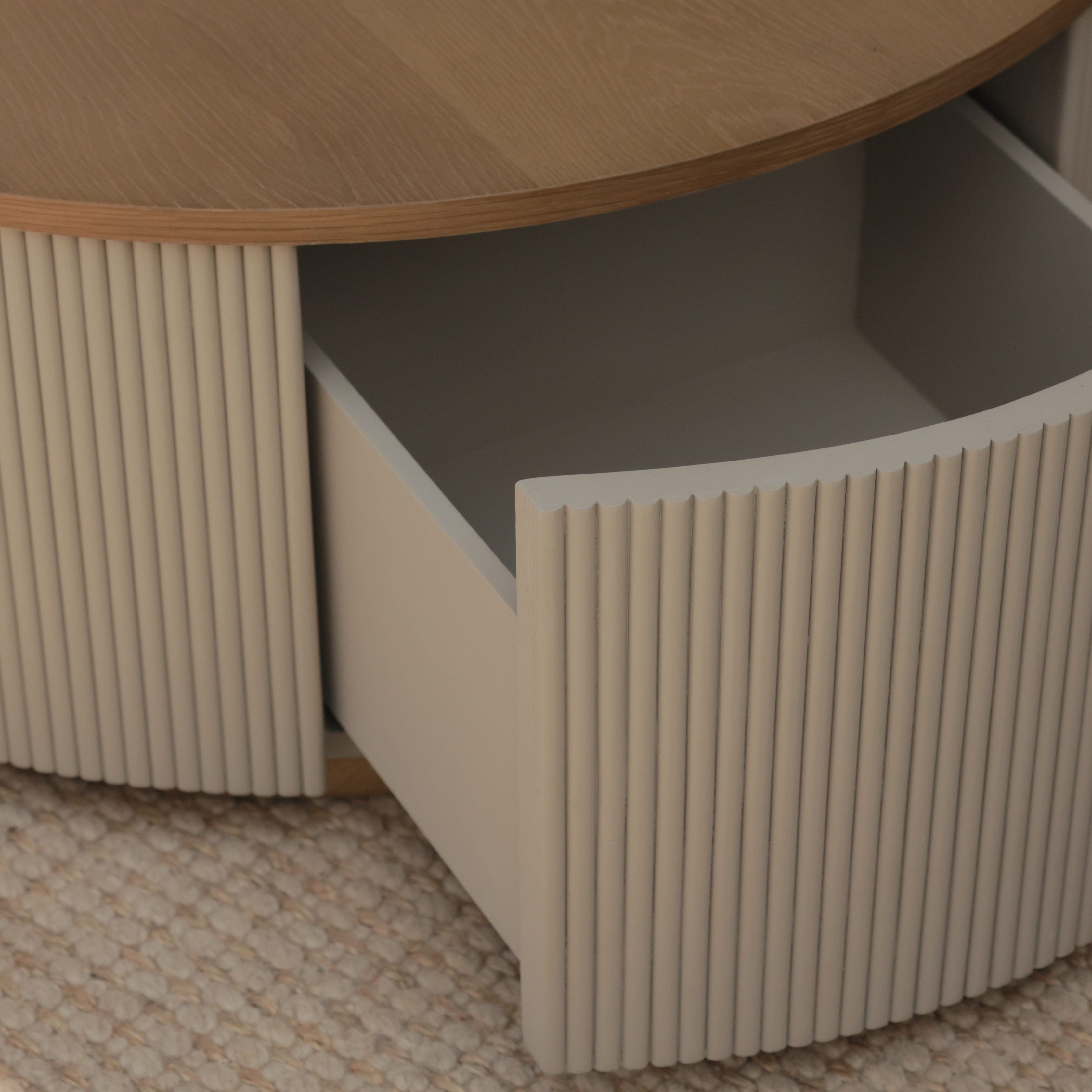 A round coffee table with a smooth wooden top and a textured, ribbed base. The neutral-toned finish enhances its modern aesthetic, making it a stylish centerpiece for any living space. Designed with functionality in mind, the table features a built-in drawer for convenient storage, seamlessly blending practicality with elegance. Perfect for keeping essentials organized while adding a refined touch to your home.