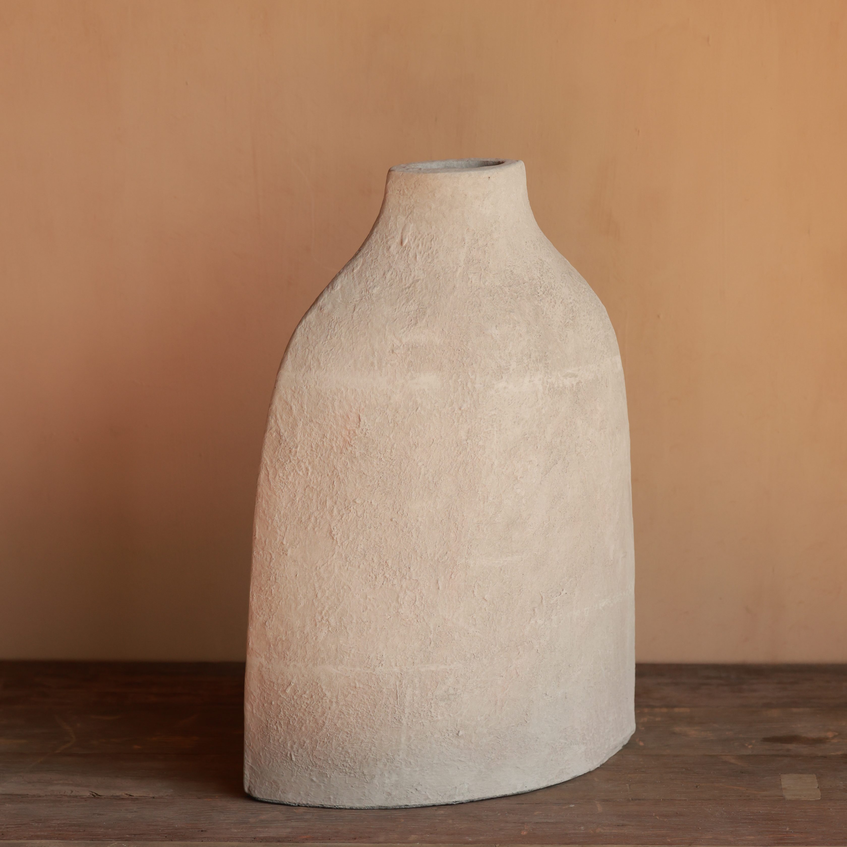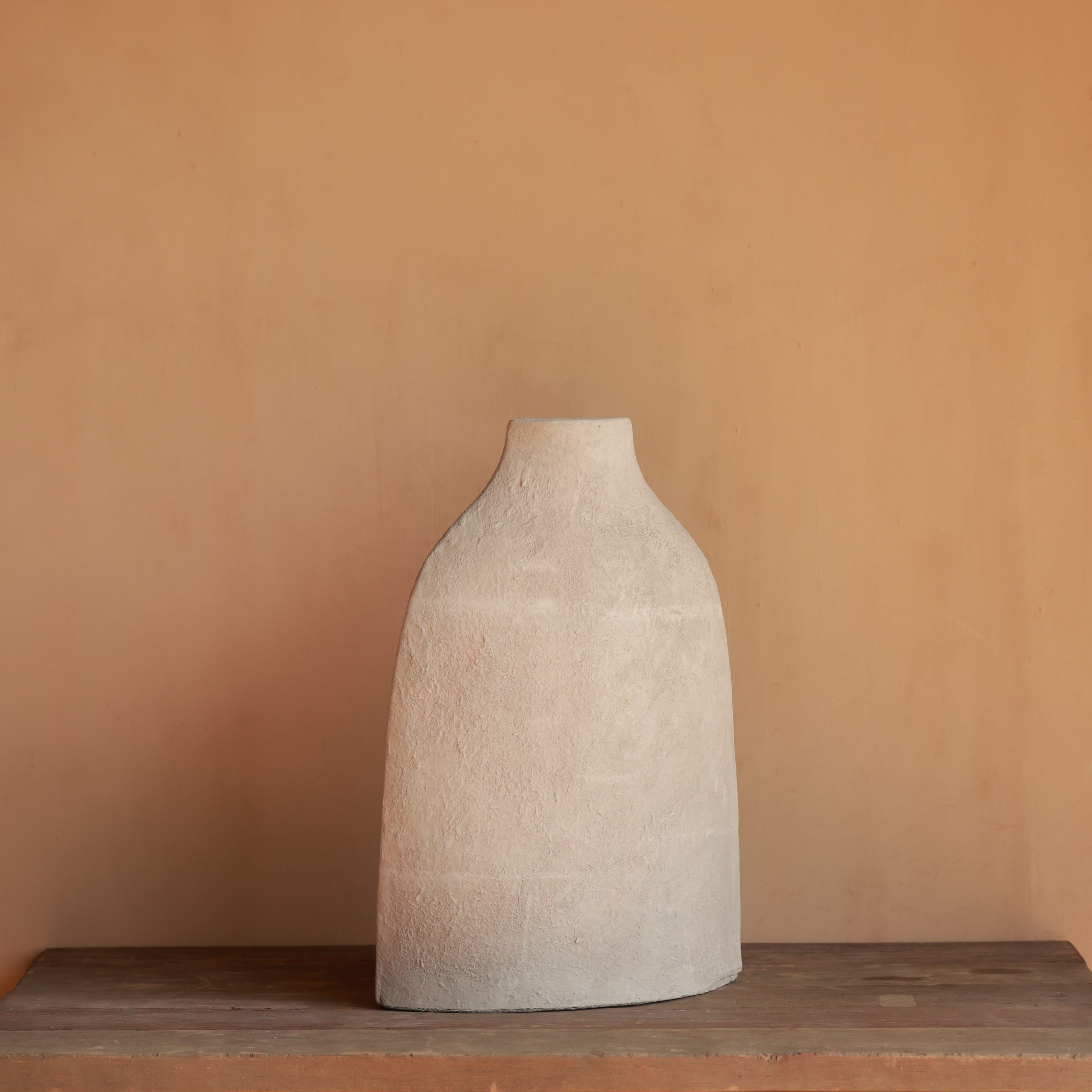 With its asymmetrical shape and raw, textured surface, this clay pot is a true artistic statement. The soft, neutral tone enhances its modern yet organic appeal. Perfect for contemporary interiors seeking a touch of handcrafted charm.