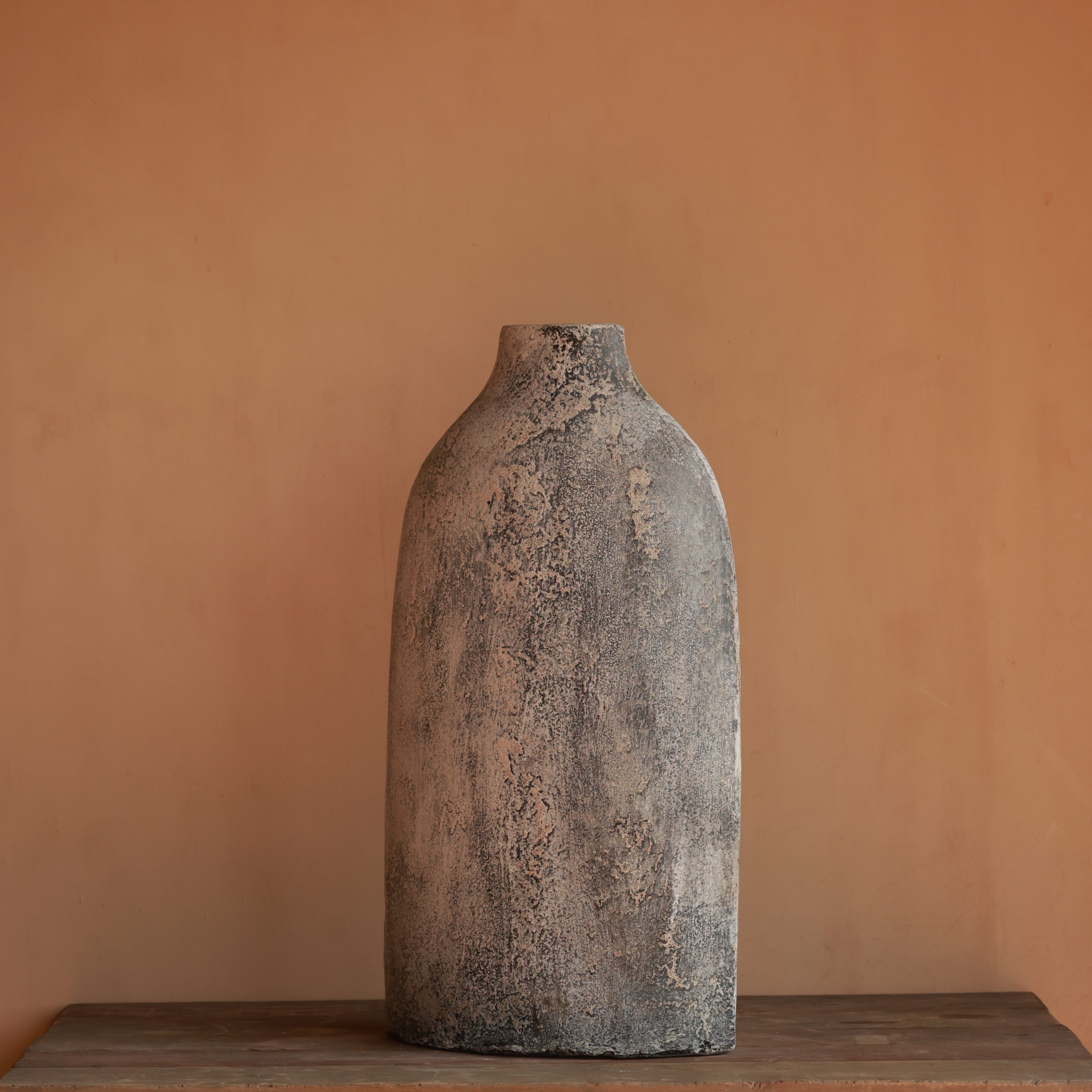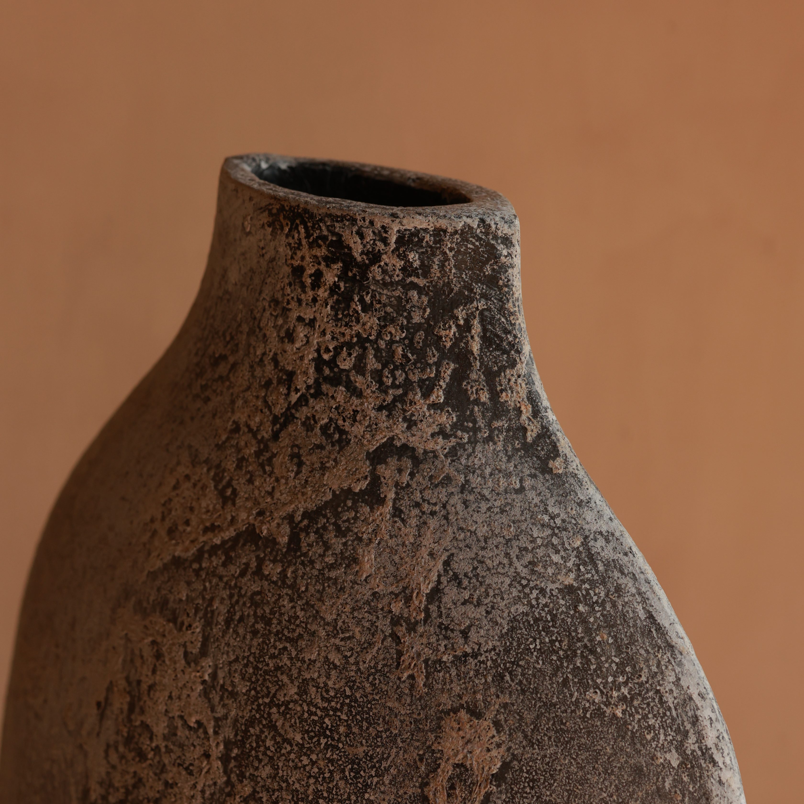This sculptural vase features a raw, textured surface with an aged, distressed finish. Its asymmetrical curves and earthy tones create a striking yet natural presence. A statement piece for modern, rustic, or wabi-sabi interiors.