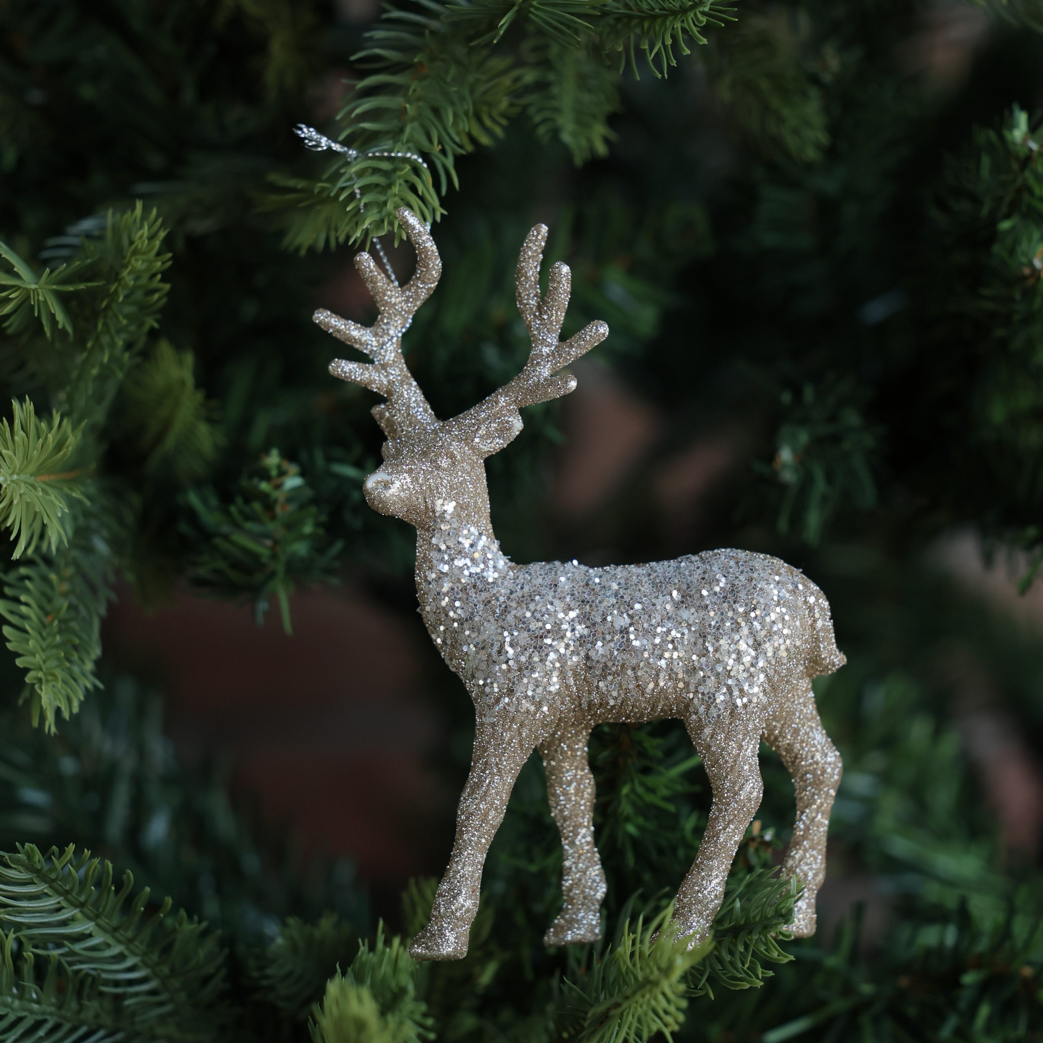 Celebrate the beauty and majesty of the season with the Standing Reindeer Ornament Set, a pair of finely crafted reindeer designed to embody the serene spirit of Christmas. Each piece features a stately pose with delicately sculpted antlers and a body adorned in a lustrous gold glitter finish that captures light beautifully from every angle. The intricate texture and refined detailing lend these ornaments a timeless sophistication, while their compact size makes them ideal for both tree decor and smaller festive arrangements. Whether nestled among greenery, placed on a mantel, or used as accents in a centerpiece, these standing reindeer bring a warm, golden radiance and a sense of holiday luxury to any space.