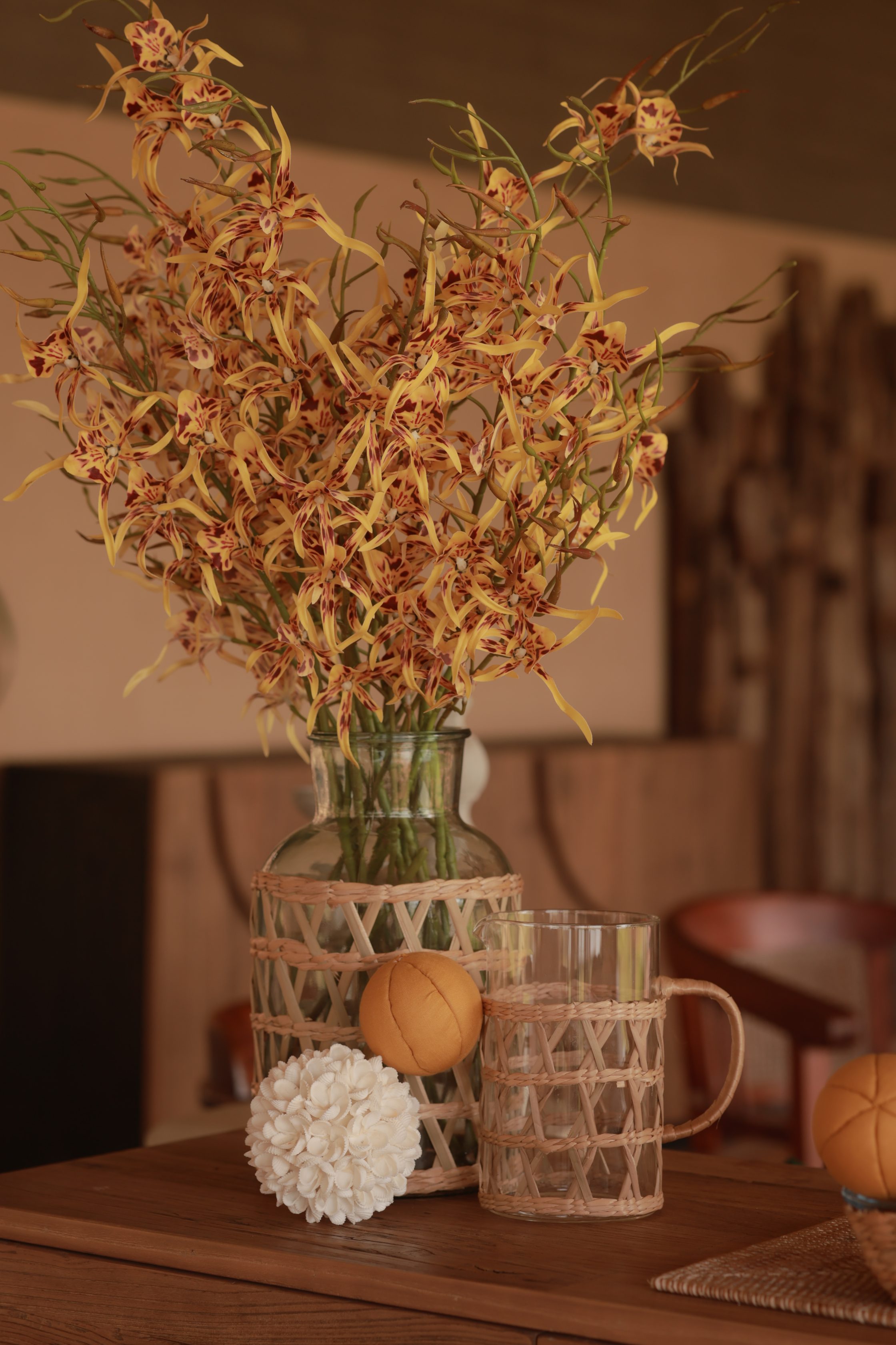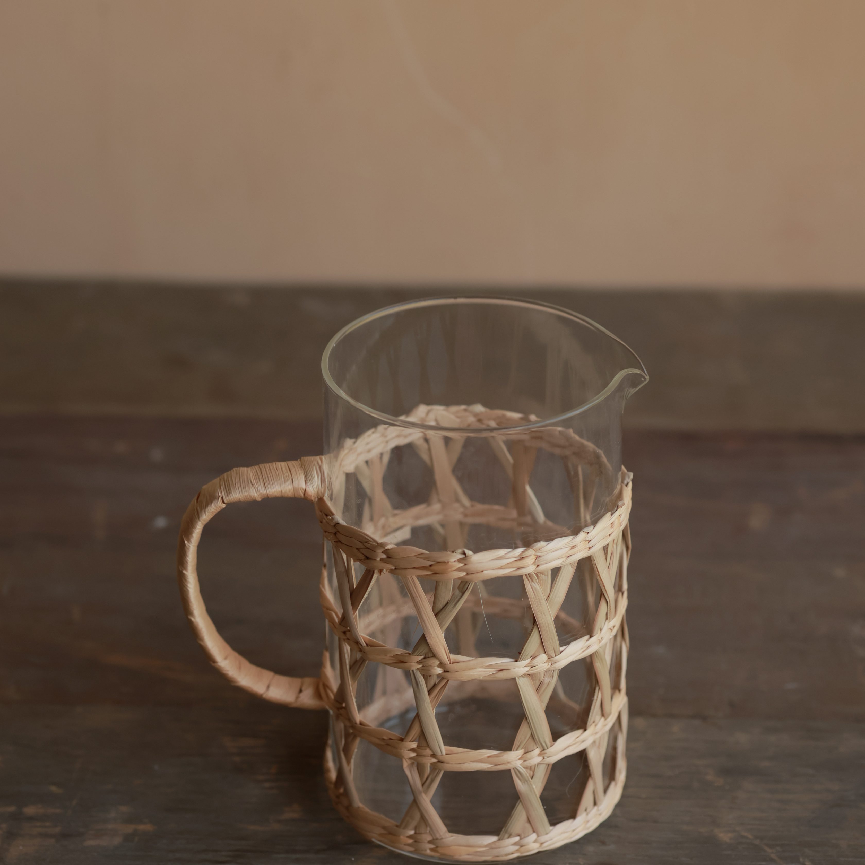 Serve your beverages in style with this handwoven rattan-wrapped glass pitcher, a perfect blend of natural charm and modern functionality. Featuring a durable glass body encased in a handwoven rattan lattice design, this pitcher is ideal for serving water, juice, cocktails, or iced tea while adding a boho, farmhouse, or coastal touch to your table setting.