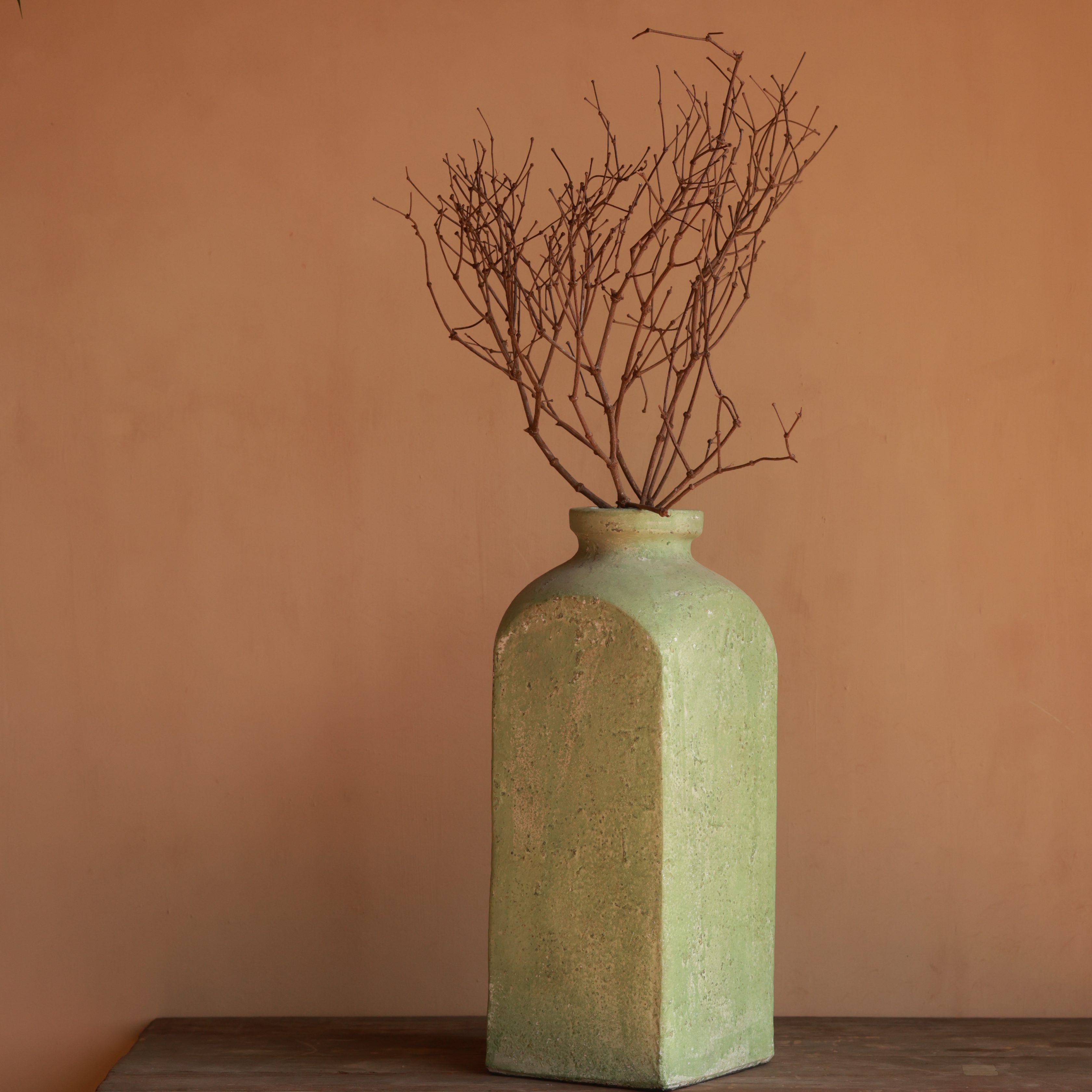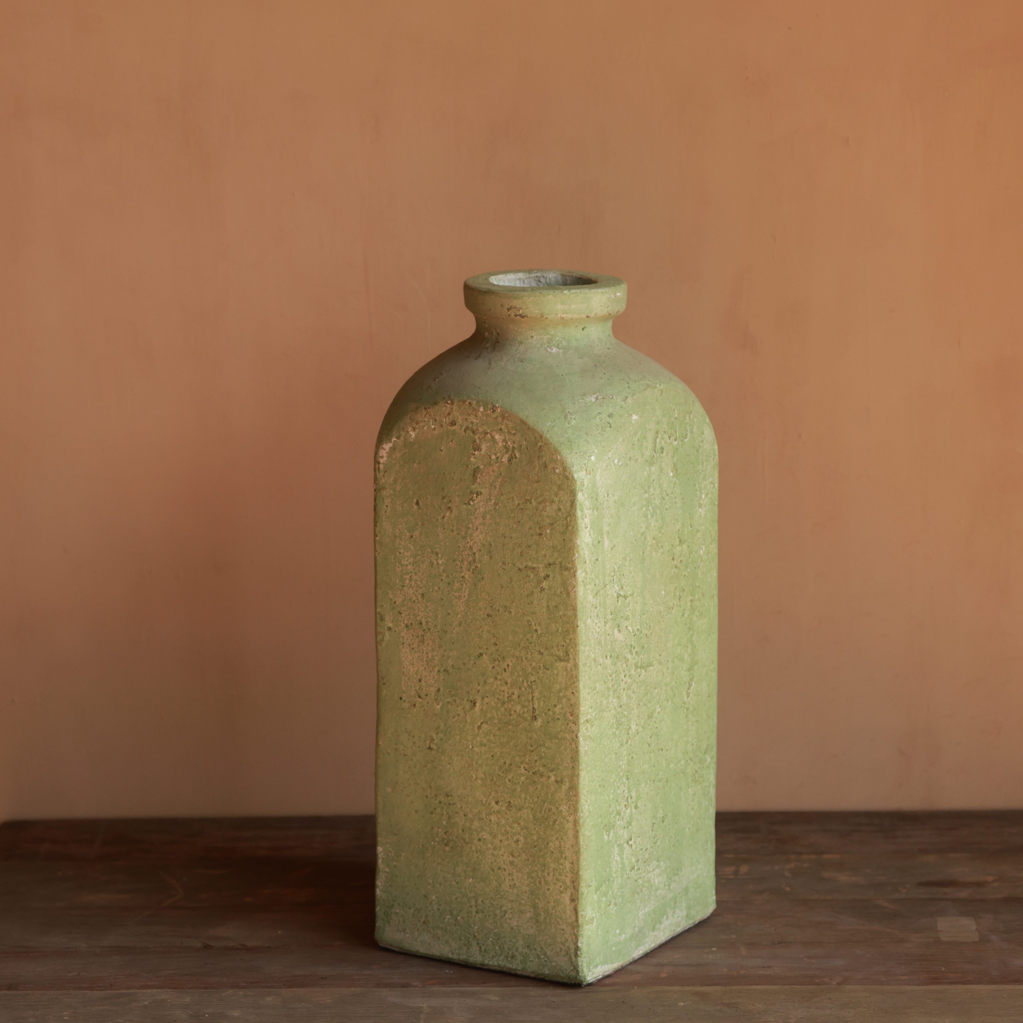 This structured clay vase features a soft green patina with a subtly textured finish. Its clean, rectangular form is complemented by a gently curved neck for a balanced look. A perfect blend of contemporary and earthy aesthetics.