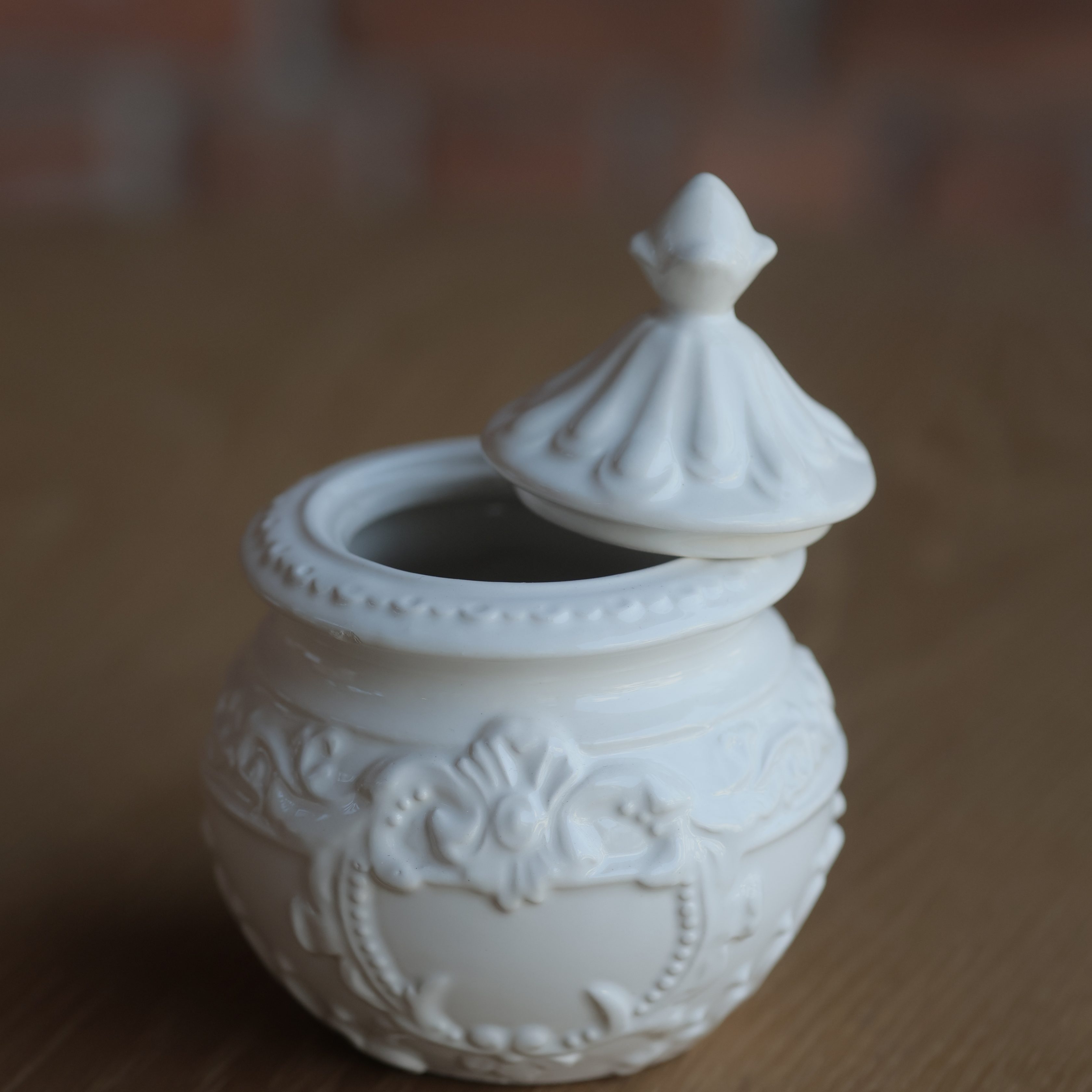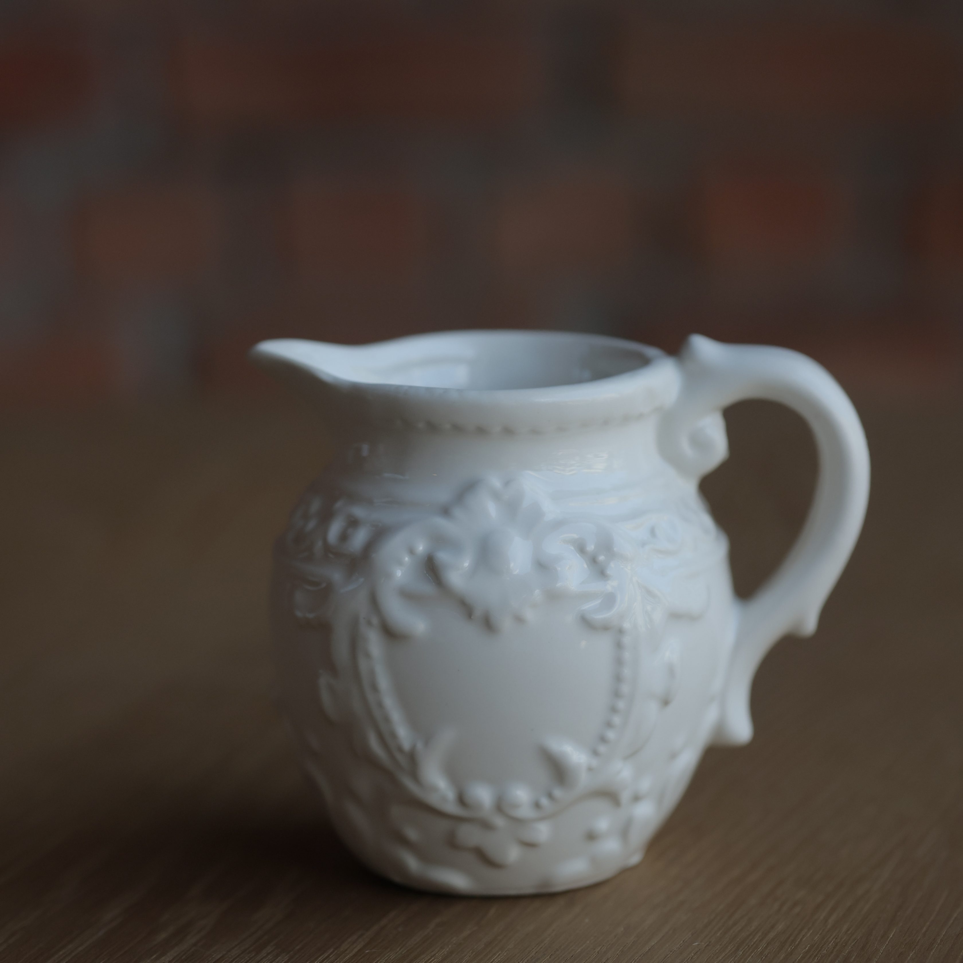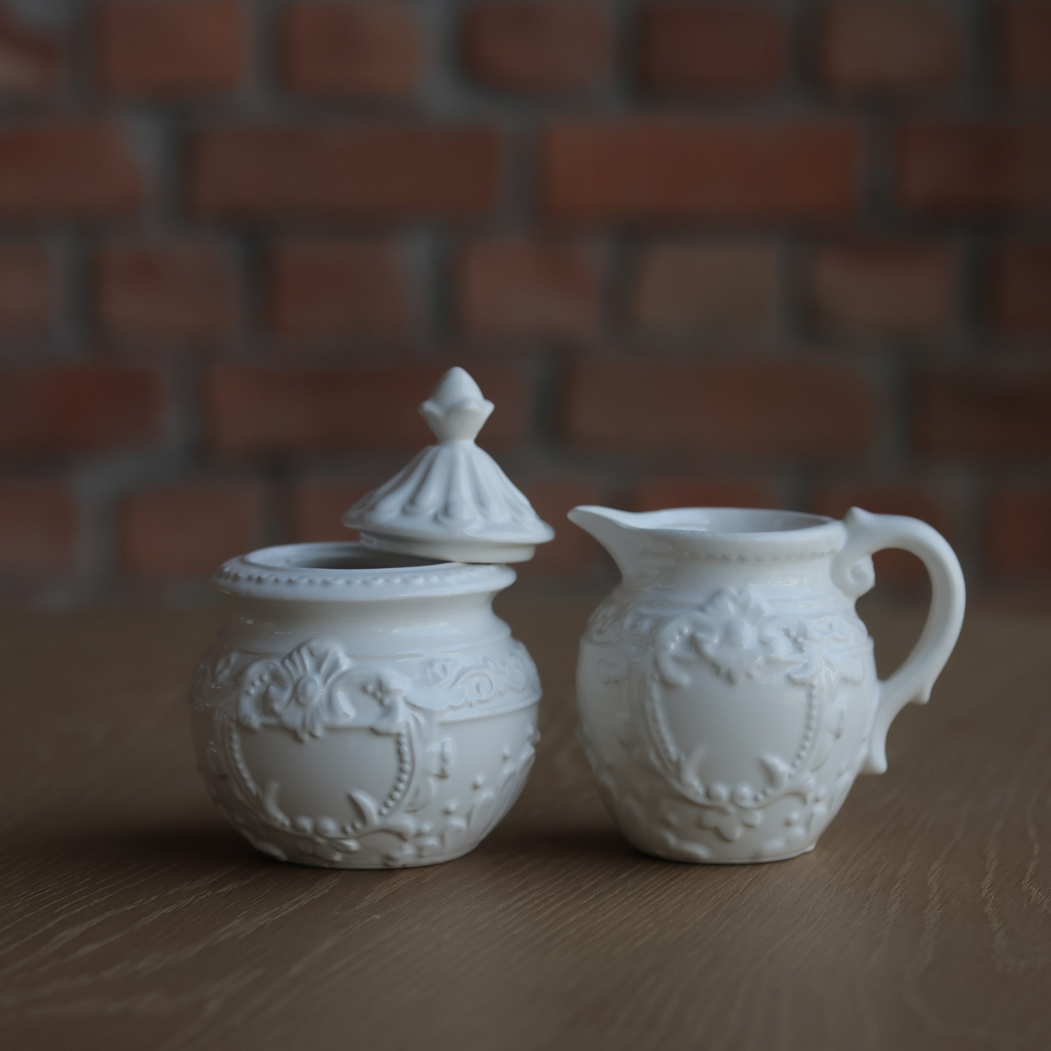 Elevate your tea or coffee service with our Vintage Charm Set. Featuring intricate embossed detailing and a graceful ivory finish, this ceramic duo brings timeless elegance to your table. The creamer’s curved spout ensures an easy pour, while the lidded sugar pot keeps sweetness close at hand. Whether for everyday rituals or festive gatherings, this set adds a touch of vintage sophistication to your serveware collection.