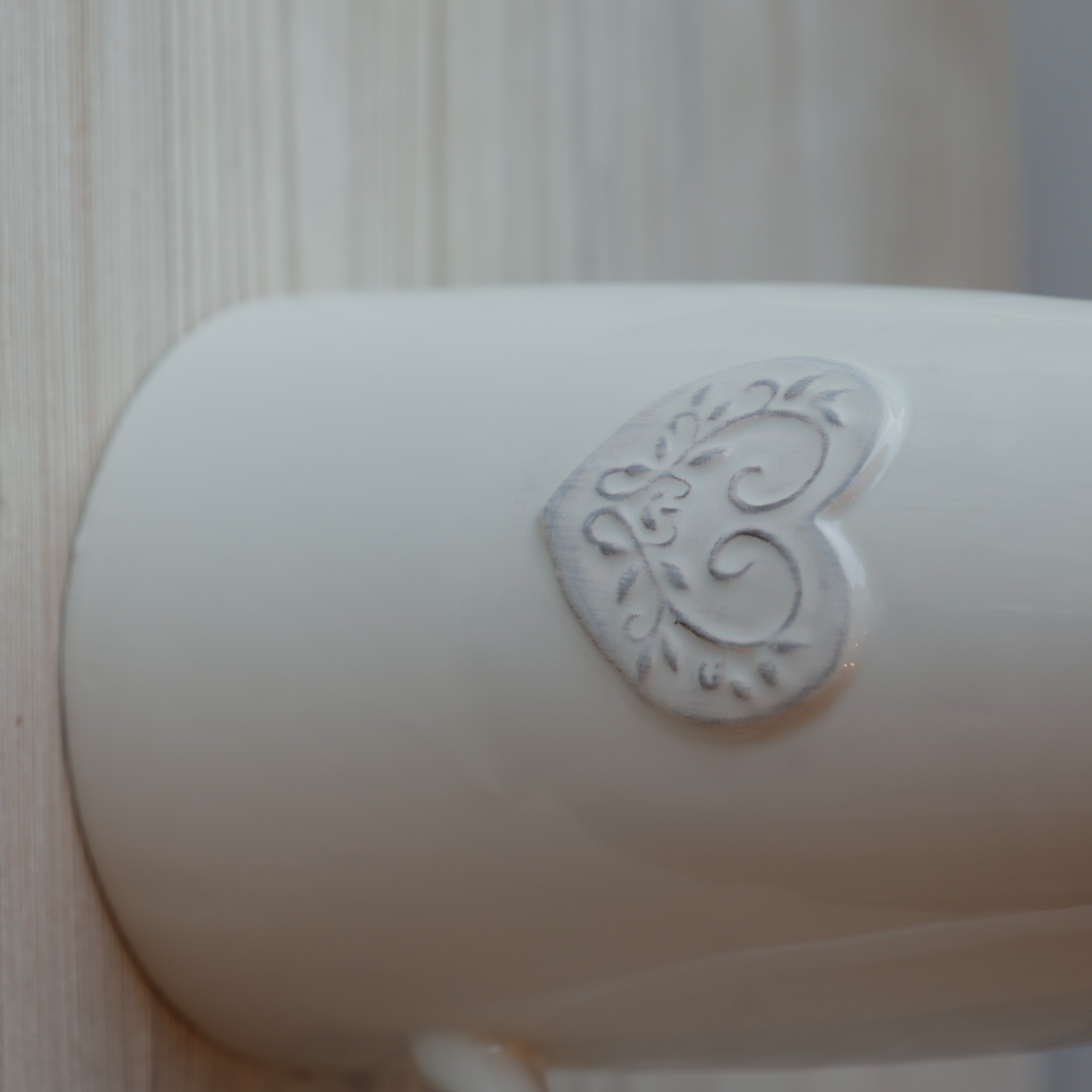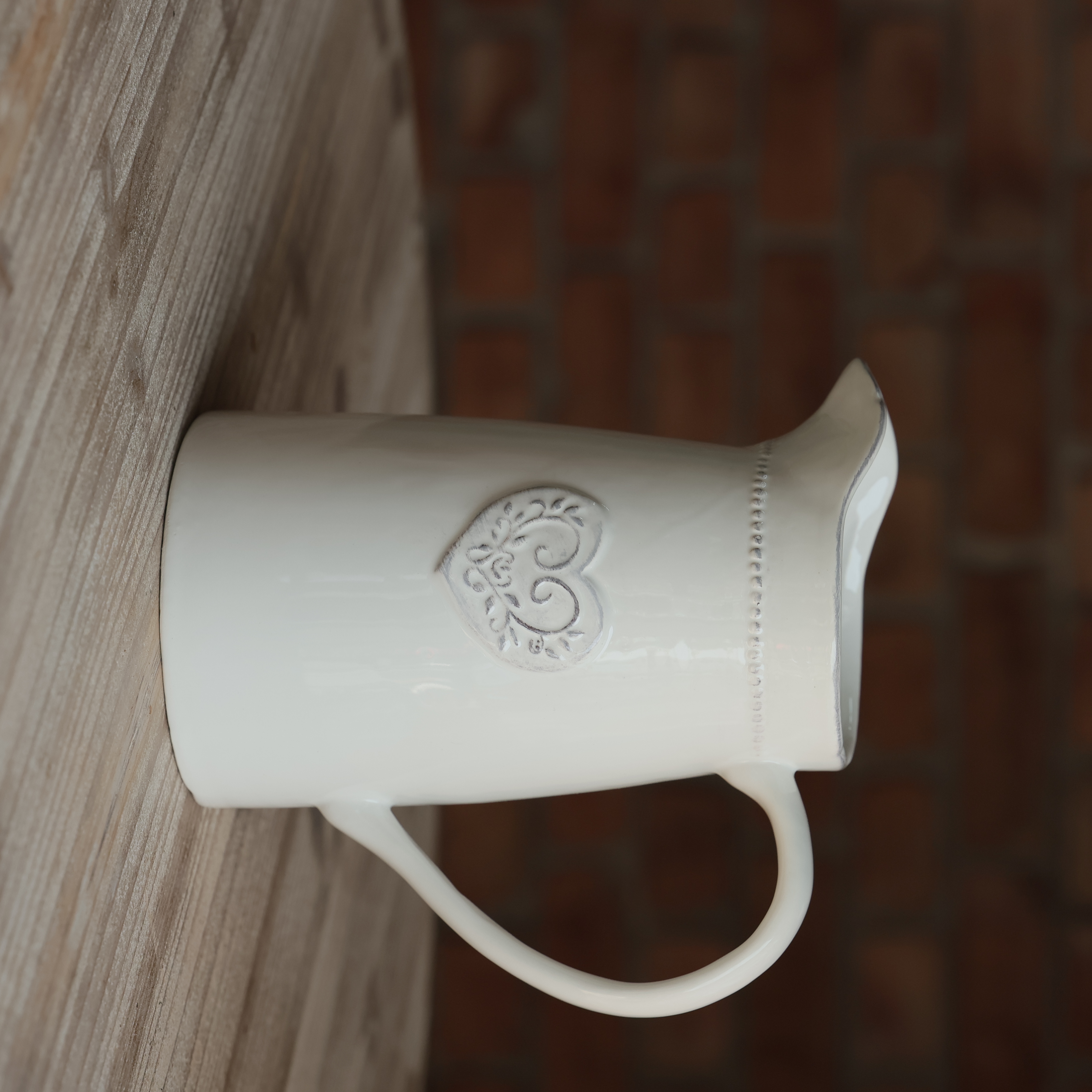 A charming white ceramic pitcher featuring a smooth, minimalist form accented by a subtle embossed heart motif at the center. The gently curved spout, delicate beaded detailing near the rim, and elegant handle give it a soft, vintage-inspired appeal. Perfect for serving or as a decorative accent piece in a cozy, rustic setting.