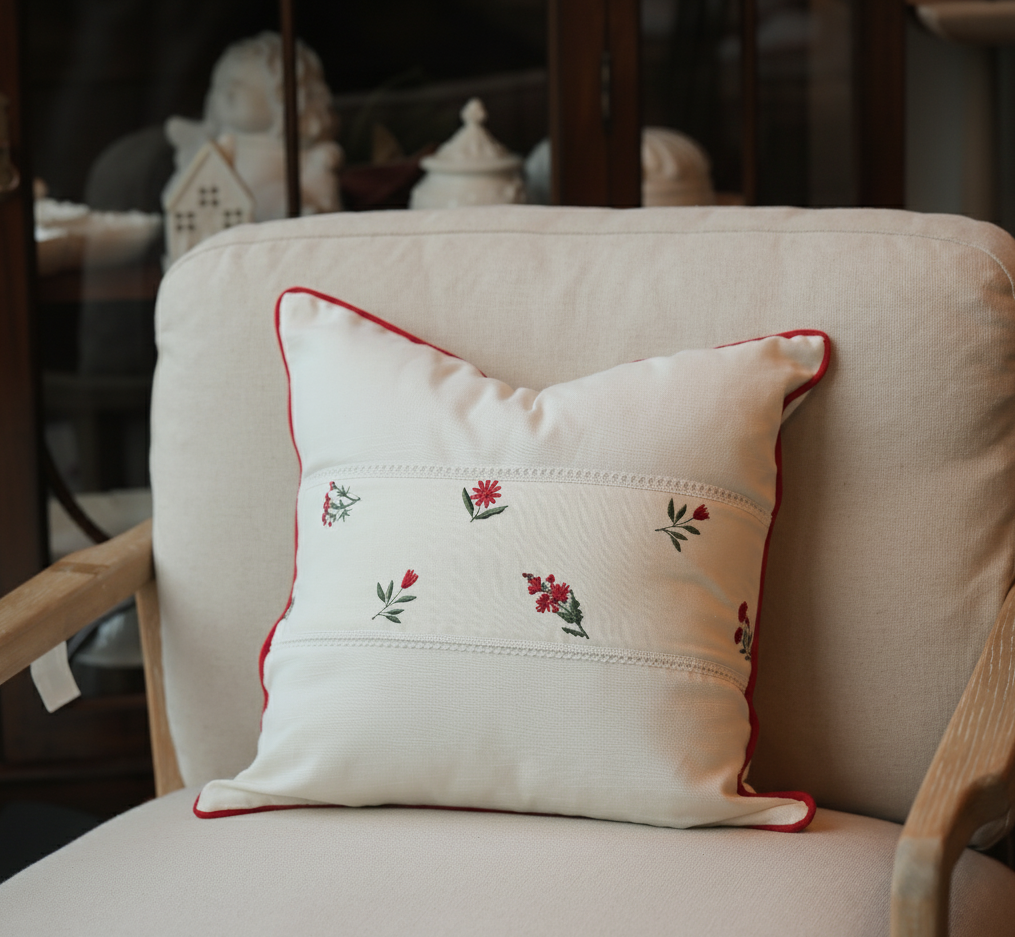 Timeless and elegant, the Vintage Rose Cushion Cover brings the delicate beauty of blooming florals into your living space. Featuring a classic rose pattern in shades of crimson, blush, and soft cream with touches of green foliage, this design captures the romantic charm of vintage textiles while maintaining a fresh, graceful appeal. Set against a pristine white backdrop, the floral detailing adds sophistication without overpowering the space, perfect for those who appreciate subtle elegance. The intricate lace trim bordering the floral band adds a hint of nostalgic craftsmanship, reminiscent of heirloom linens. Ideal for living rooms, bedrooms, or sunlit nooks, the Vintage Rose Cushion Cover complements both traditional and contemporary décor, effortlessly enhancing your space with warmth and charm.